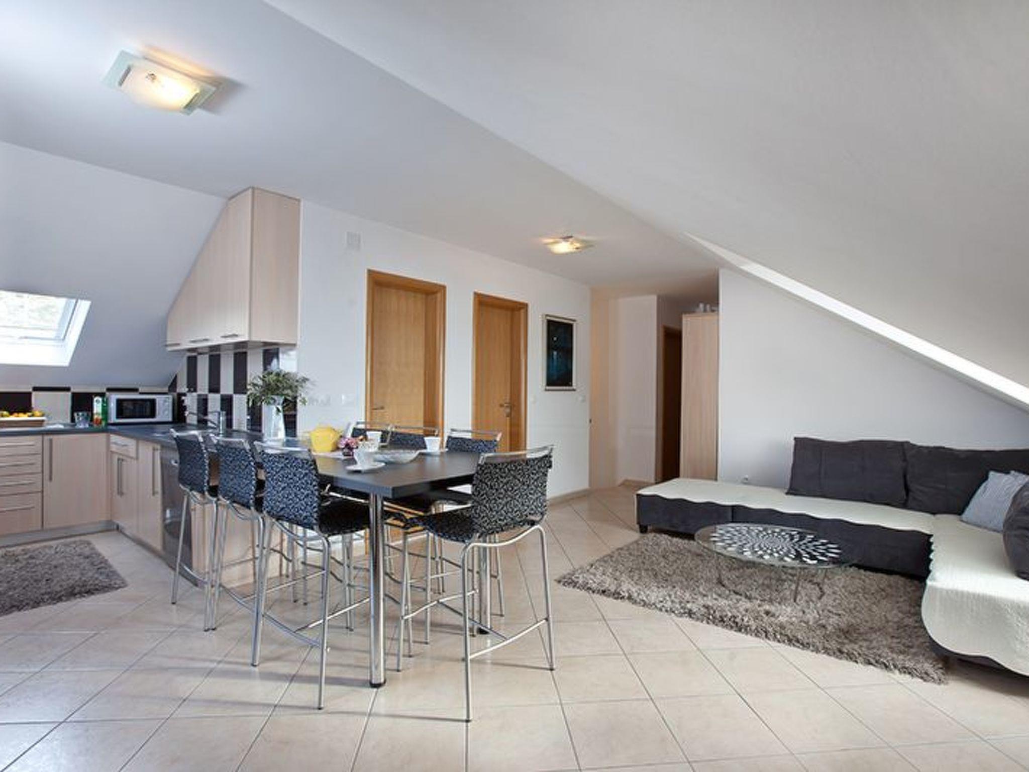 The apartment has 100m2 Is intended for 4 people and consist of 2 bed rooms with double bed, 2 bathrooms ( on with shower other only toilet ), open space living room and kitchen ( dish washer, owen, hob, coffe-machine, microwave, large frigo ) large balcony with table and chairs and sea view , air-condition,washing machine, SAT TV. outside grill.