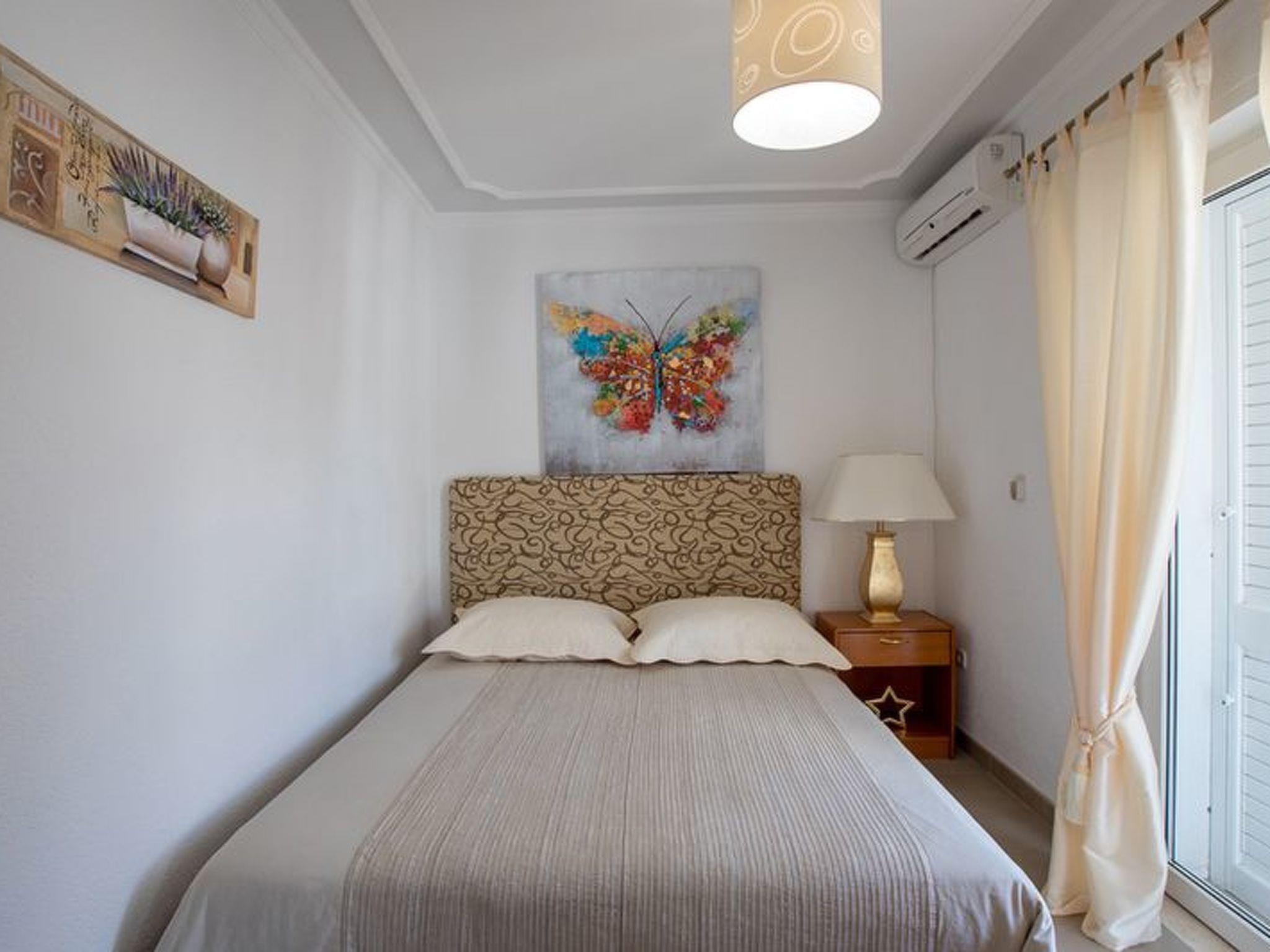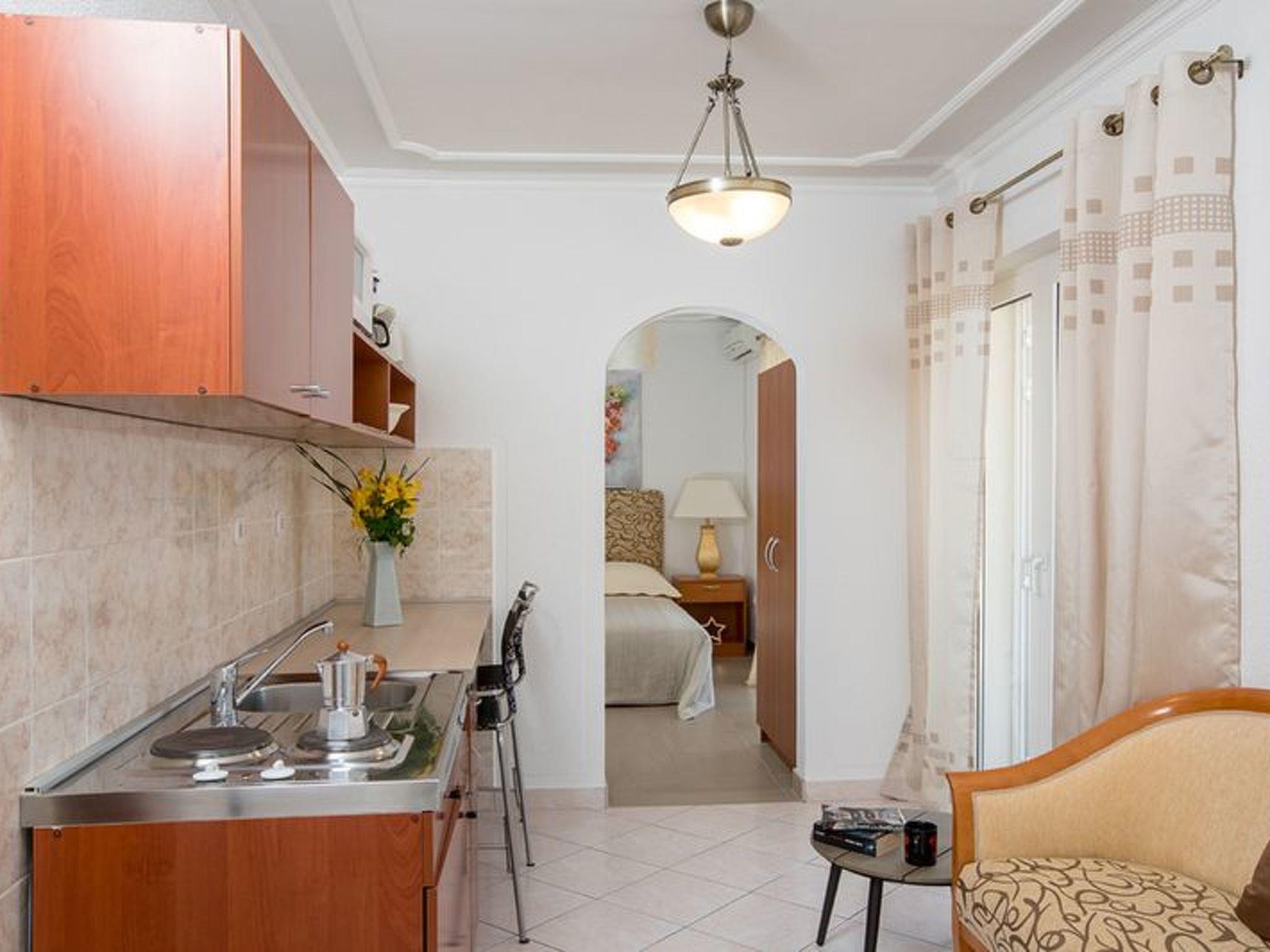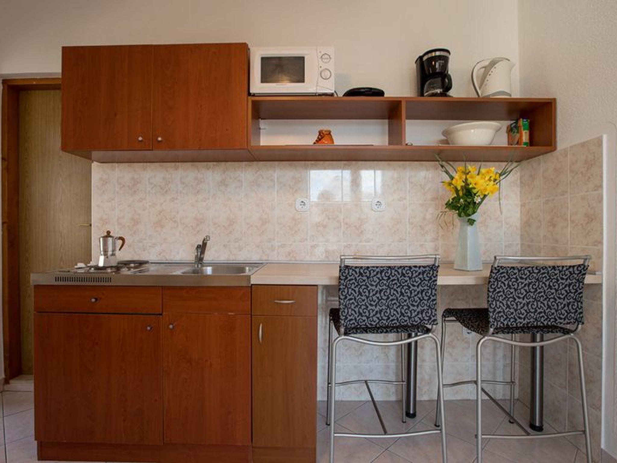 The apartment has 25m2 Is intended for 2 people ( + 1 child possible ) and consist of 1 bed room with double bed in open space living room with sofa bed and small kitchen corner,hob, fridge, kettle, microwave, 1 bathroom with shower , balcony 12m2 with table and chairs ( divided and shared with apartment B ), and shaded terrace with sun chairs, air-condition, SAT TV. Outside grill.