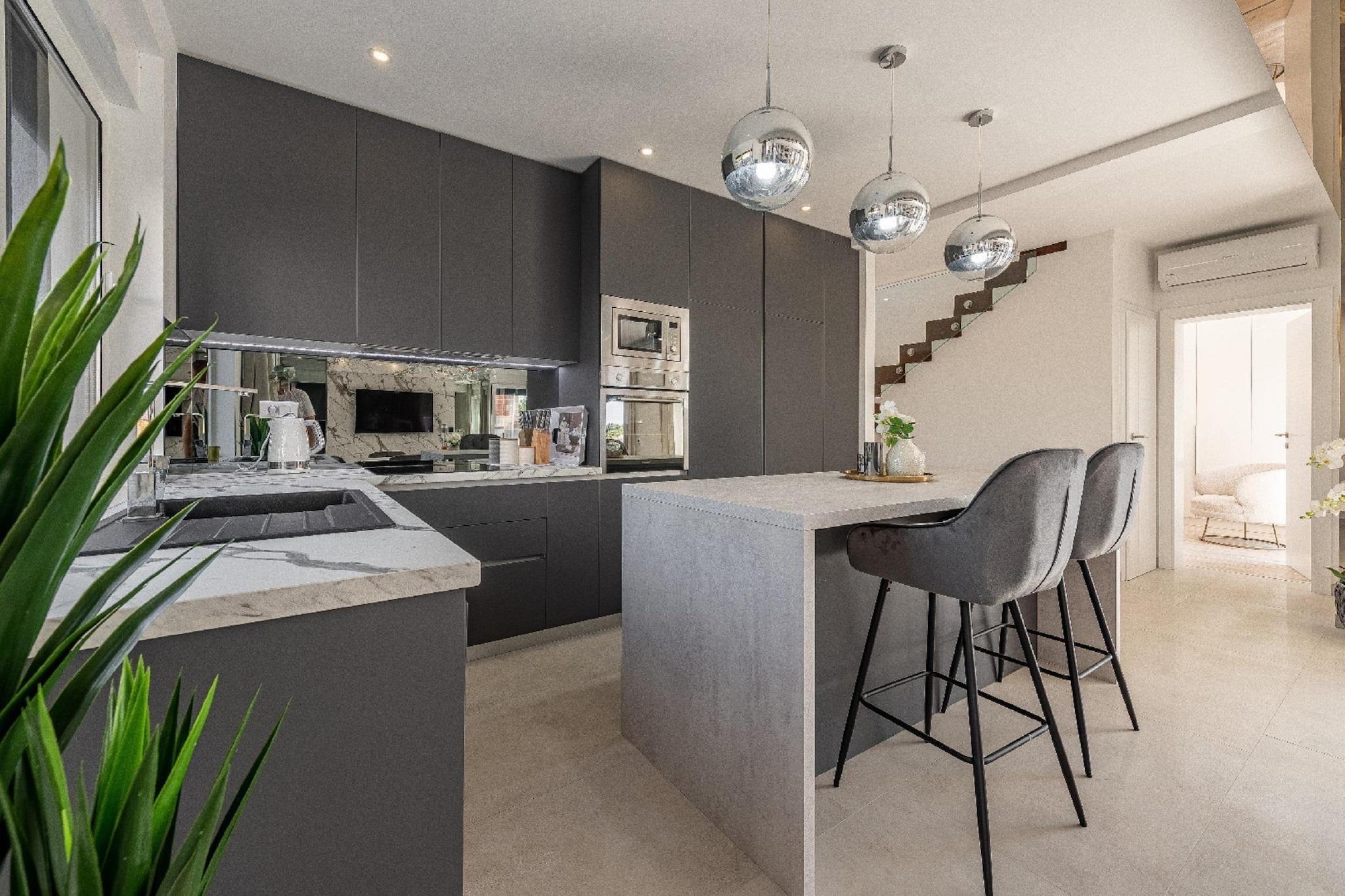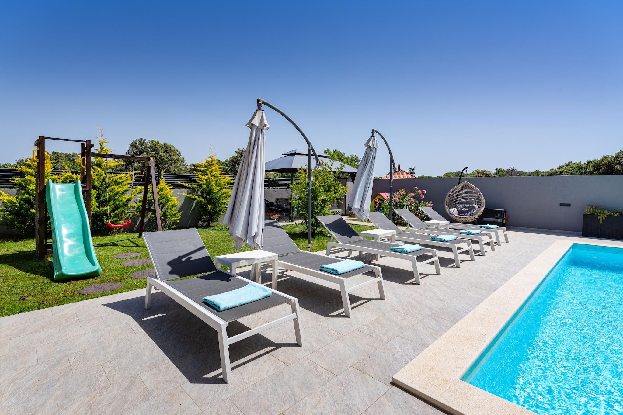 Velkommen til dit private tilflugtssted, en rummelig villa designet til komfort, afslapning og uforglemmelige øjeblikke med familie eller venner. Fordelt over to etager tilbyder dette hjem alt, hvad du behøver for en ubekymret ferie. I stueetagen inviterer den lyse stue dig til at slappe af med en stor sofa, satellit-tv og spiseplads, der løber ud i det fuldt udstyrede køkken. Uanset om det er frisk morgenkaffe, en hurtig snack eller en familiefest, finder du alt fra opvaskemaskine til ovn, mikrobølgeovn og brødrister klar til dig. Soveværelset på denne etage har eget badeværelse, aircondition og adgang til terrasse, hvilket skaber et hyggeligt og privat hjørne af huset. Ovenpå er der tre yderligere soveværelser, hver med eget badeværelse, der giver masser af plads til alle. To dobbeltværelser og et soveværelse med to enkeltsenge er omhyggeligt møbleret med fladskærms-tv, aircondition og moderne brusere. En balkon tilføjer endnu et sted at nyde udsigten og solskinnet. Træd udenfor og opdag dit eget paradis: en privat opvarmet swimmingpool (8x3m), omgivet af liggestole og et loungesæt til dovne eftermiddage. En skyggefuld terrasse, grillplads og udendørs spiseplads gør den perfekt til aftener under stjernerne. Børnene vil elske trampolinen, legeredskaberne og bordtennisbordet, mens haven og gårdhaven tilbyder rolige, grønne hjørner til afslapning. Med privat parkering, aircondition overalt og betænksomme ekstrafunktioner som en højstol, barneseng, strygejern og endda en udendørs bruser kombinerer denne villa luksus med hjemmets komfort. Uanset om det er sjov familietid eller fredelig afslapning, har denne villa det hele.