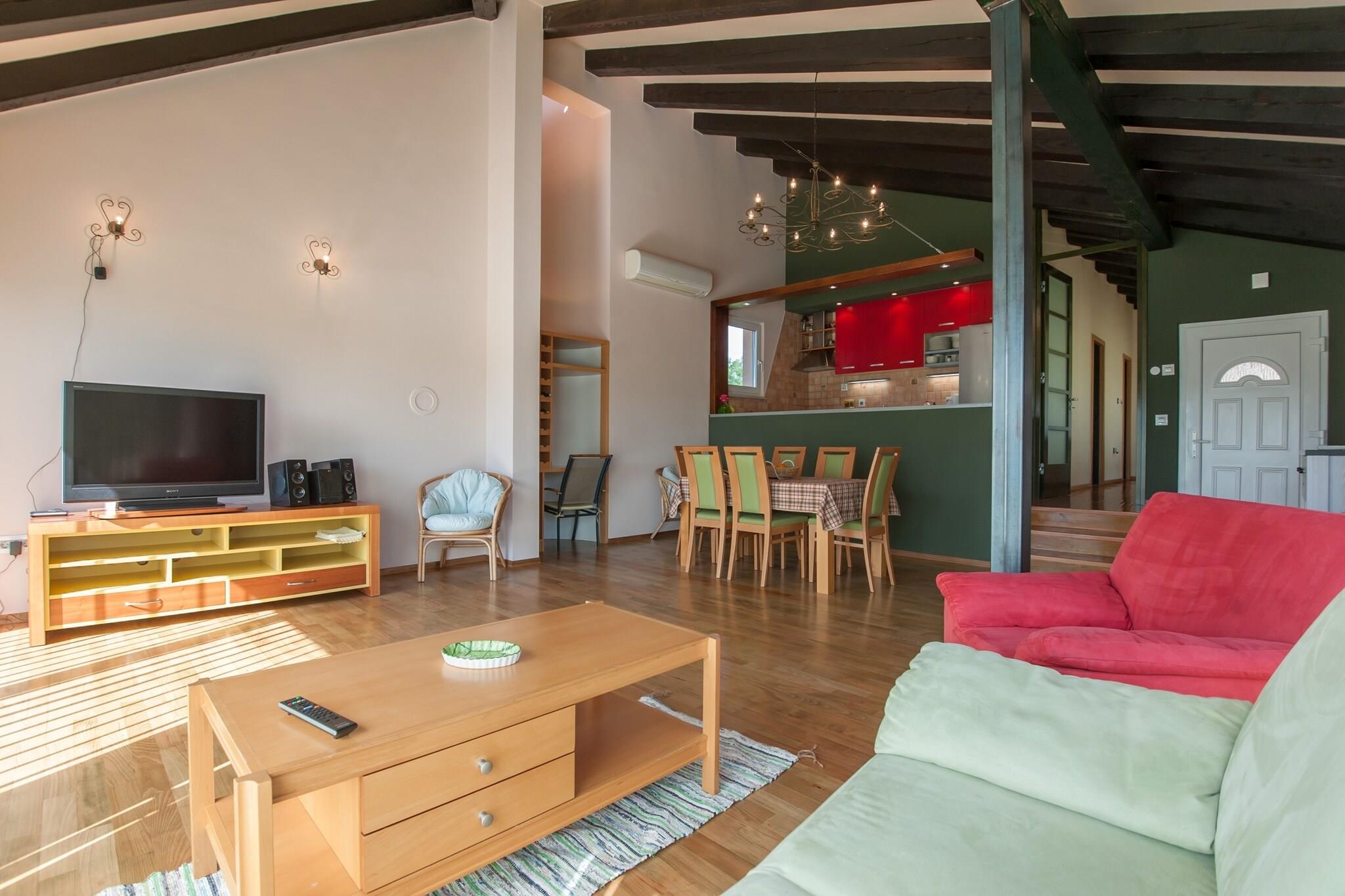 Dette feriehus til seks gæster er omgivet af frodige grønne områder og tilbyder et fredeligt tilflugtssted kun 800 meter fra havet i Zaton. Med gratis WiFi, en privat indhegnet have og en solrig terrasse kan gæsterne nyde både afslapning og bekvemmelighed. Huset ligger 2 km fra byens centrum, med restauranter kun 50 meter væk og almindelige forsyninger inden for 200 meter, hvilket sikrer nem adgang til de vigtigste fornødenheder. Moderne faciliteter og udendørs sjov Indenfor har ejendommen en hyggelig opholds- og spisestue med fladskærms-tv med satellitkanaler, et fuldt udstyret åbent køkken og to komfortable soveværelser, et med en dobbeltseng og et andet med to enkeltsenge og en hems. Gæsterne kan slappe af på den private overdækkede terrasse, nyde udendørs spisning med grill eller benytte sig af faciliteter som en vaskemaskine, solarium og cykler til at udforske omgivelserne. Fodboldmålet tilføjer et sjovt touch til aktive gæster. Nærliggende attraktioner og spisesteder Udforsk St. Nicholas Kirke, et historisk vartegn med en fantastisk udsigt, eller besøg Bilotinjak Strand, kendt for sit krystalklare vand. Til spisning serverer Konoba Gusar frisk fisk og skaldyr, mens Tavern Arka Restaurant tilbyder autentiske middelhavsretter. Uanset om du søger eventyr eller afslapning, er dette feriehus det perfekte tilflugtssted.