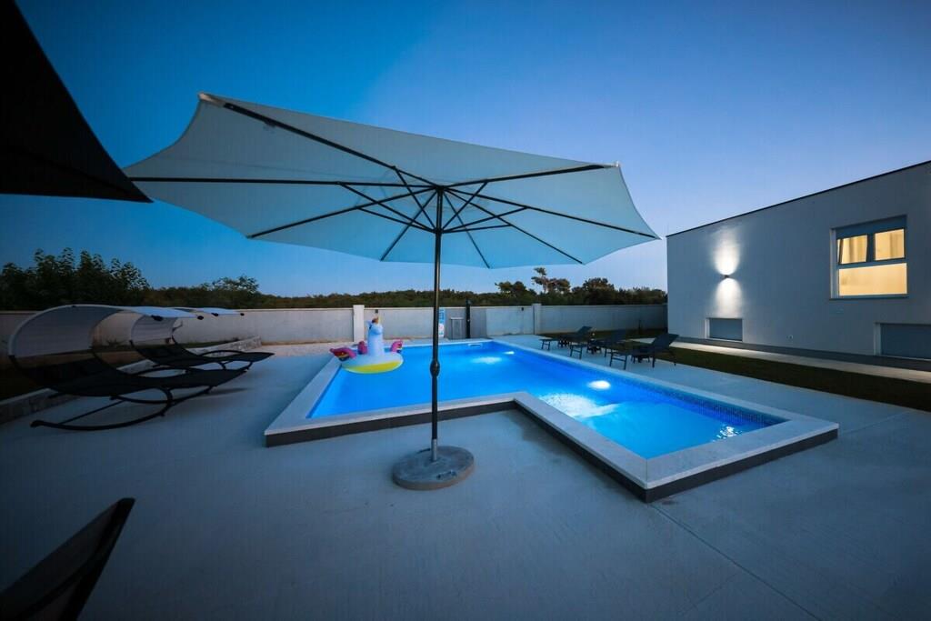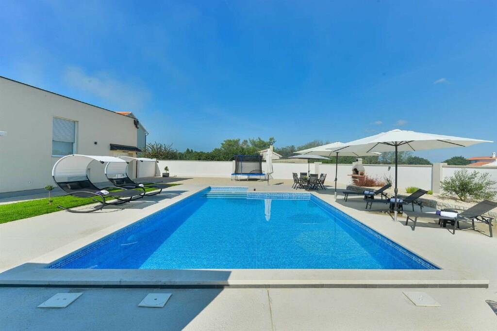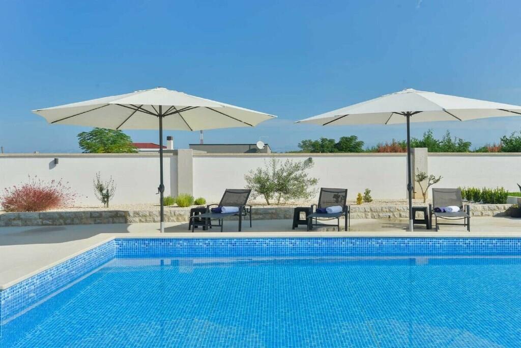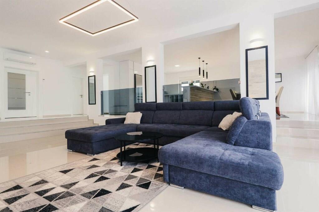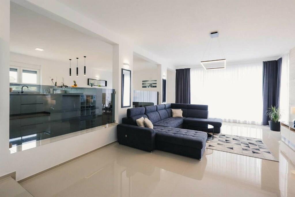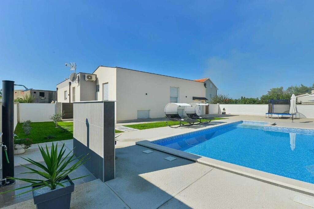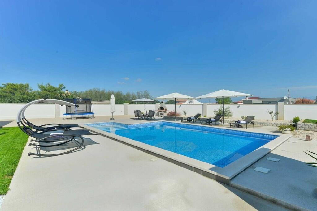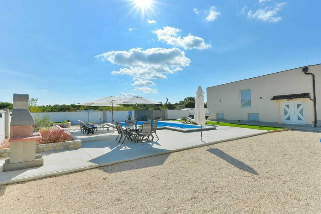 The interior of the house is tastefully and functionally furnished. The ground floor has 3 bedrooms - one bedroom has a double bed, the second bedroom has a single bed that you can turn into a double bed and the third bedroom has two single beds. There is also a spacious and modern living room with a double sofa bed and a fully equipped kitchen. On the ground floor there is a fitness room and a laundry room. Outside the house you can enjoy a nice furnished terrace, a barbecue and a large pool where you can refresh yourself on hot summer days. Prepare your favourite dishes on the grill while your children have fun in the pool.