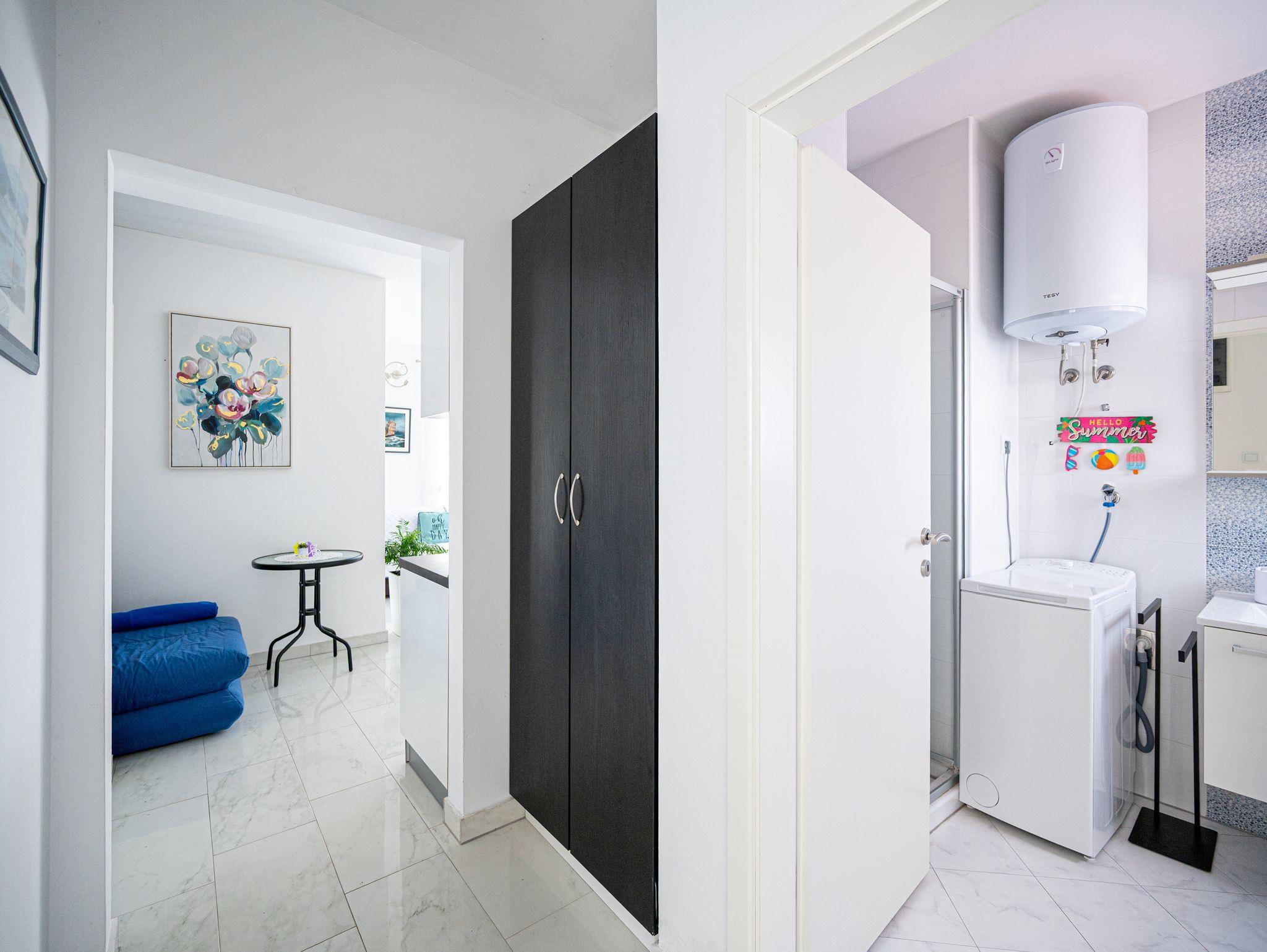 Ferienwohnung bietet Platz für 4 Gäste. Die Betten sind in Schlafzimmern, die es 2 gibt, und in Wohnzimmer, innerhalb einer Gesamtfläche von 37m2, angeordnet. Die Gäste haben eine eigene Terrasse zur Verfügung, auf der sie in warmen Sommernächten genießen können. Es ist erlaubt, Speisen auf dem Gemeinschafts-Grill vorzubereiten. IM PREIS INBEGRIFFEN: Kurtaxe, Endreinigung, Klimatisierung, Parkplatz, Internet, Kinderbett, Bügeleisen, Bügelbrett, Föhn. Die Verfügbarkeit zusätzlicher Dienstleistungen in Ihrem reservierten Termin und die Preise derselben (falls nicht aufgeführt) müssen im Voraus überprüft werden. Zusätzliche Dienstleistungen die in der Zahlungsaufforderung nicht aufgeführt sind werden direkt beim Vermieter bezahlt, angenommen der Gast nutzt auch diese.