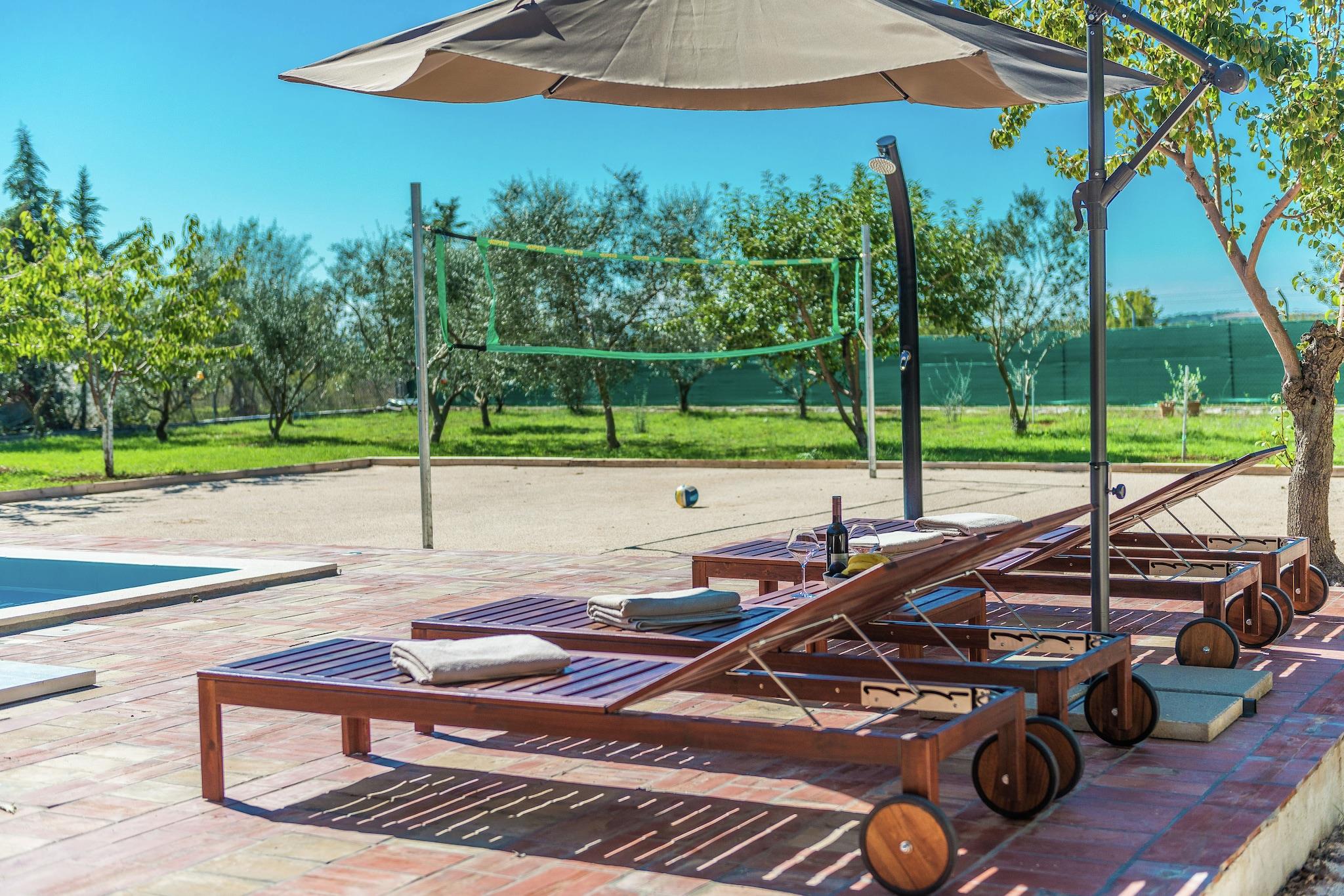 Stueetage: (åbent køkken(komfur(Komfur med fire kogeplader, elektrisk), mikrobølgeovn, køle-fryseskab), stue / spisestue(dobbeltsovesofa, Fjernsyn(fladskærm, parabol), spisebord, balkon eller terrasse, varme(træ), klimaanlæg), soveværelse(enkeltseng, dobbeltseng), soveværelse(enkeltseng, dobbeltseng), badeværelse(bruser, håndvask, toilet, vaskemaskine)) bruser med lysterapi, terrasse(privat, 25 m2), have(privat, indhegnet), havemøbler, grill, parkering, swimmingpool(privat, 5 x 4 m.), petanquebane, sandkasse, legeredskaber