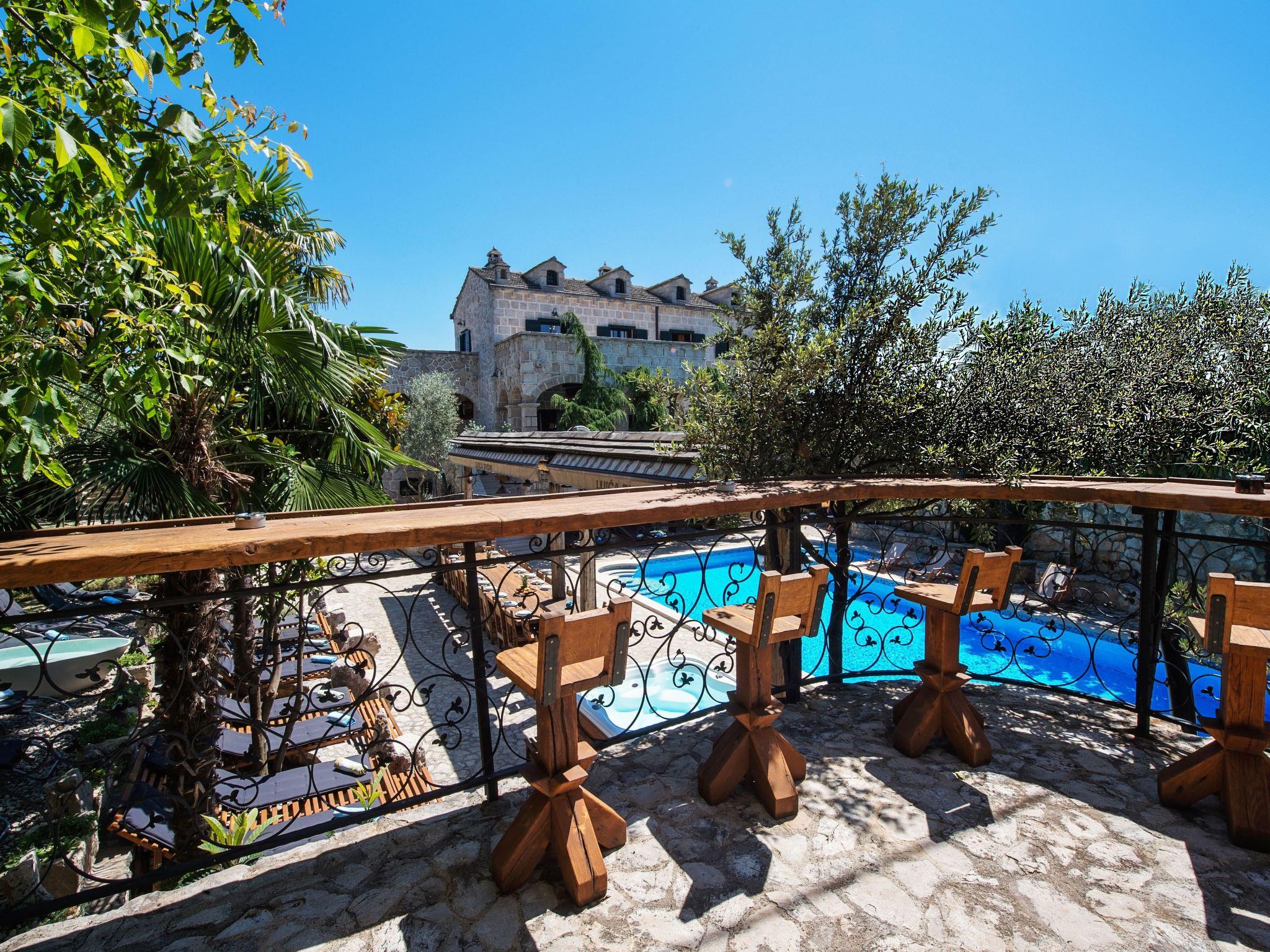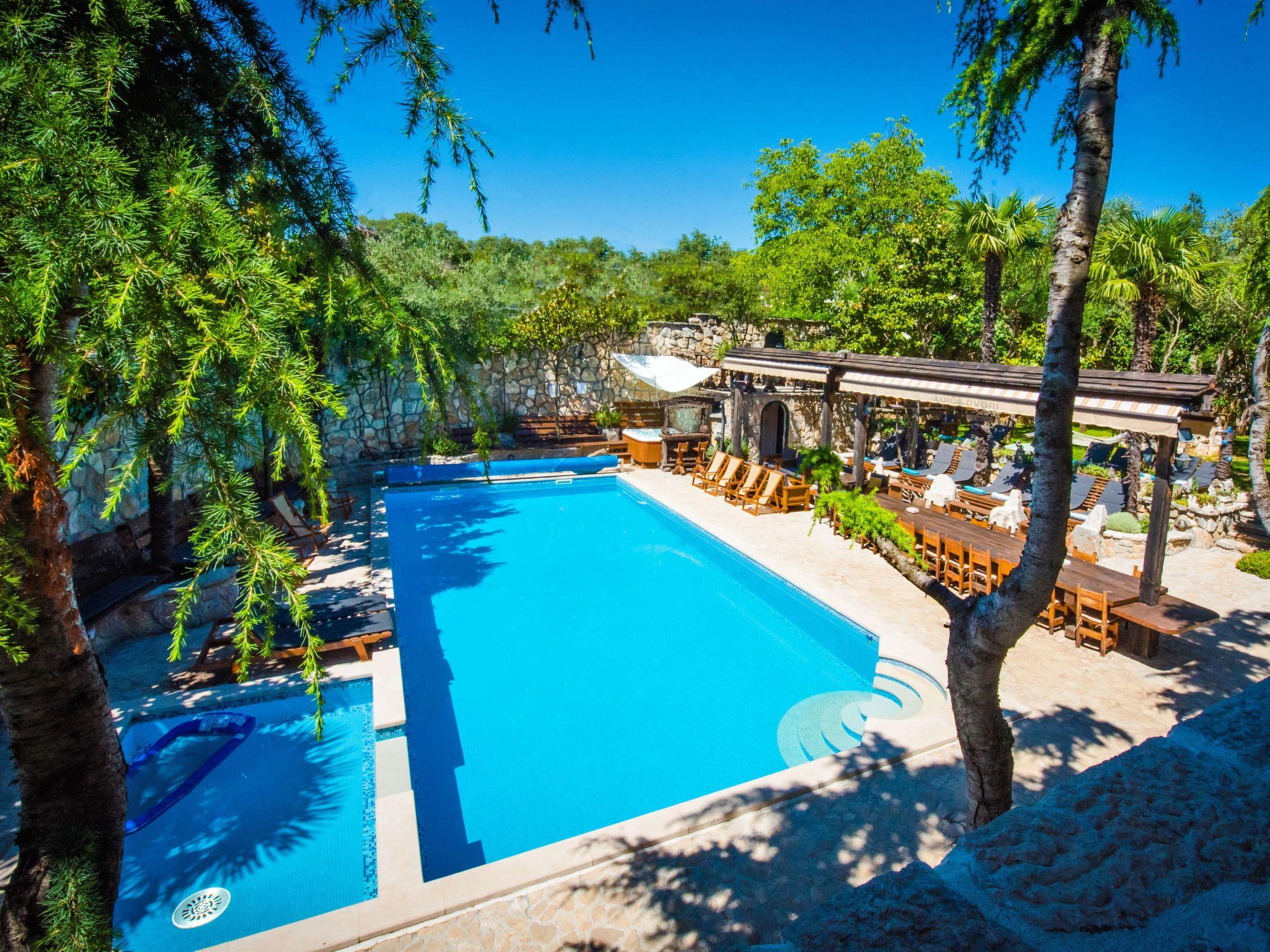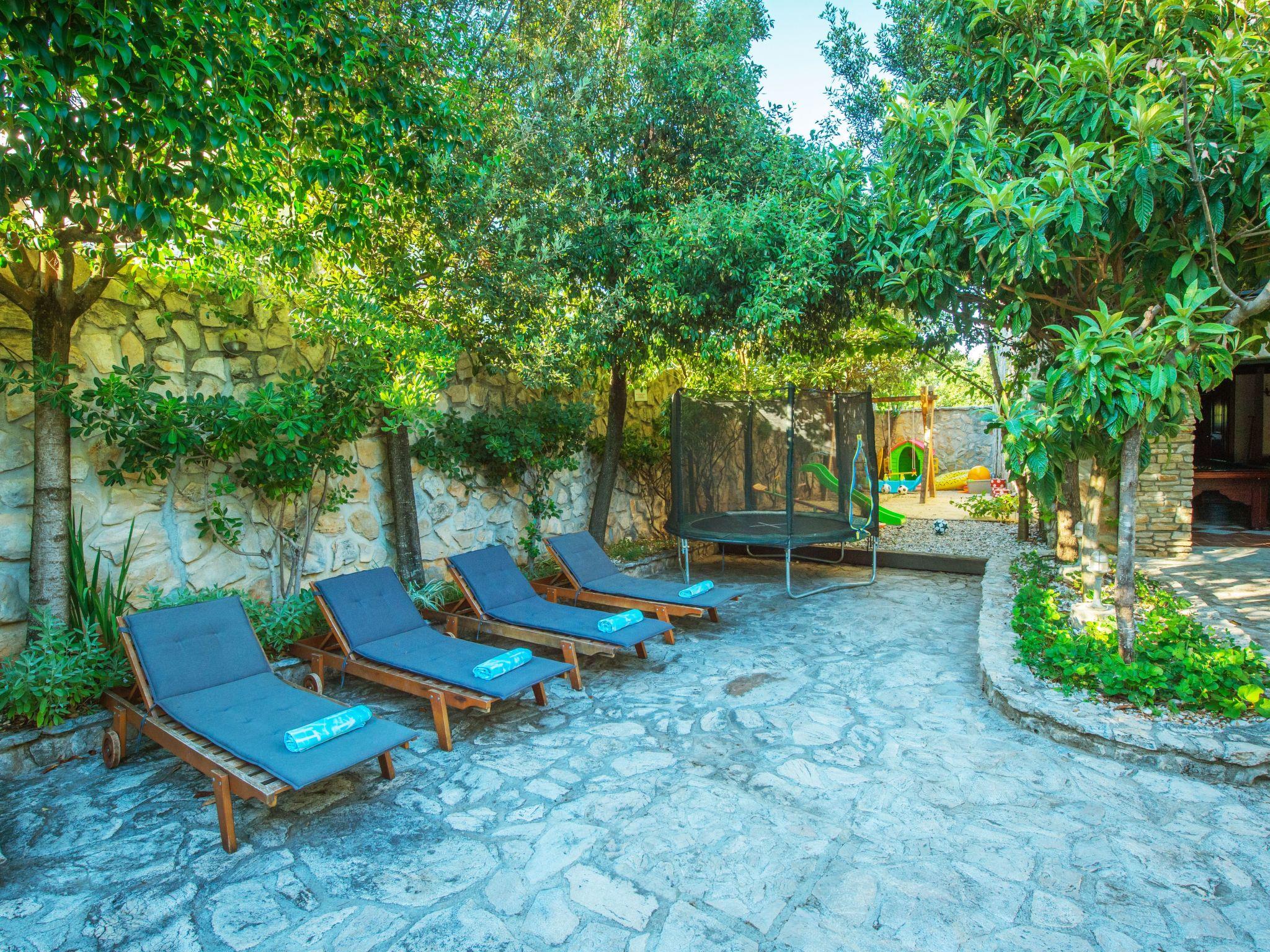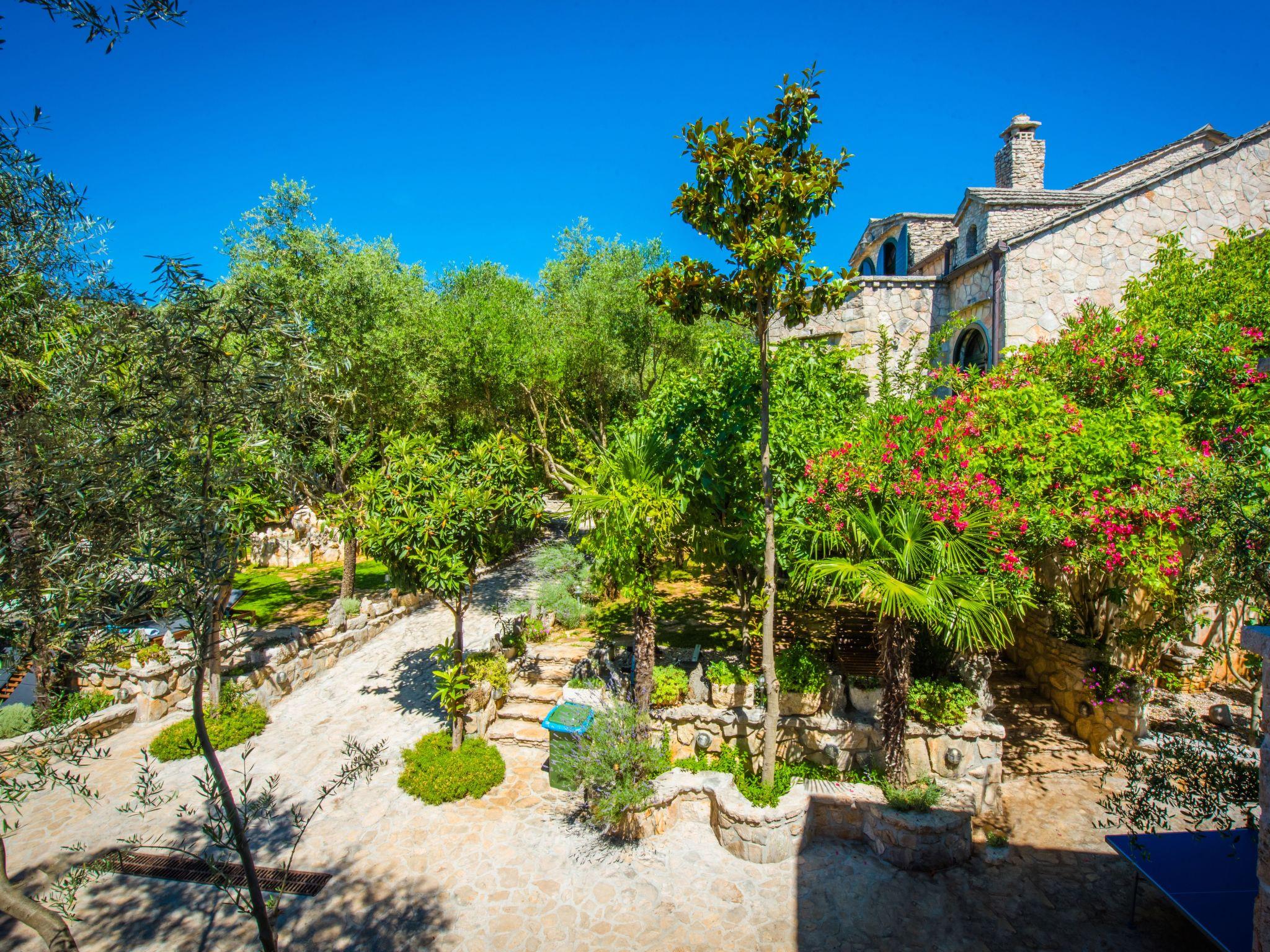 The property includes a large pool of 85m2, of which 9m2 are adapted as a pool for children. On the plot prevails luxurious Mediterranean horticulture with hundreds of years old olive trees, palm trees, magnolias, lavender and so on as well as a multitude of carved stone details such as rare large stone table with chairs for dining with accompanying bar and stone bar stools, barbecue, fountains and sculptures. There are several terraces in the villa where guests can enjoy the view and relax.