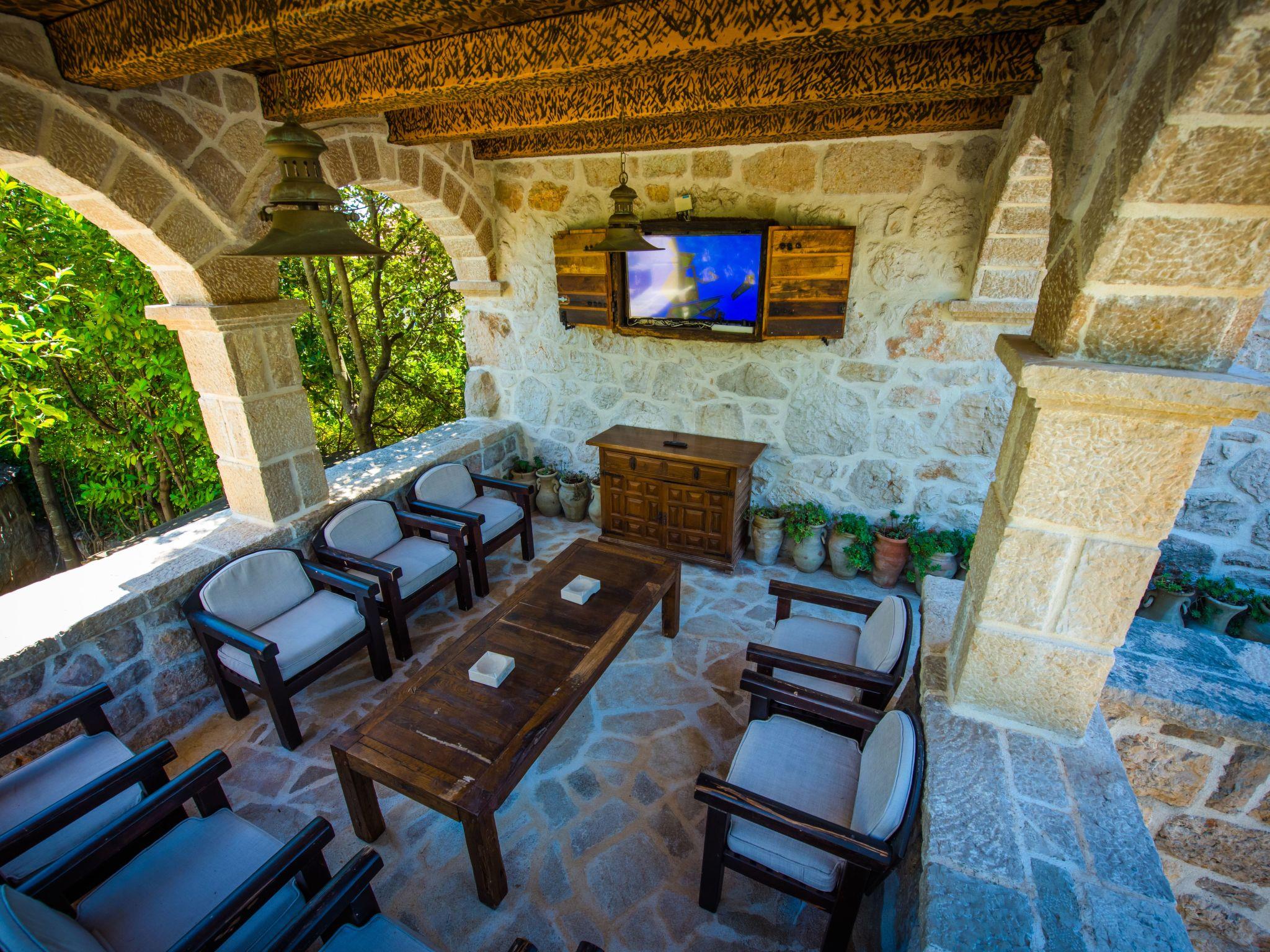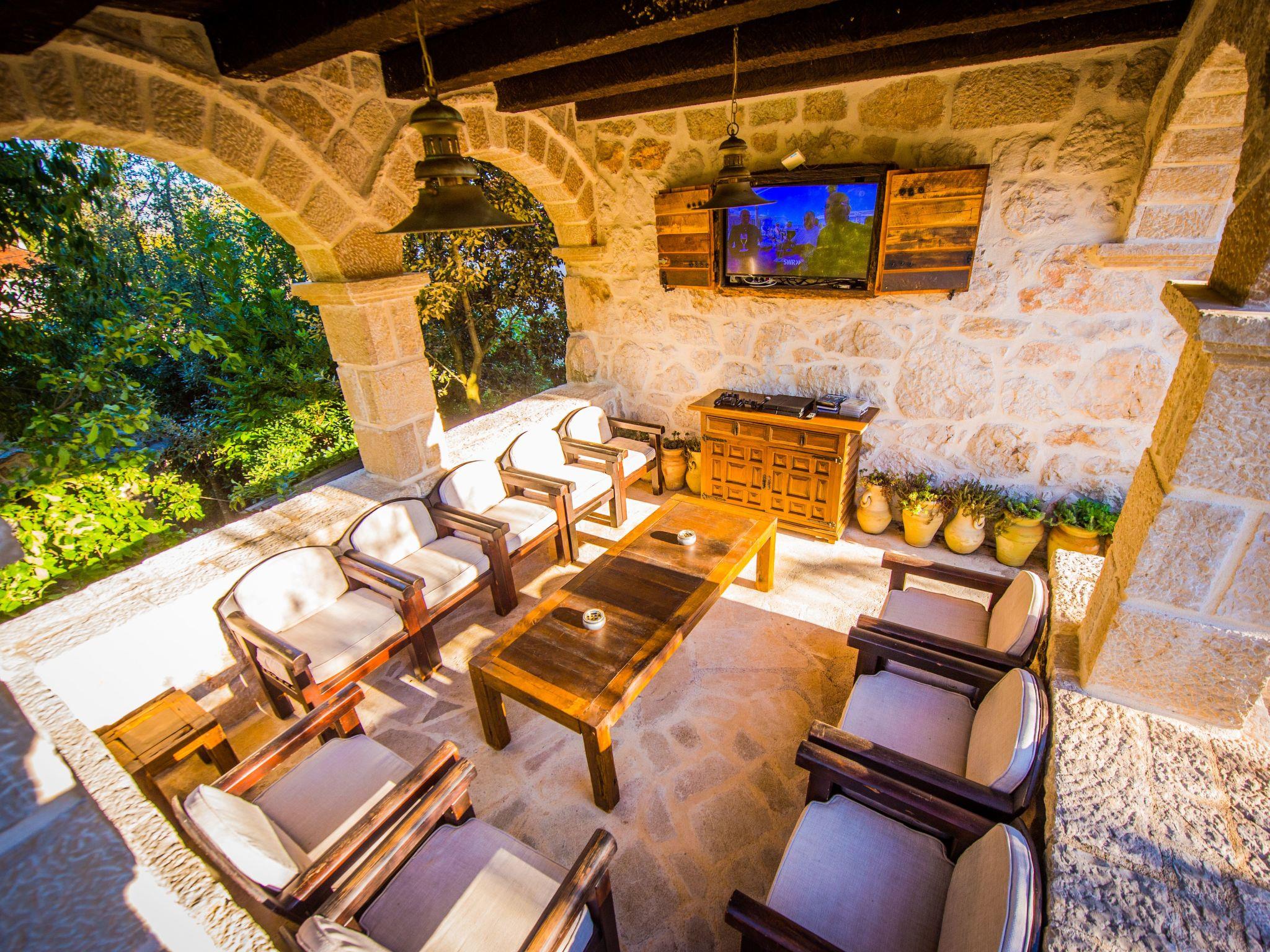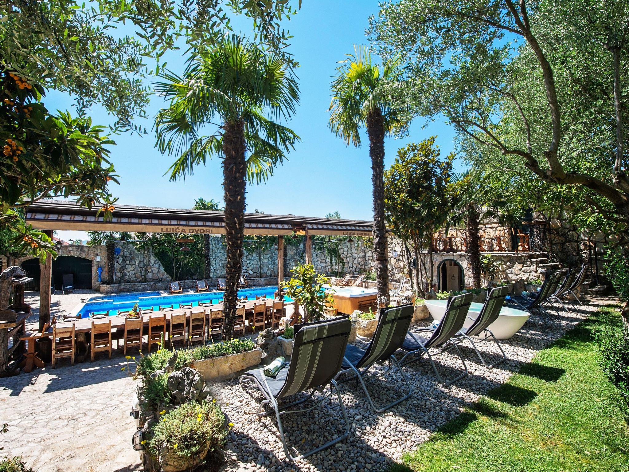 The property includes a large pool of 85m2, of which 9m2 are adapted as a pool for children. On the plot prevails luxurious Mediterranean horticulture with hundreds of years old olive trees, palm trees, magnolias, lavender and so on as well as a multitude of carved stone details such as rare large stone table with chairs for dining with accompanying bar and stone bar stools, barbecue, fountains and sculptures. There are several terraces in the villa where guests can enjoy the view and relax.