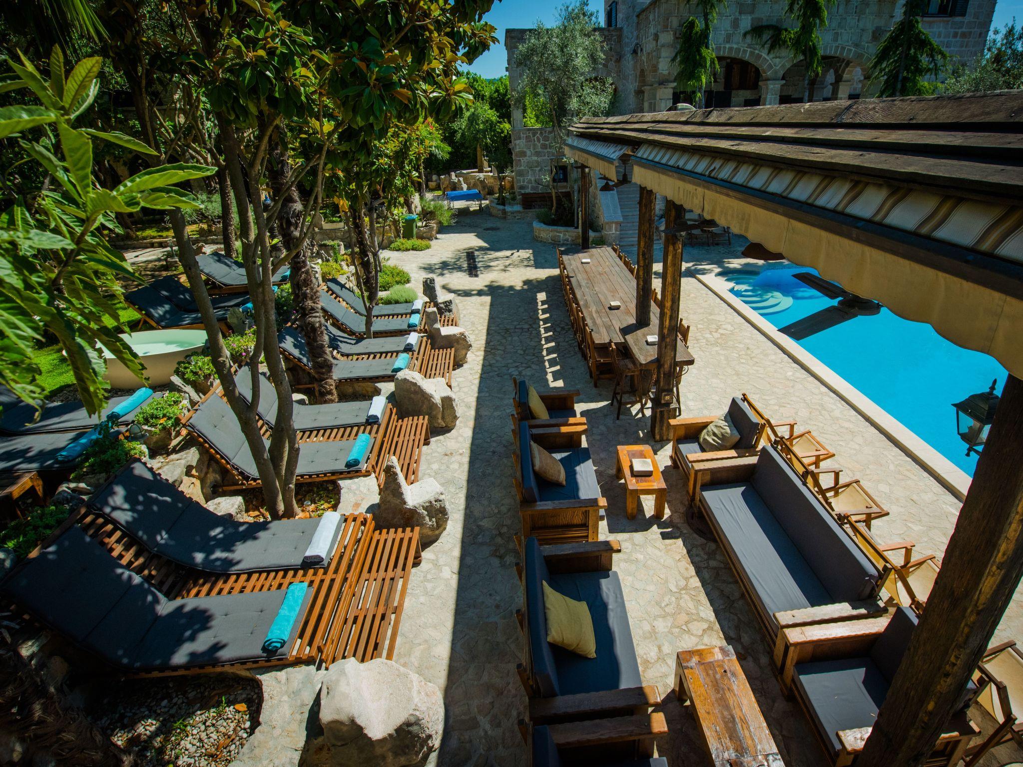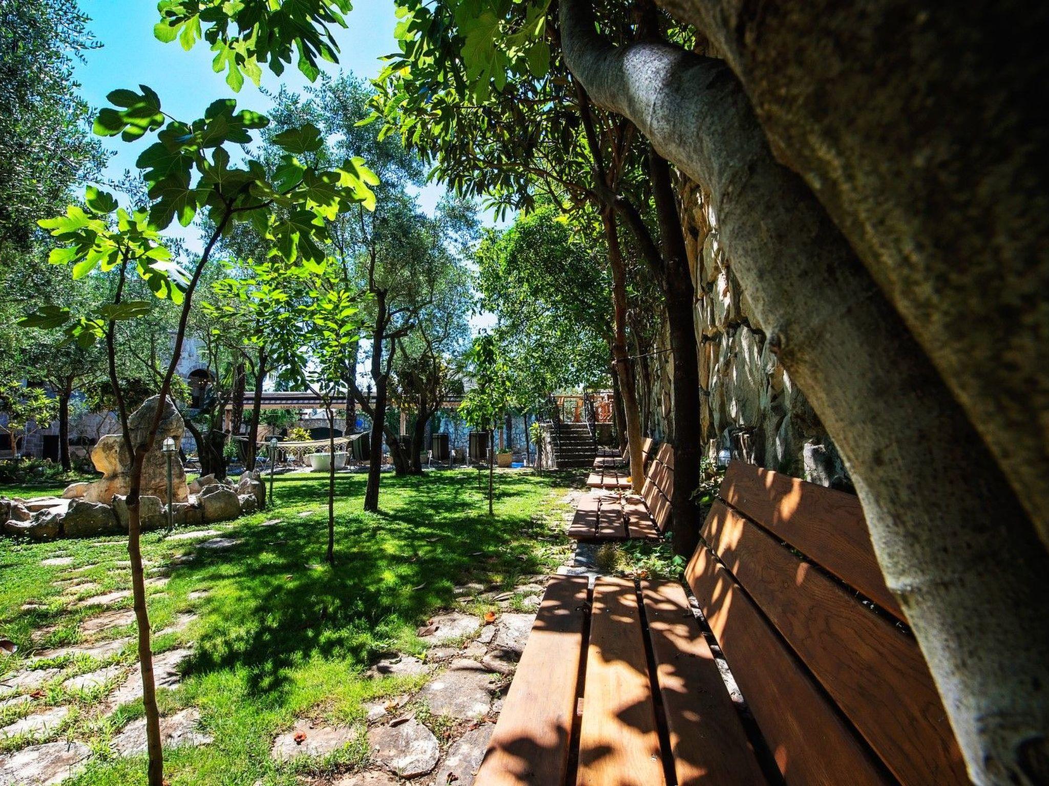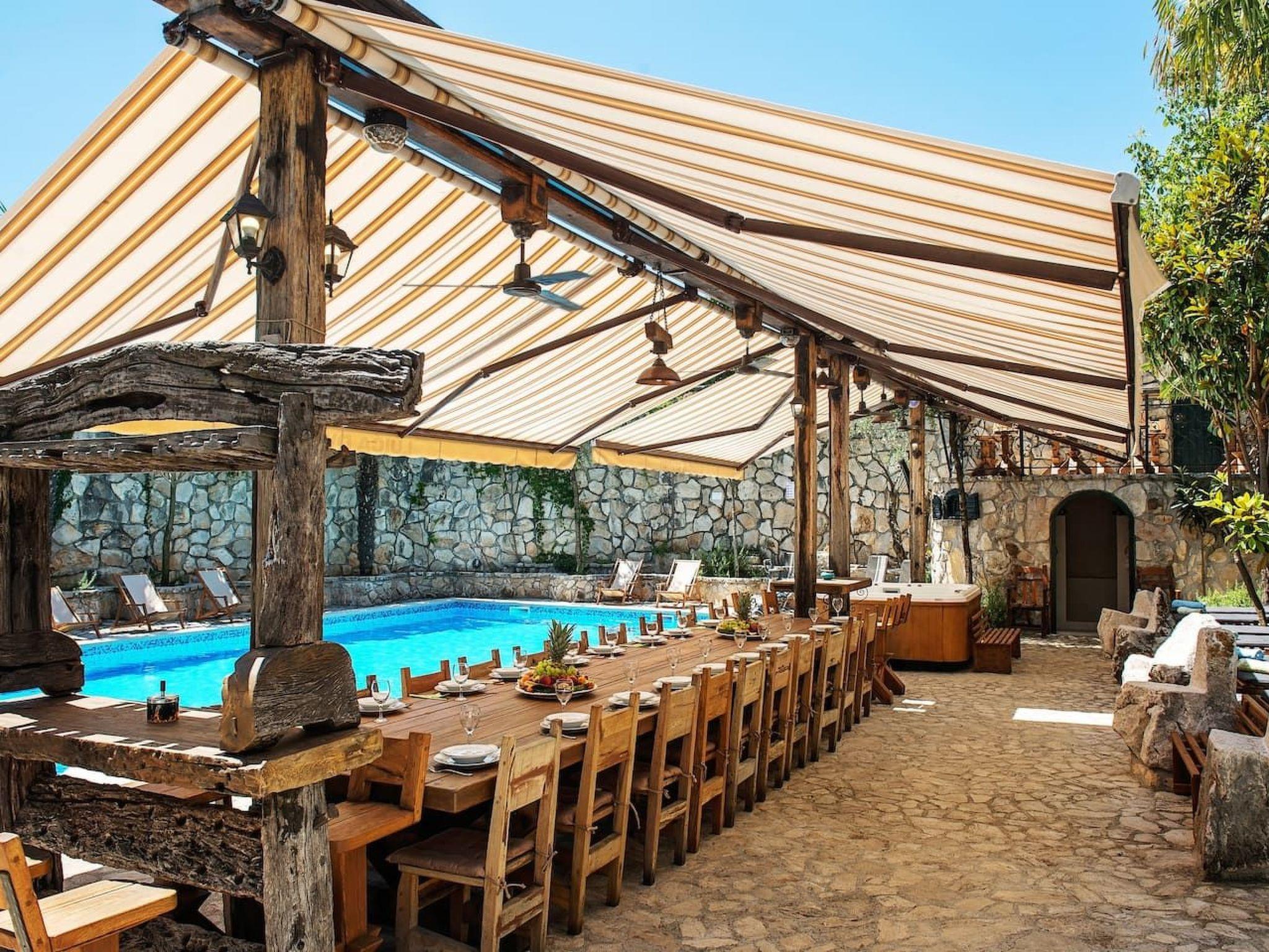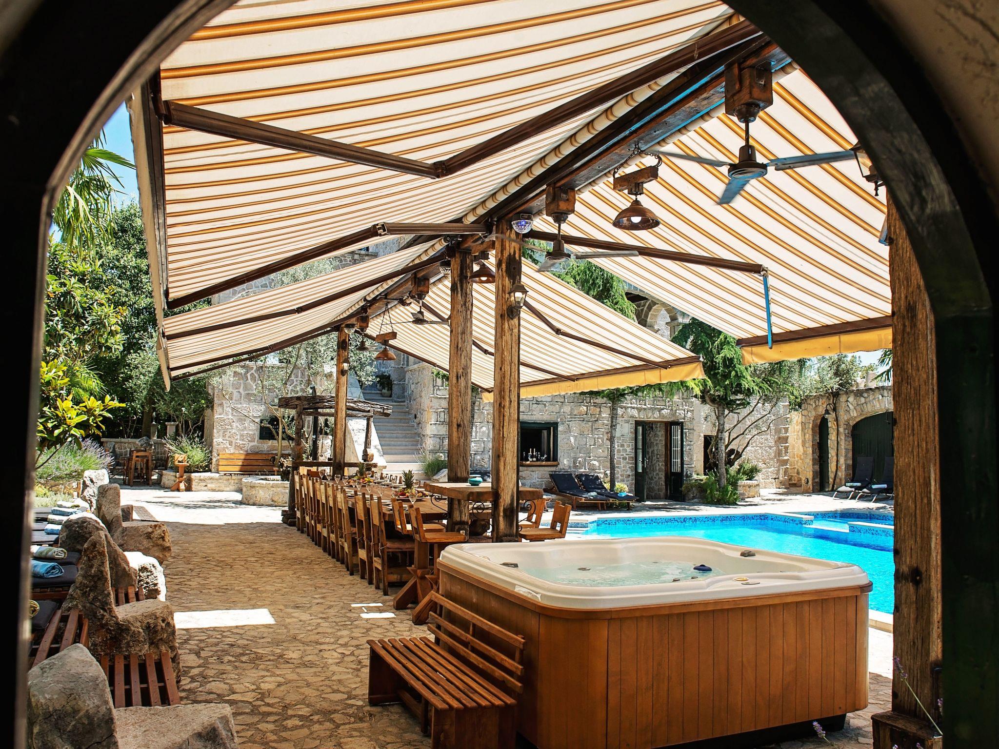The property includes a large pool of 85m2, of which 9m2 are adapted as a pool for children. On the plot prevails luxurious Mediterranean horticulture with hundreds of years old olive trees, palm trees, magnolias, lavender and so on as well as a multitude of carved stone details such as rare large stone table with chairs for dining with accompanying bar and stone bar stools, barbecue, fountains and sculptures. There are several terraces in the villa where guests can enjoy the view and relax.