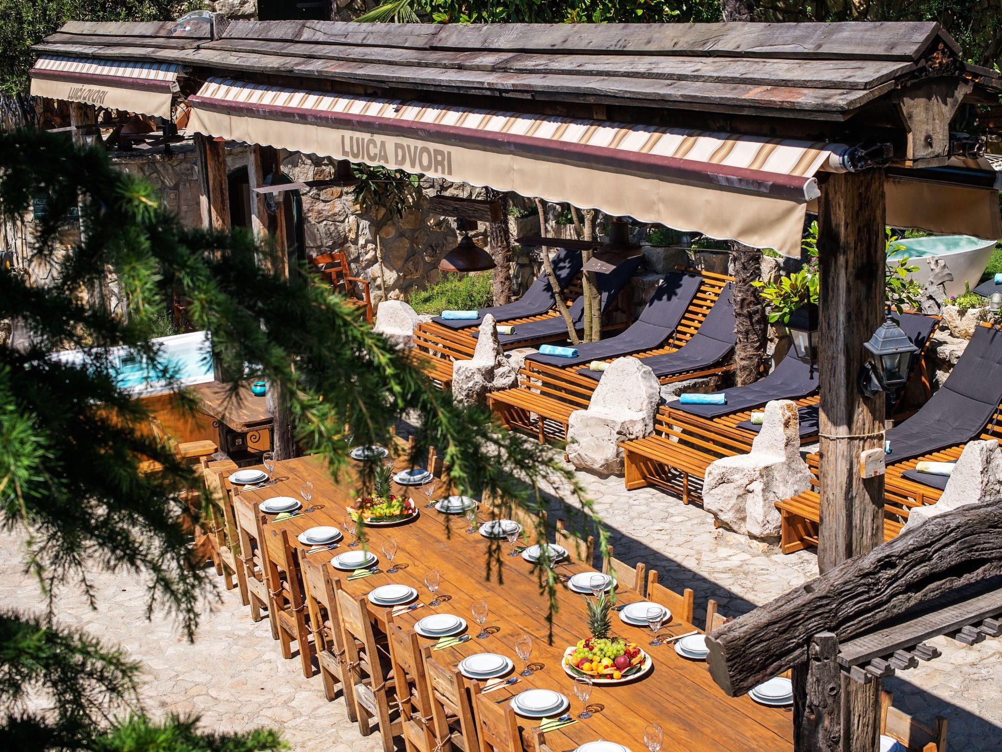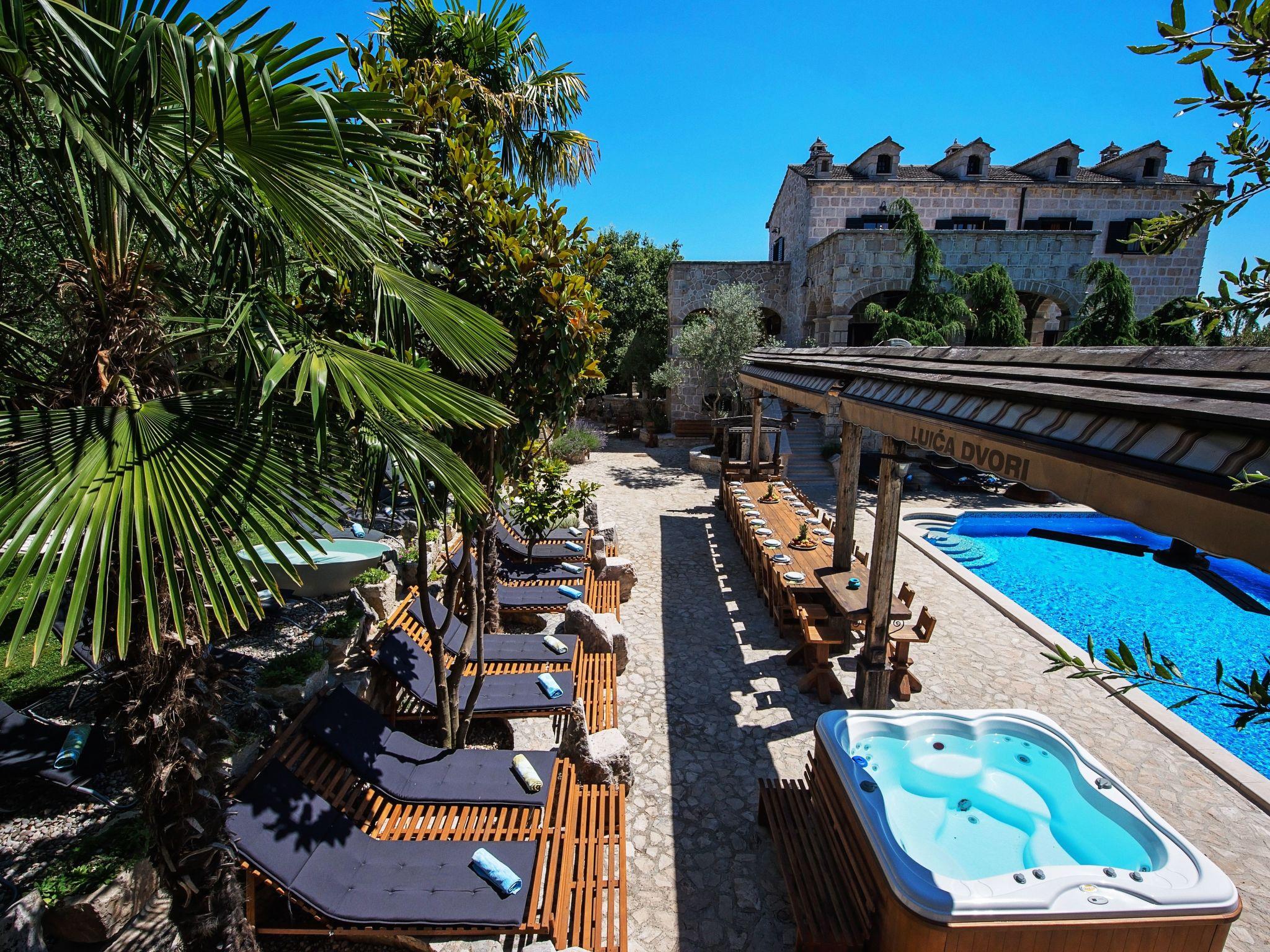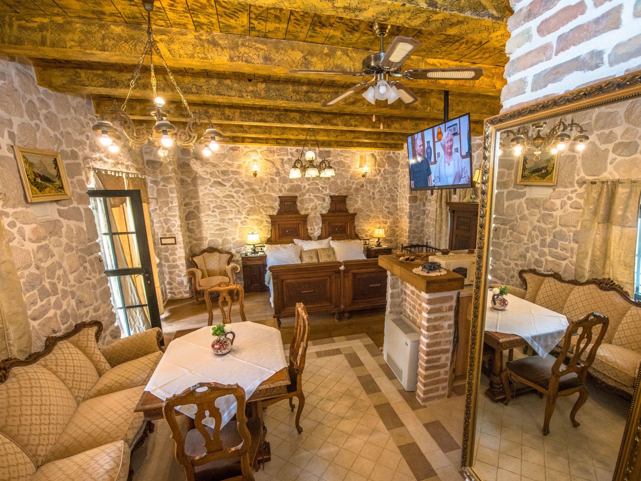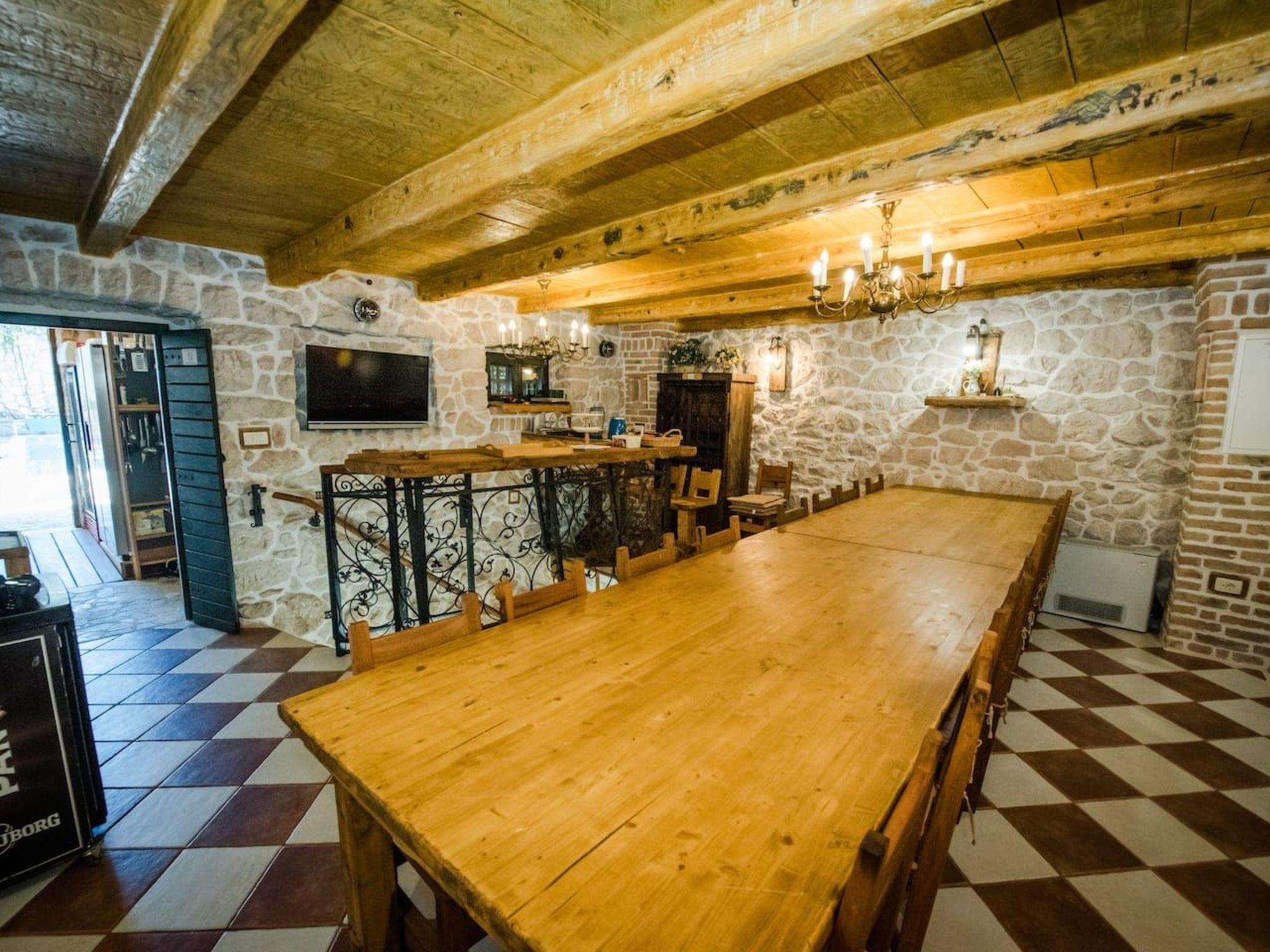 This beautiful five star estate Luica dvori is made of two luxuriously decorated villas of stone with a heated pool on the property 2000m2 big surrounded with giant stone walls which provide guests with privacy and intimacy for an unforgettable vacation.This extraordinary property consists of two stone luxurious villas with a heated pool on a plot of 2000m2 surrounded by a high stone wall that allows guests complete privacy for a memorable vacation. Just across the two villas (the haciendas) guests can use a third (extra) facility with parking lots and garages with 20 bicycles that are ideal for cycling lovers since there is a beautiful river just about 100 meters from the property with numerous cycle paths running along. Both villas have the top two floors connected by an internal communication, while the three separate units at the ground floor have separate entrances. The richly decorated interiors are made of hand-hewn stone, old mortar, Roman brick and hand-carved wood and furnished with restored antique furniture from the 18th and 19th centuries. Beds with their short dimensions out of this period are especially restored and prolonged by today's highest standards. Each villa has one large room for a common room, one of which is associated with a wine cellar. In one of the villas lies a large fitness room with whirlpool, sauna and changing rooms with showers. In several activity rooms, guests can relax by playing in one of the three pianos, or have fun with 2 billiards, table tennis, darts, table football, table hockey, a game console, and the use of free and unlimited Wi-Fi with signal covering the entire property. In the yard is a playground with a sandbox where there is a multitude of children's content for the youngest guests.The special microclimate of the area along the river and wide stone walls of the villa enable pleasant vacation with summer heat during the day and the pleasant night temperatures without any major need to use (existing) air conditioning. Each room has air conditioning (heating/cooling).