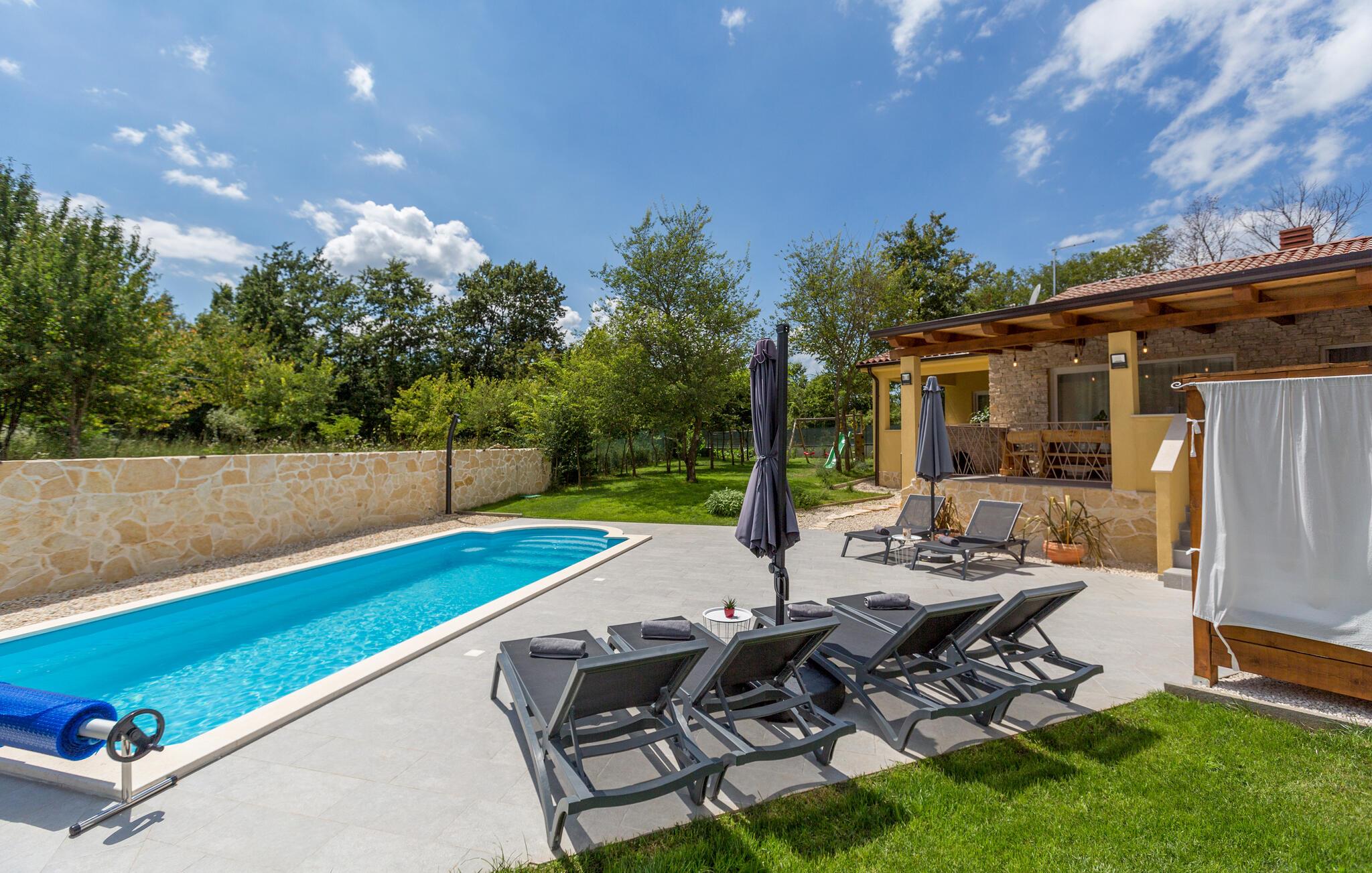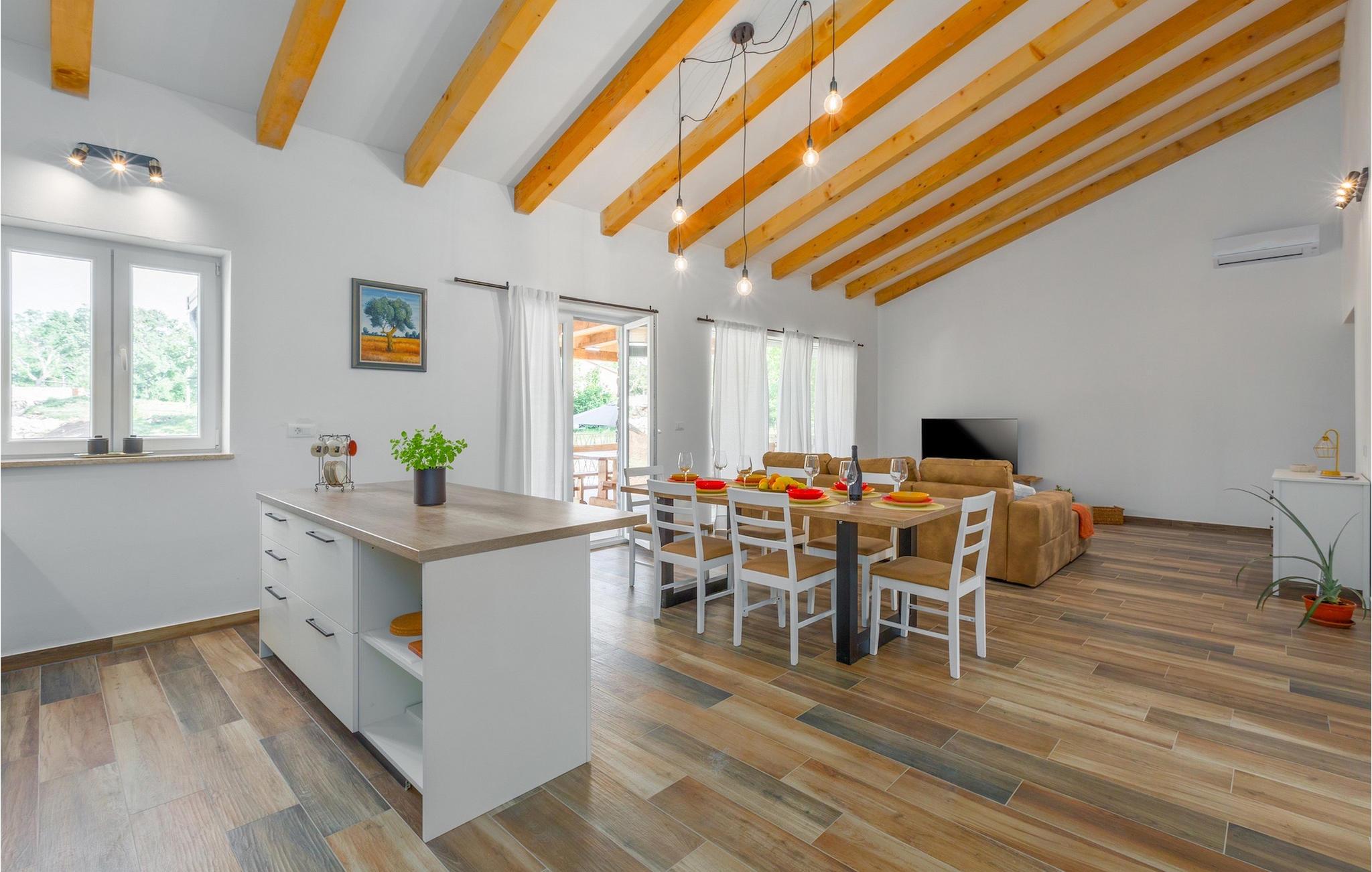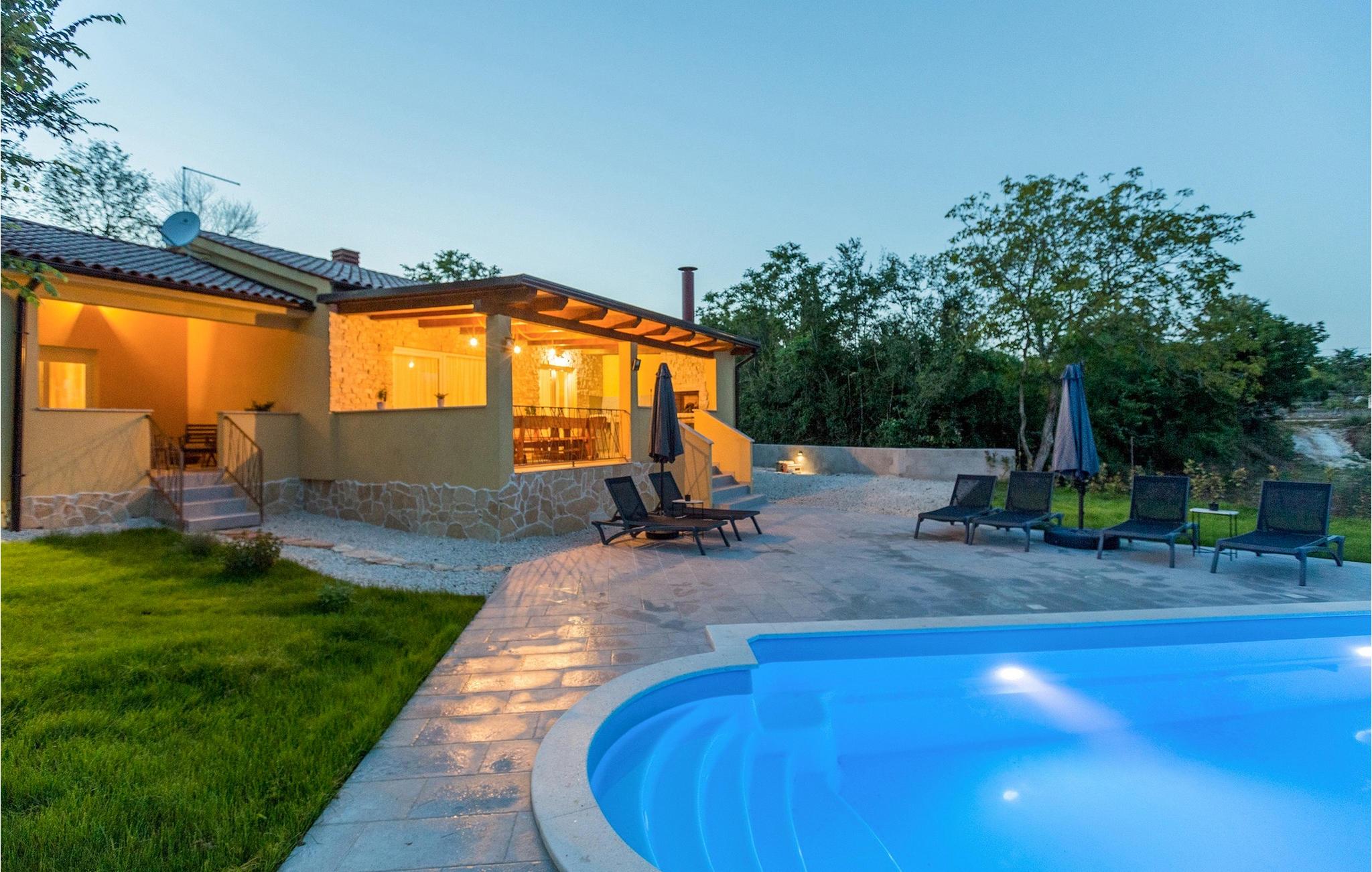 Kunne du tænke dig at tilbringe din ferie ved poolen, omgivet af natur og ro? I dette tilfælde er Villa Savey det perfekte valg for dig. Villa Savey ligger i den lille landsby Debeljuhi i det centrale Istrien i Zminj kommune. Villaen er et et-plans sommerhus og kan rumme op til 6+2 gæster fordelt på 3 soveværelser. Opholdsstuen består af en stue med tv, en spiseplads og et veludstyret køkken. Der er også 3 soveværelser med dobbeltsenge, hvoraf to har en-suite badeværelser. Det udendørs område er villaens højdepunkt. Villaen er beliggende på en 900 kvadratmeter stor grund, med en smuk have og en privat pool, hvor du kan slappe af og nyde den varme sommerbrise. Blot få skridt væk er den overdækkede terrasse med udendørs spiseplads og kulgrill det perfekte sted for en familiesammenkomst, hvor I alle sammen kan tilberede lækre måltider og nyde jeres familieferie. Villaen er ideel til familier og vennegrupper på udkig efter en afslappende ferie omgivet af ro. Den charmerende Villa Savey ligger i landsbyen Debeljuha i Žminj kommune i det centrale Istrien. Villaen har en ideel beliggenhed, hvis du ønsker at opdage charmen i det centrale Istrien og nyde uberørt natur og gastronomi. Det centrale Istrien er bedst kendt for sit frugtbare land "Terra Rossa", hvor olivenlunde, frugtplantager og vinmarker i det berømte istriske Malvasia breder sig. Besøg talrige vinproducenter, smag deres produkter og nyd de smukke landskaber i Istrien. Ved hver tur er du omgivet af talrige vandre- og cykelstier, hvilket bestemt er et stort plus for dem, der kan lide at tilbringe deres ferie aktiv. Kun en kort køretur adskiller dig fra den Istriske halvøs vestkyst, hvor du finder byerne Porec, Rovinj og Pula, som er blandt de mest besøgte turistmål i Istrien. Gå en tur gennem de smalle gader og besøg adskillige gallerier og souvenirbutikker, hvor du kan finde traditionelle og håndlavede souvenirs. Temperaturen i den opvarmede swimmingpool er afhængig af eksterne faktorer, herunder vejrforhold, og som sådan kan temperaturen på vandet ikke garanteres.
