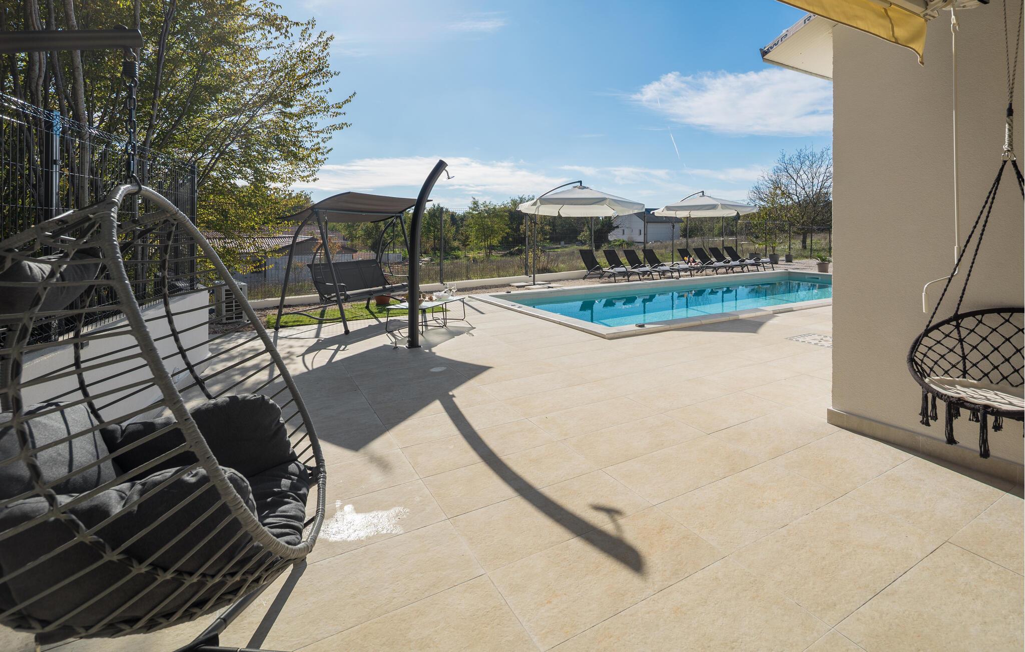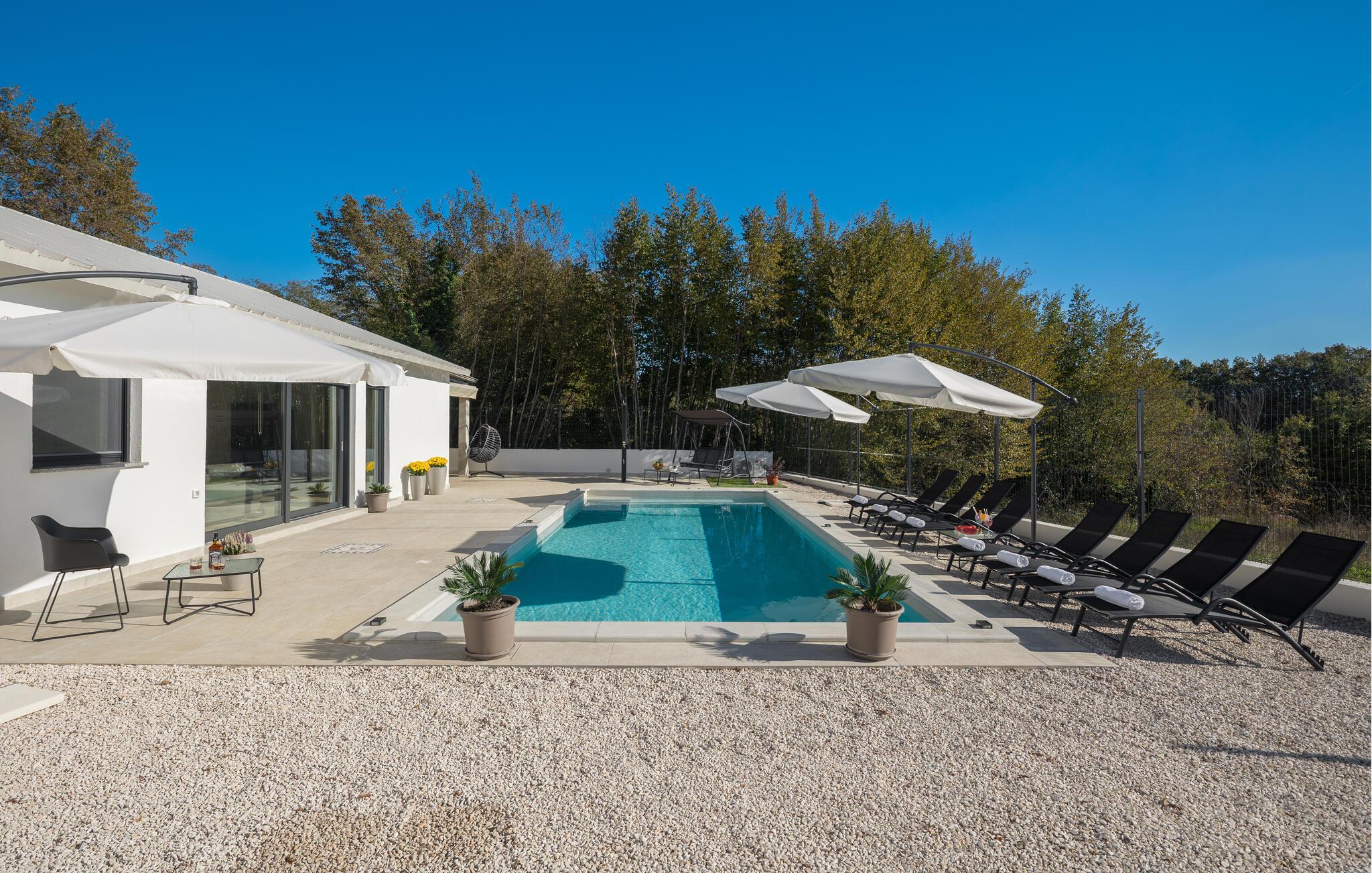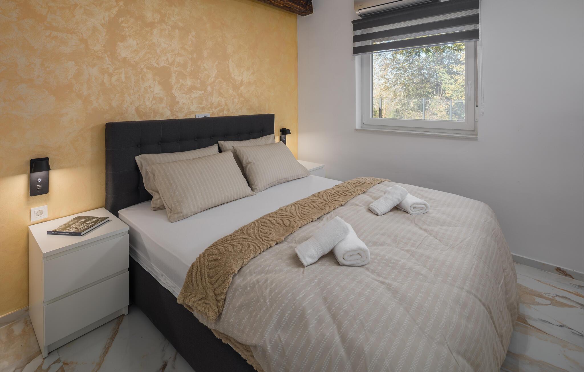 Tilbring en dejlig ferie ved havet i dette komfortable feriehus med en fantastisk panoramaudsigt. Velkommen til dette indbydende og meget rummelige hus, der byder jer velkommen midt i et idyllisk landskab og fortryller med sin storslåede udsigt. Her kan I nyde en uforglemmelig ferie, selv med en større gruppe. Efter dagens aktiviteter kan I slå jer ned i den behagelige sofa, diskutere dagens oplevelser og nyde udsigten over poolen, mens I spiser og slapper af. Gå ud på terrassen og nyd den unikke udsigt derfra. Nyd solen og svøm baner i poolen, eller slap af i udendørsspabadet. Jeres børn vil finde masser af plads til at lege og forskellige legeredskaber. Gå en tur gennem de idylliske gader i Žminj, en charmerende landsby i hjertet af halvøen, og oplev det autentiske Kroatien langt fra travlheden. Udforsk det grønne landskab omkring Šoštari på cykel eller til fods – indånd duften af lavendel, rosmarin og oliventræer, og nyd den vidtstrakte udsigt over bakker og vinmarker. Besøg nærliggende vingårde og prøv prisvindende vine direkte fra vinproducenten. Tag til havet og svøm i Adriaterhavet; Strandene i Rovinj, Porec og Vrsar ligger kun en kort køretur væk.