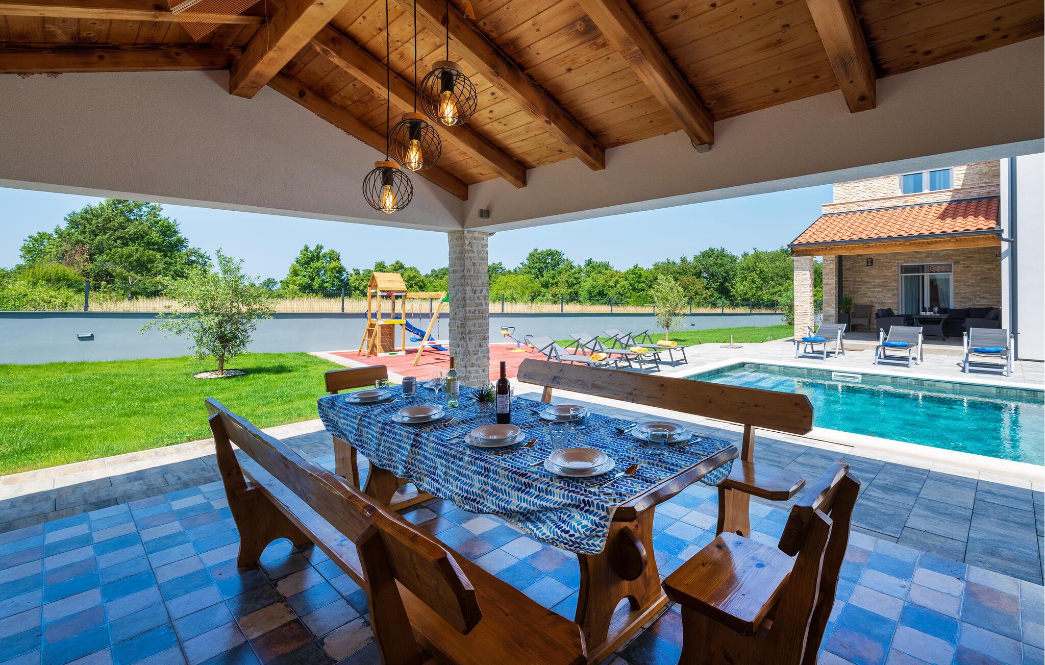 Start dagen med en lang svømmetur i poolen, og tilbered derefter en let morgenmad. Slap af på liggestolene, eller spil badminton. Der er udendørs legeredskaber til børnene. Saml jer om aftenen til en hyggelig grillfest og skål for jeres vidunderlige ferieoplevelser.