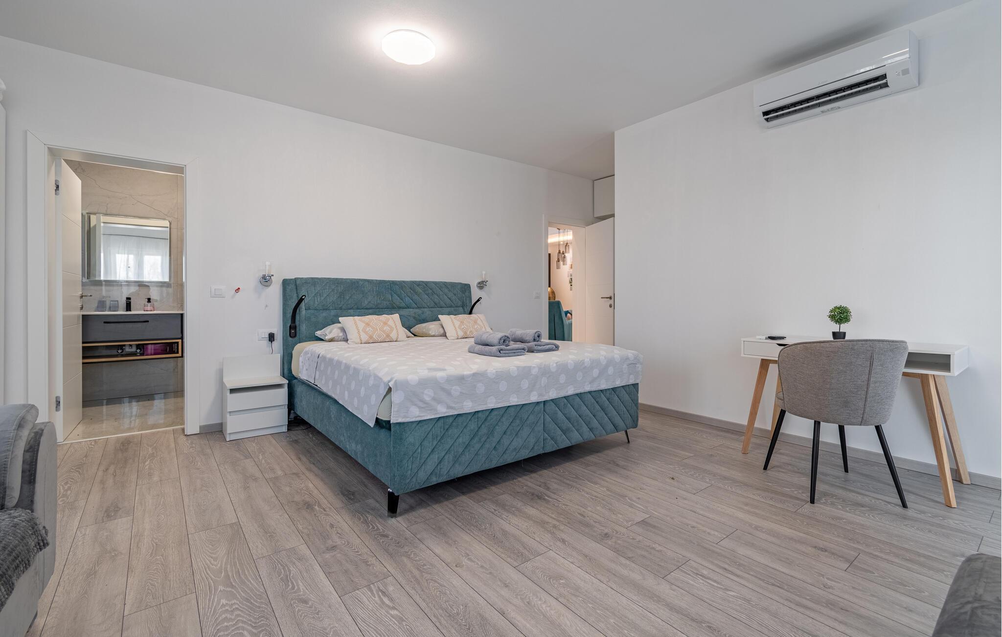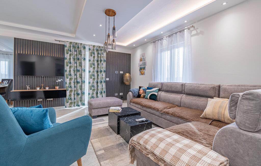 Dette herskabelige hjem med sine stilfulde møbler er perfekt til et fantastisk ophold. Interiøret, der er indrettet i pæne farver, udstråler varme og komfort. Slap helt af i den komfortable sofagruppe, nyd en eftermiddagslur, eller bladr i jeres ferielæsning. Tryl lækre måltider frem i det moderne køkken, inden I spiser med vennerne ved det store spisebord.