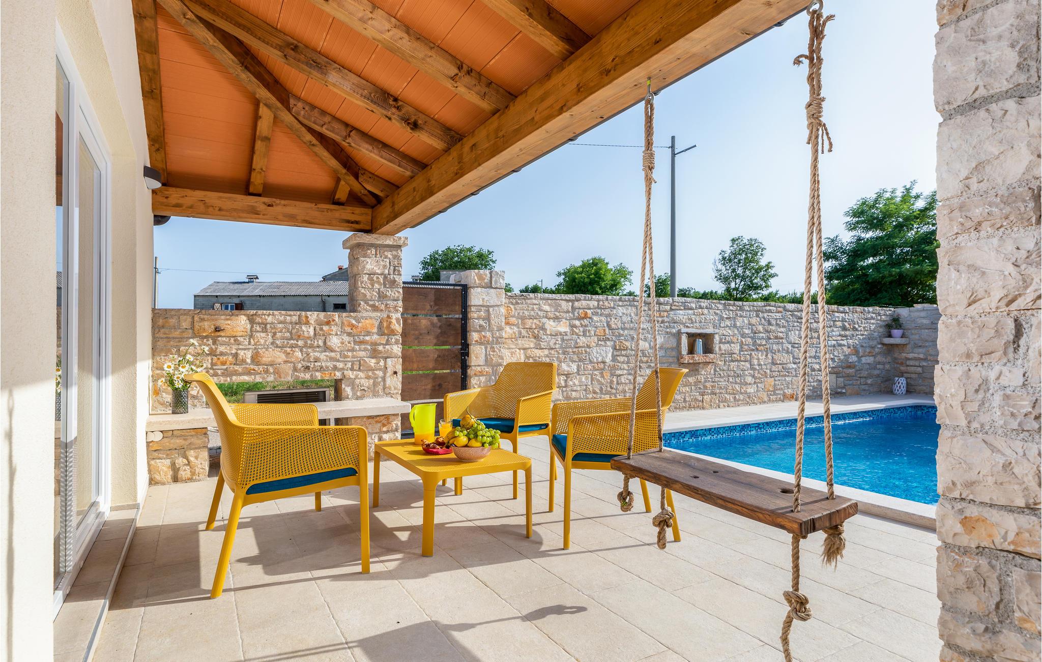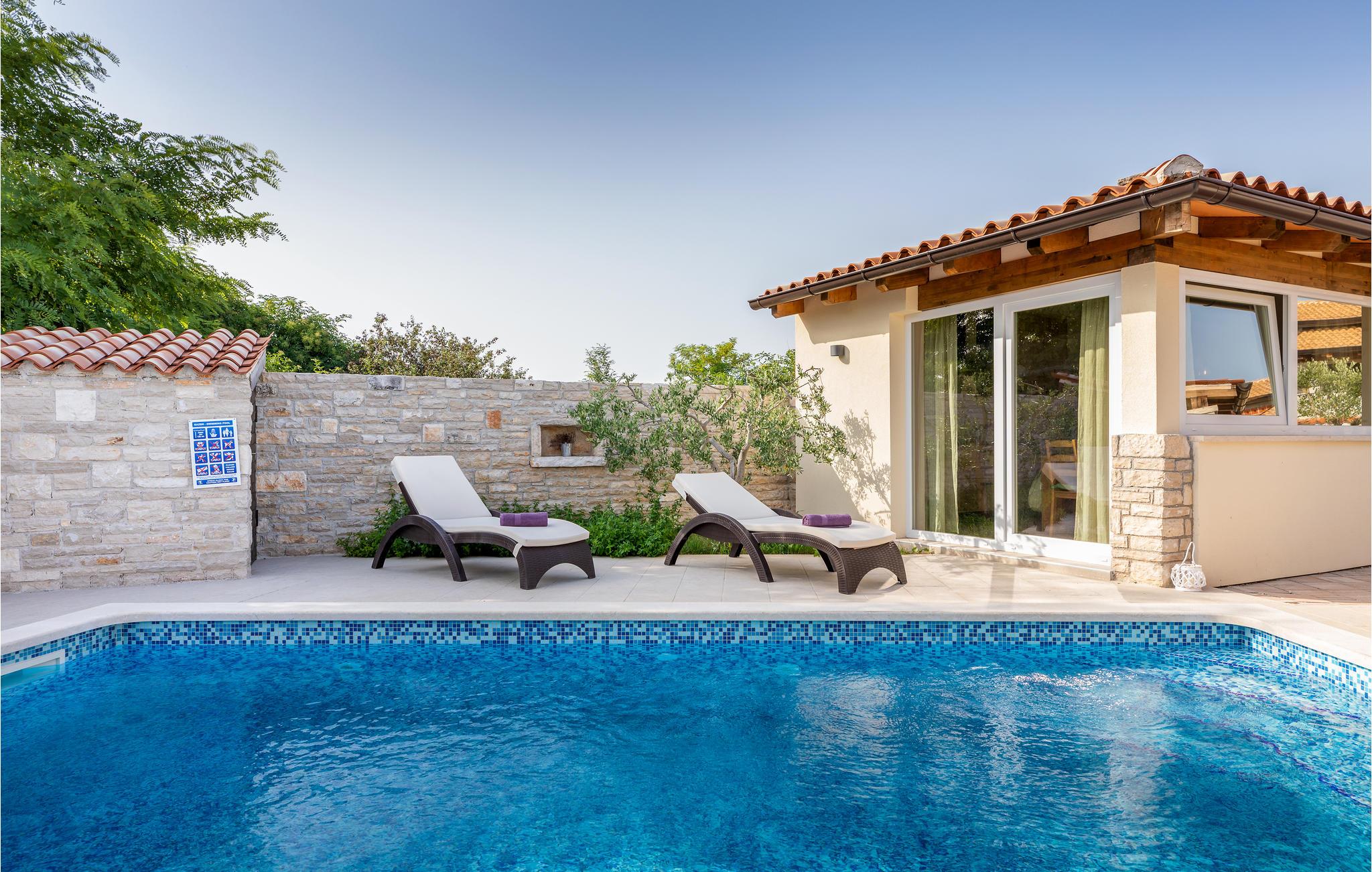 Et højdepunkt ved huset er det smukke poolområde, hvor I kan køle af på varme dage eller slappe af på liggestolene.
