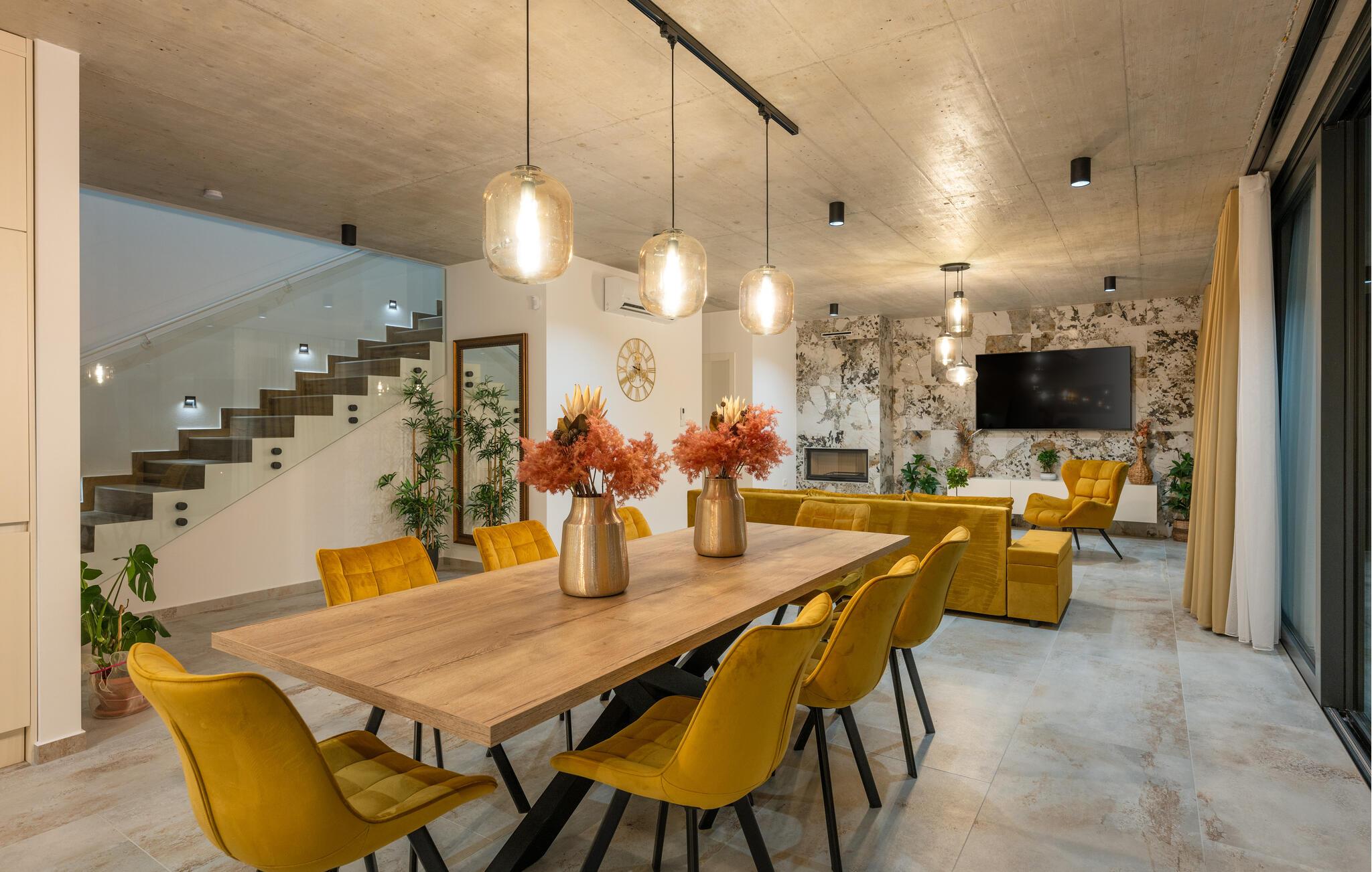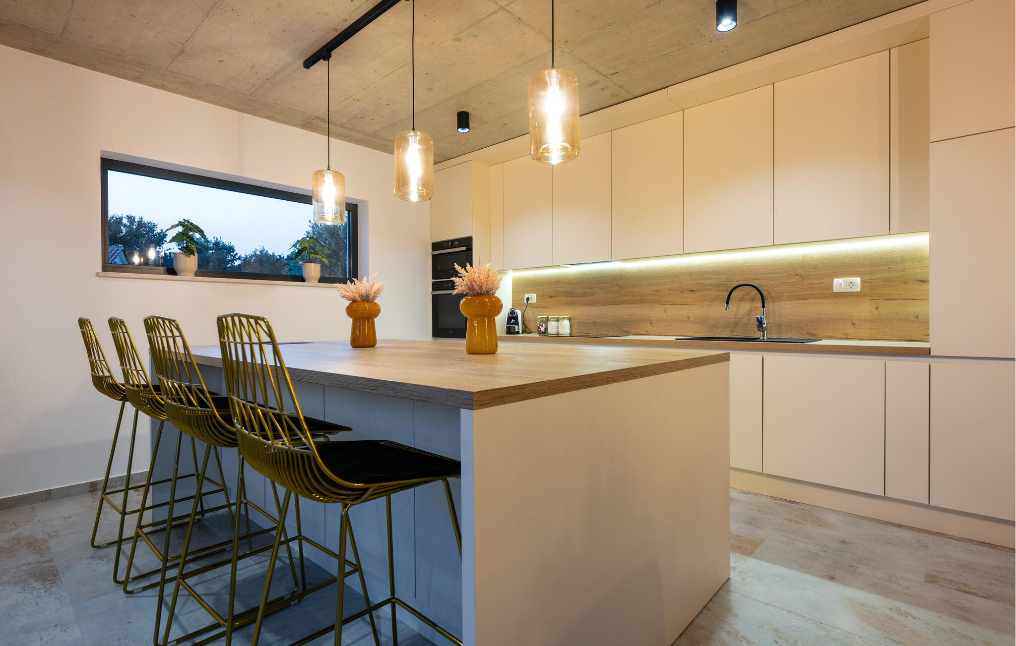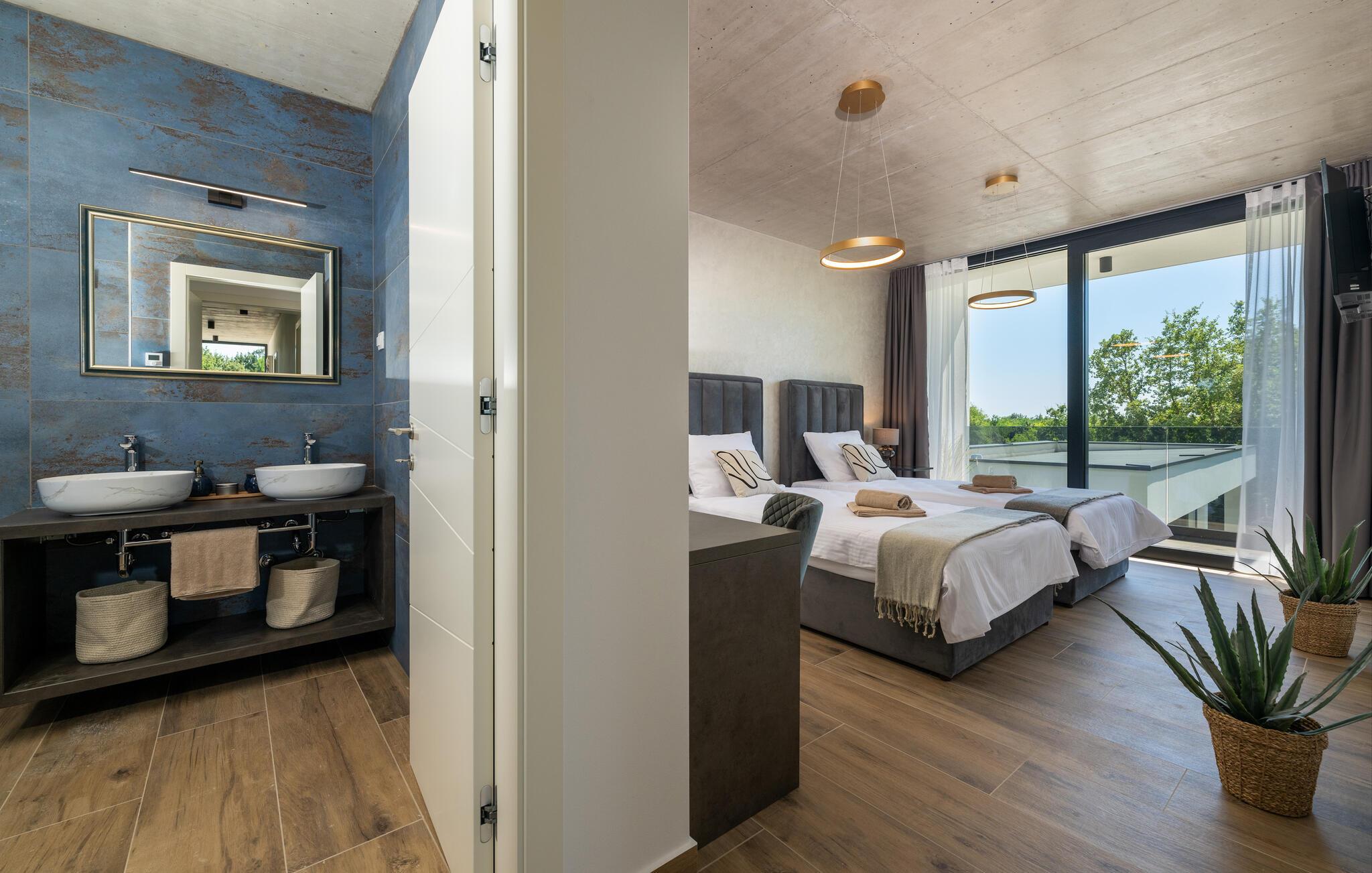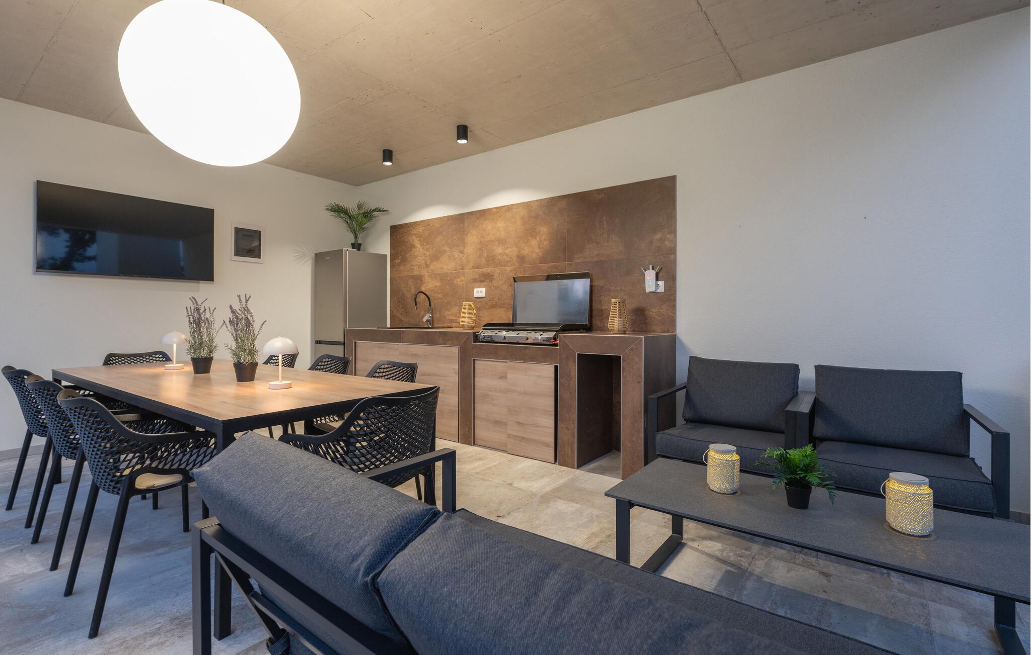 Denne eksklusive ejendom i Zminj-Modrusani giver jer alle de faciliteter, I har brug for til et uforglemmeligt ophold. Den velholdte græsplæne er understøttet af et effektivt kunstvandingssystem, så haven ser altid frisk ud, og den opvarmede pool lægger op til at slappe af. Begynd jeres feriedage med en forfriskende svømmetur i poolen og nyd derefter morgenmaden i det moderne sommerkøkken, som er udstyret med et integreret tv. Her kan I tilberede jeres måltider i en hyggelig atmosfære og samtidig nyde omgivelsernes skønhed.