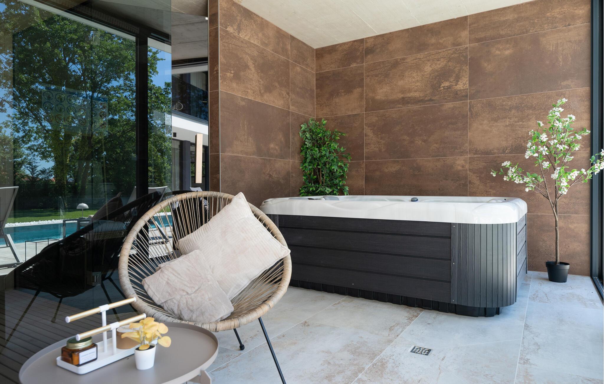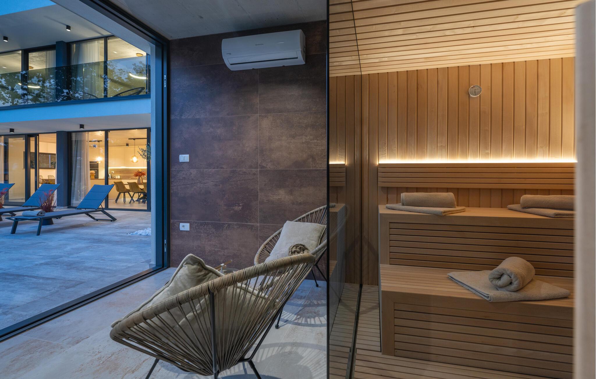 Inde i feriehuset finder I et stilfuldt wellnessområde med sauna og spabad. Forkæl jer selv med en pause og gør noget godt for alle jeres sanser i denne luksuriøse oase. Huset er lyst og rummeligt og har en behagelig atmosfære, hvor I nemt kan føle jer hjemme.