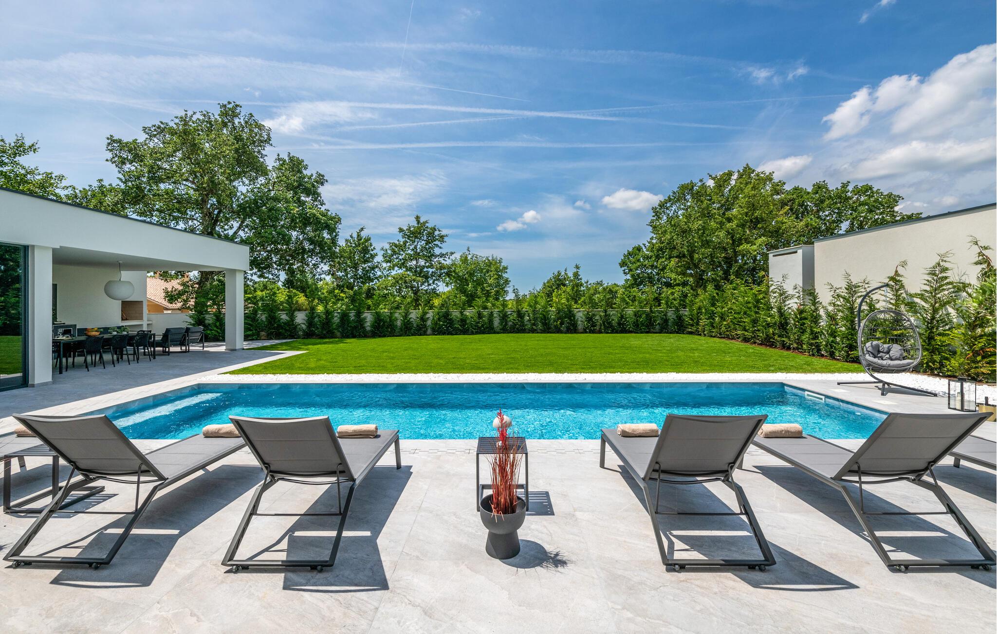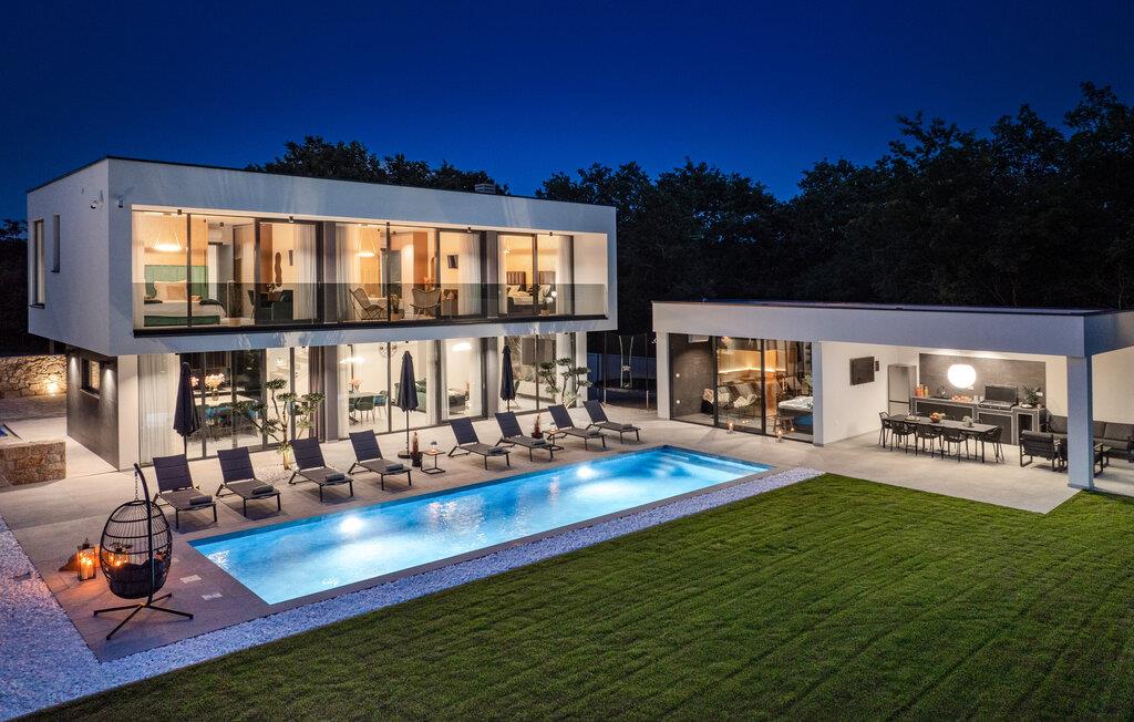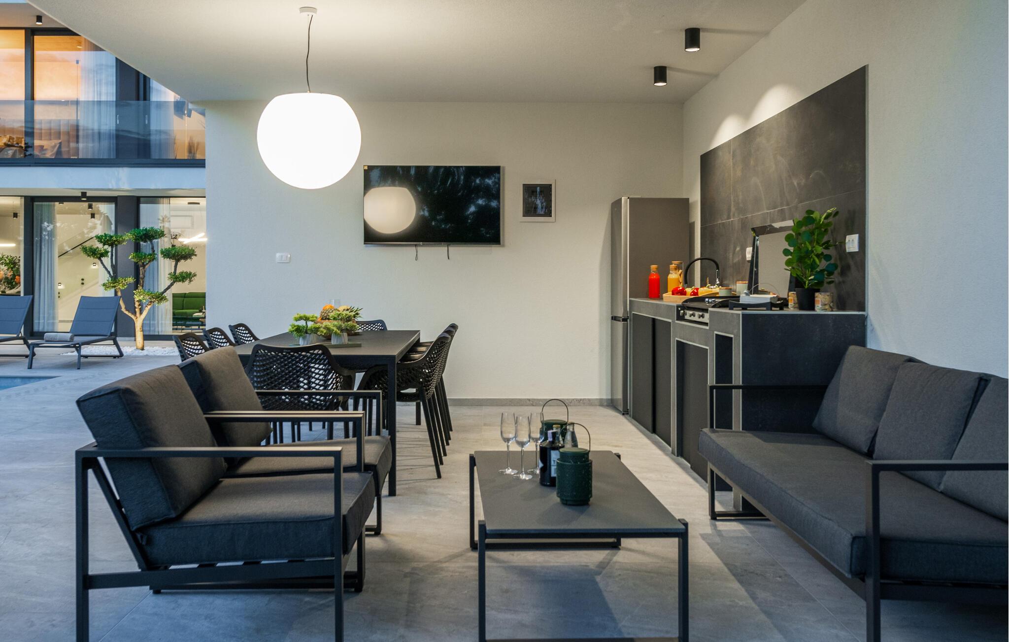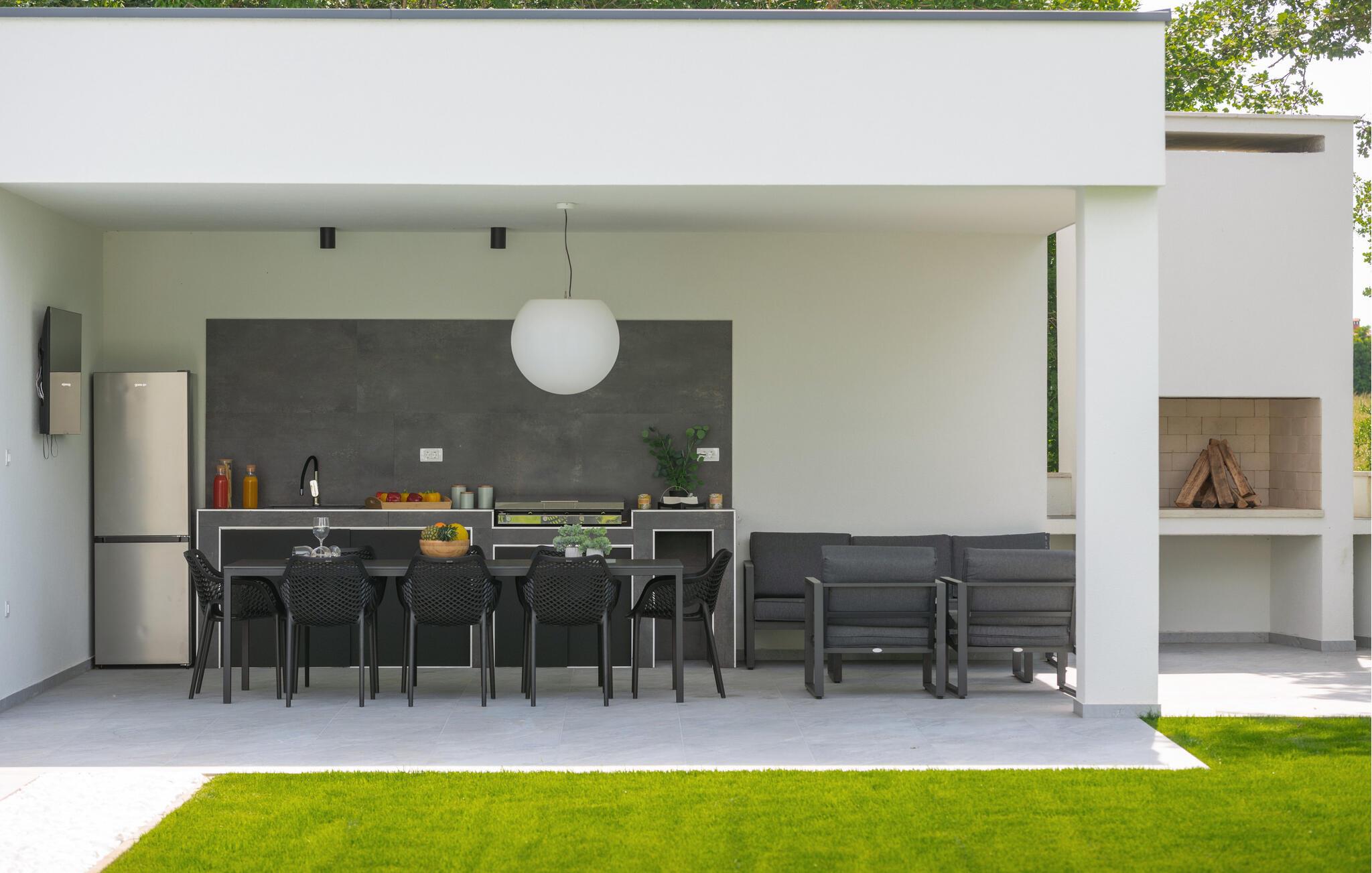 Denne eksklusive ejendom i Zminj-Modrusani giver jer alle de faciliteter, I har brug for til et uforglemmeligt ophold. Den velholdte græsplæne er understøttet af et effektivt kunstvandingssystem, så haven ser altid frisk ud, og den opvarmede pool lægger op til at slappe af. Begynd jeres feriedage med en forfriskende svømmetur i poolen og nyd derefter morgenmaden i det moderne sommerkøkken, som er udstyret med et integreret tv. Her kan I tilberede jeres måltider i en hyggelig atmosfære og samtidig nyde omgivelsernes skønhed.