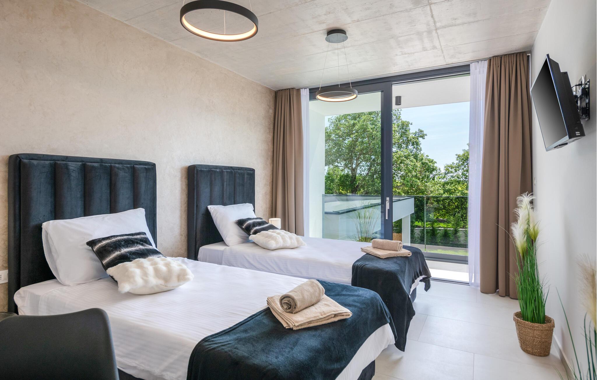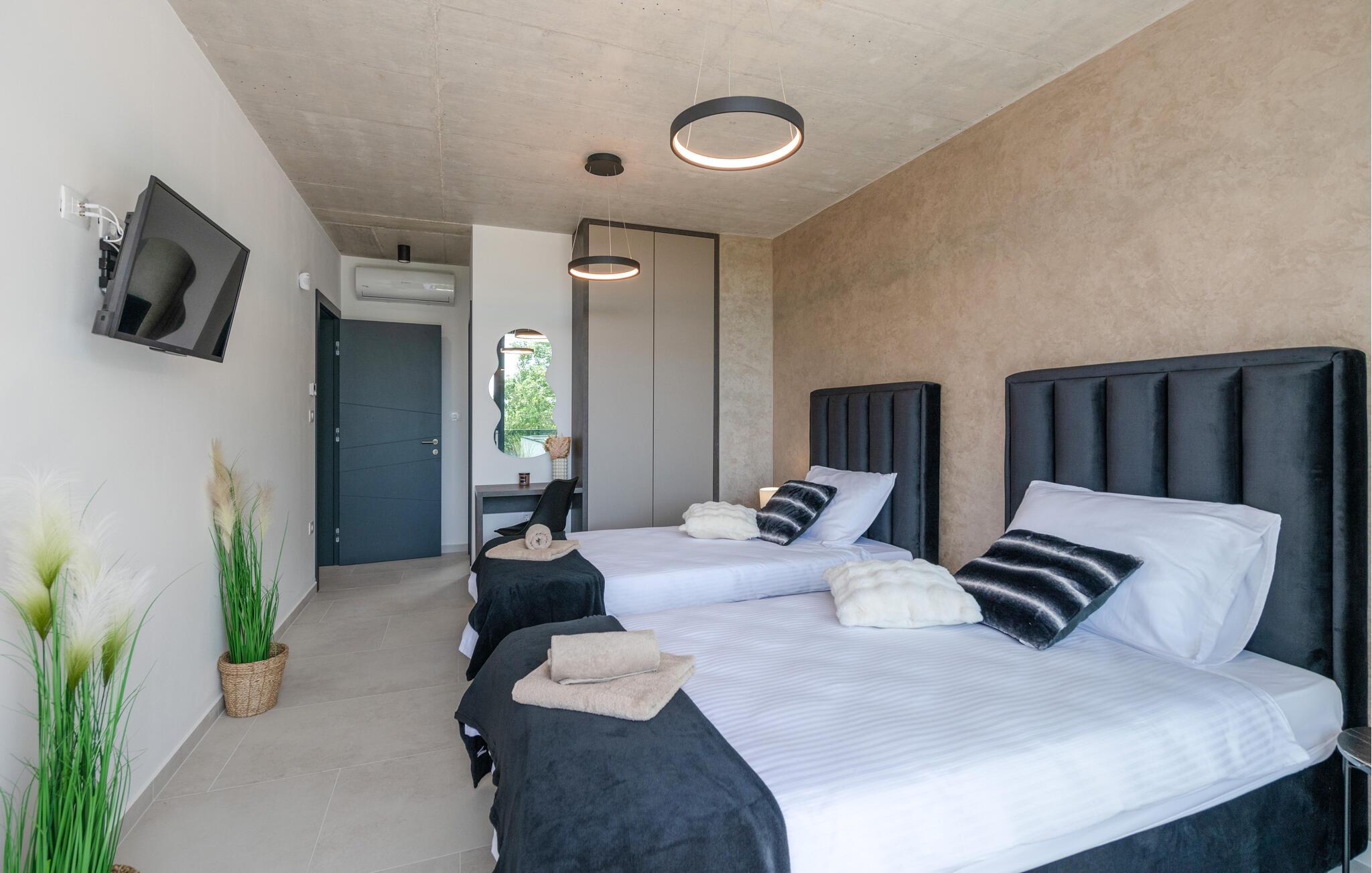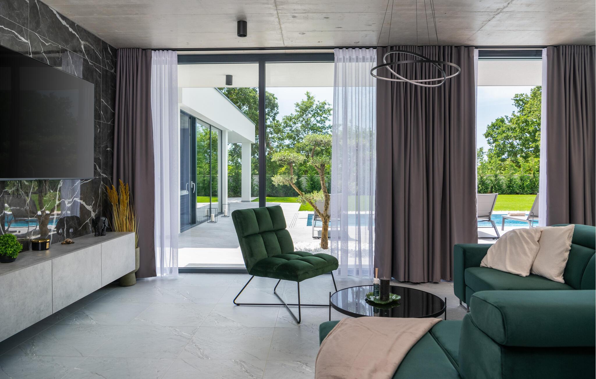 Denne eksklusive ejendom i Zminj-Modrusani giver jer alle de faciliteter, I har brug for til et uforglemmeligt ophold. Den velholdte græsplæne er understøttet af et effektivt kunstvandingssystem, så haven ser altid frisk ud, og den opvarmede pool lægger op til at slappe af. Begynd jeres feriedage med en forfriskende svømmetur i poolen og nyd derefter morgenmaden i det moderne sommerkøkken, som er udstyret med et integreret tv. Her kan I tilberede jeres måltider i en hyggelig atmosfære og samtidig nyde omgivelsernes skønhed.