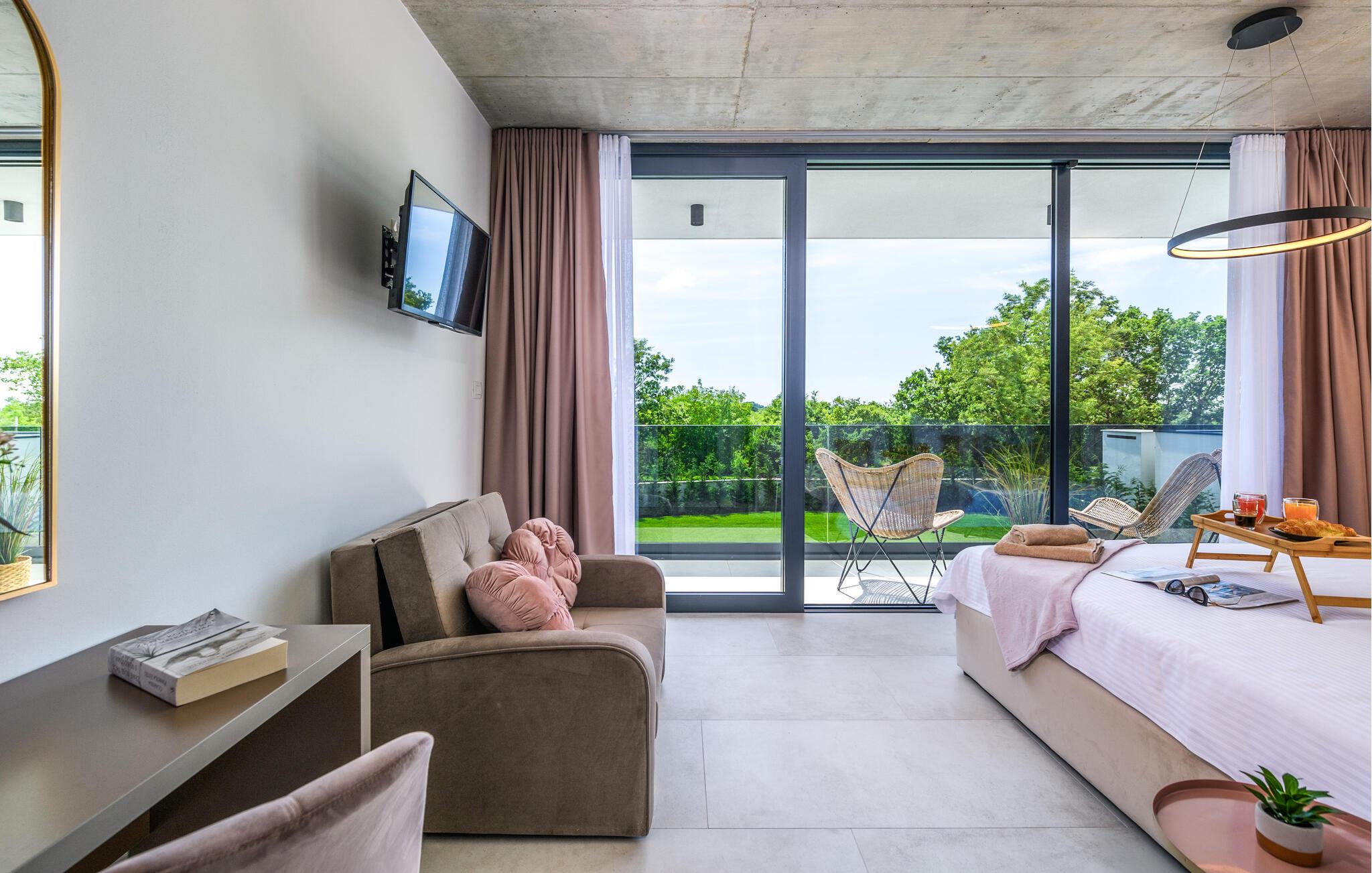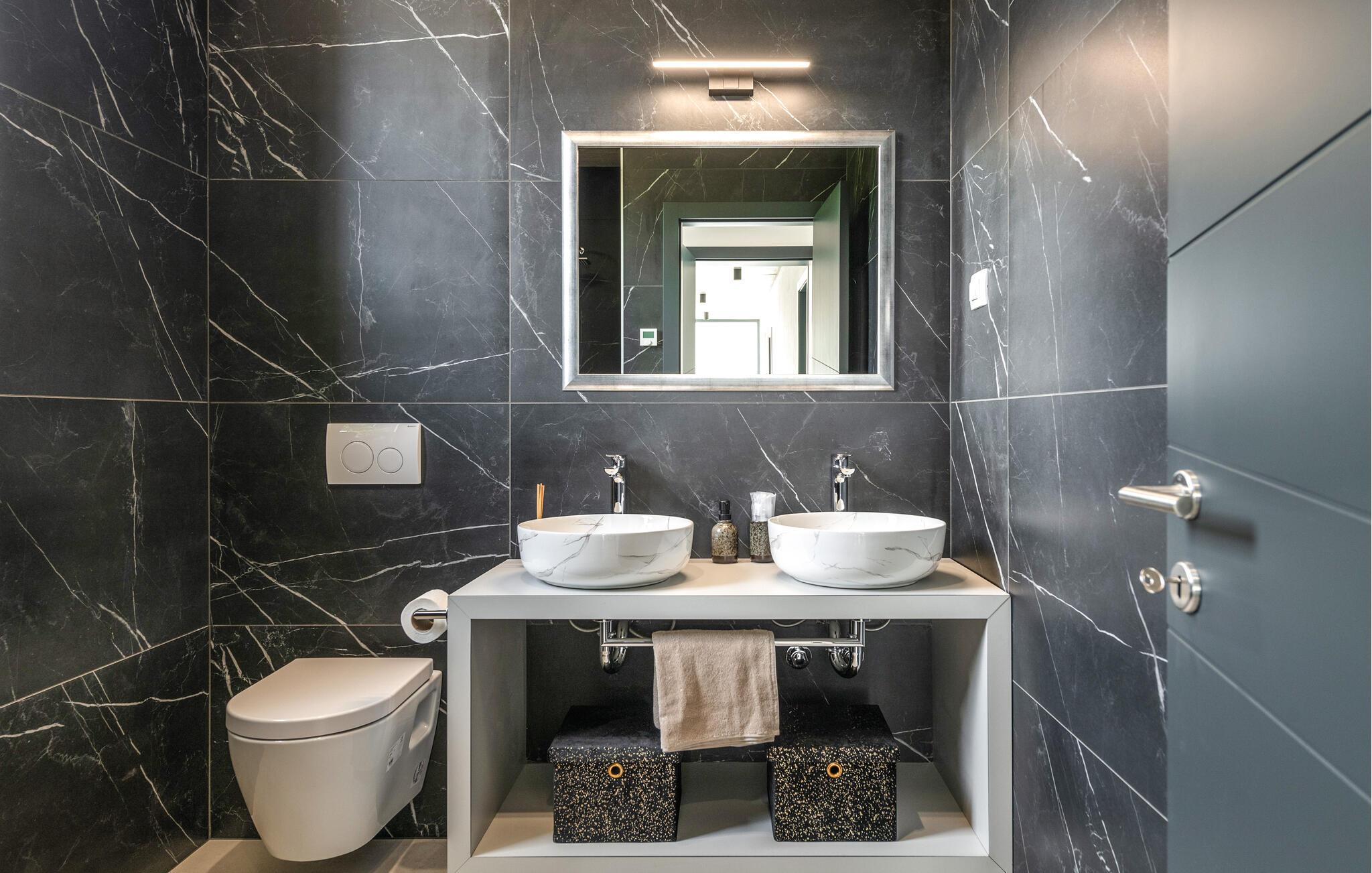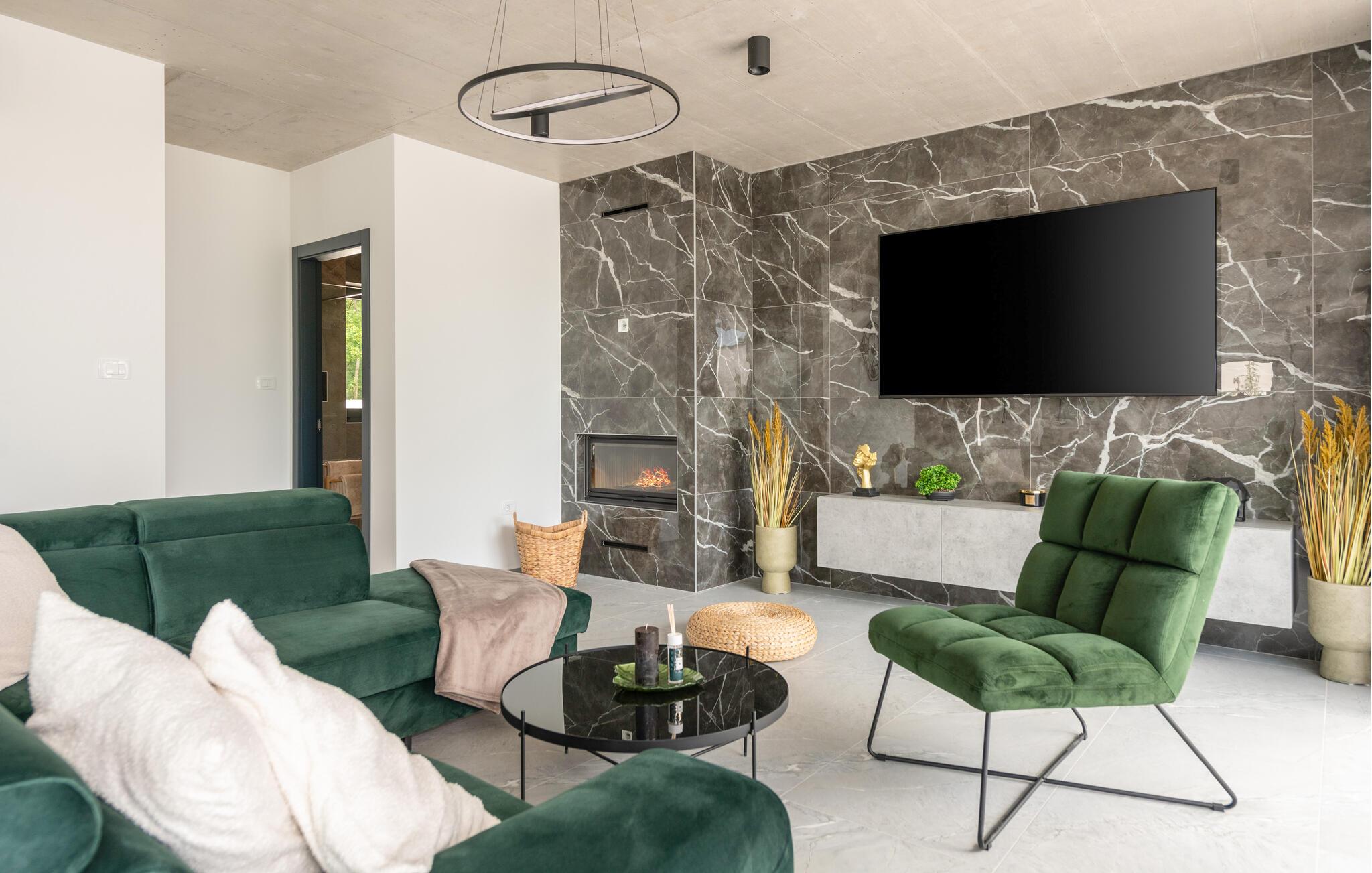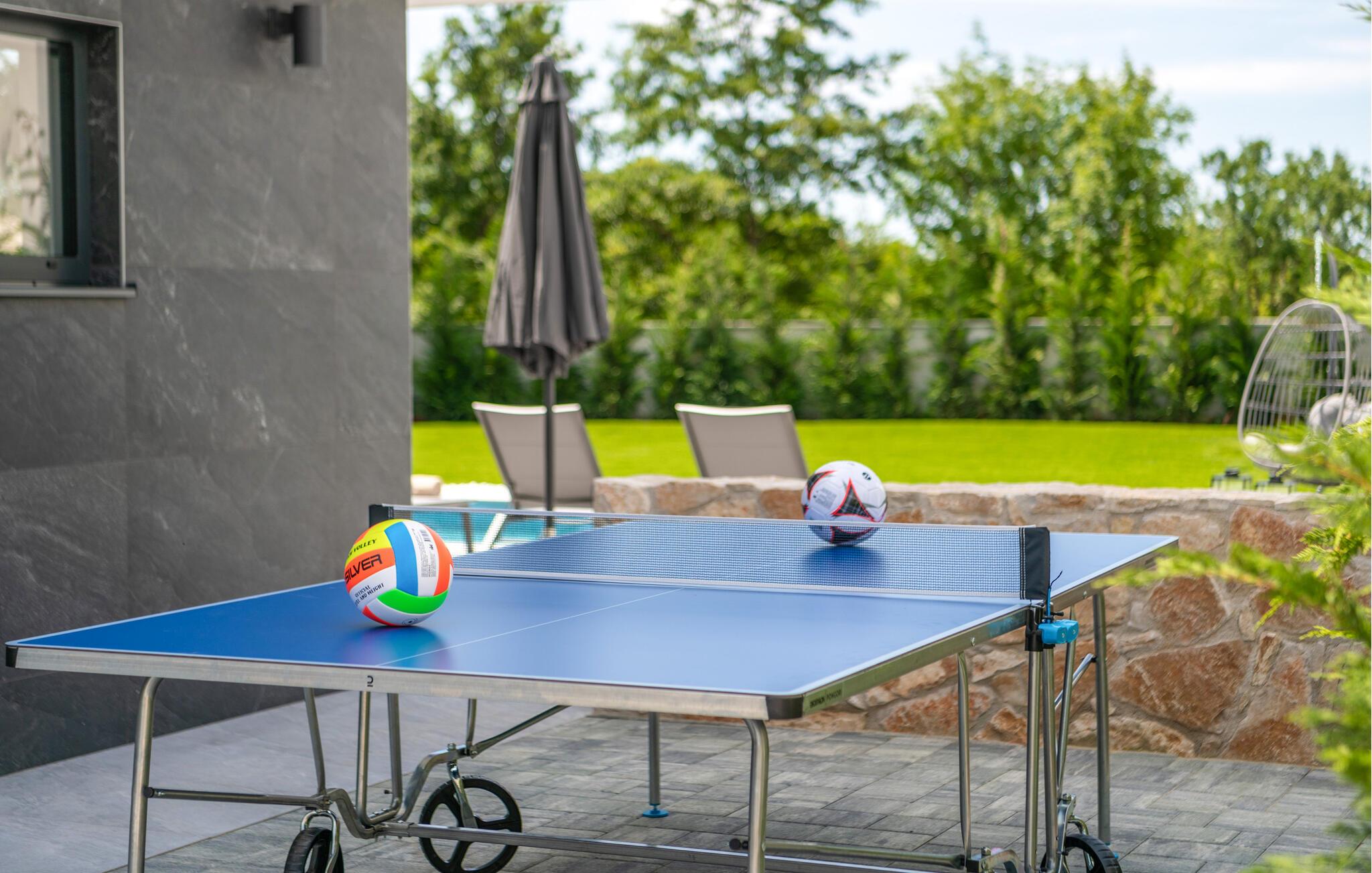 Denne eksklusive ejendom i Zminj-Modrusani giver jer alle de faciliteter, I har brug for til et uforglemmeligt ophold. Den velholdte græsplæne er understøttet af et effektivt kunstvandingssystem, så haven ser altid frisk ud, og den opvarmede pool lægger op til at slappe af. Begynd jeres feriedage med en forfriskende svømmetur i poolen og nyd derefter morgenmaden i det moderne sommerkøkken, som er udstyret med et integreret tv. Her kan I tilberede jeres måltider i en hyggelig atmosfære og samtidig nyde omgivelsernes skønhed.