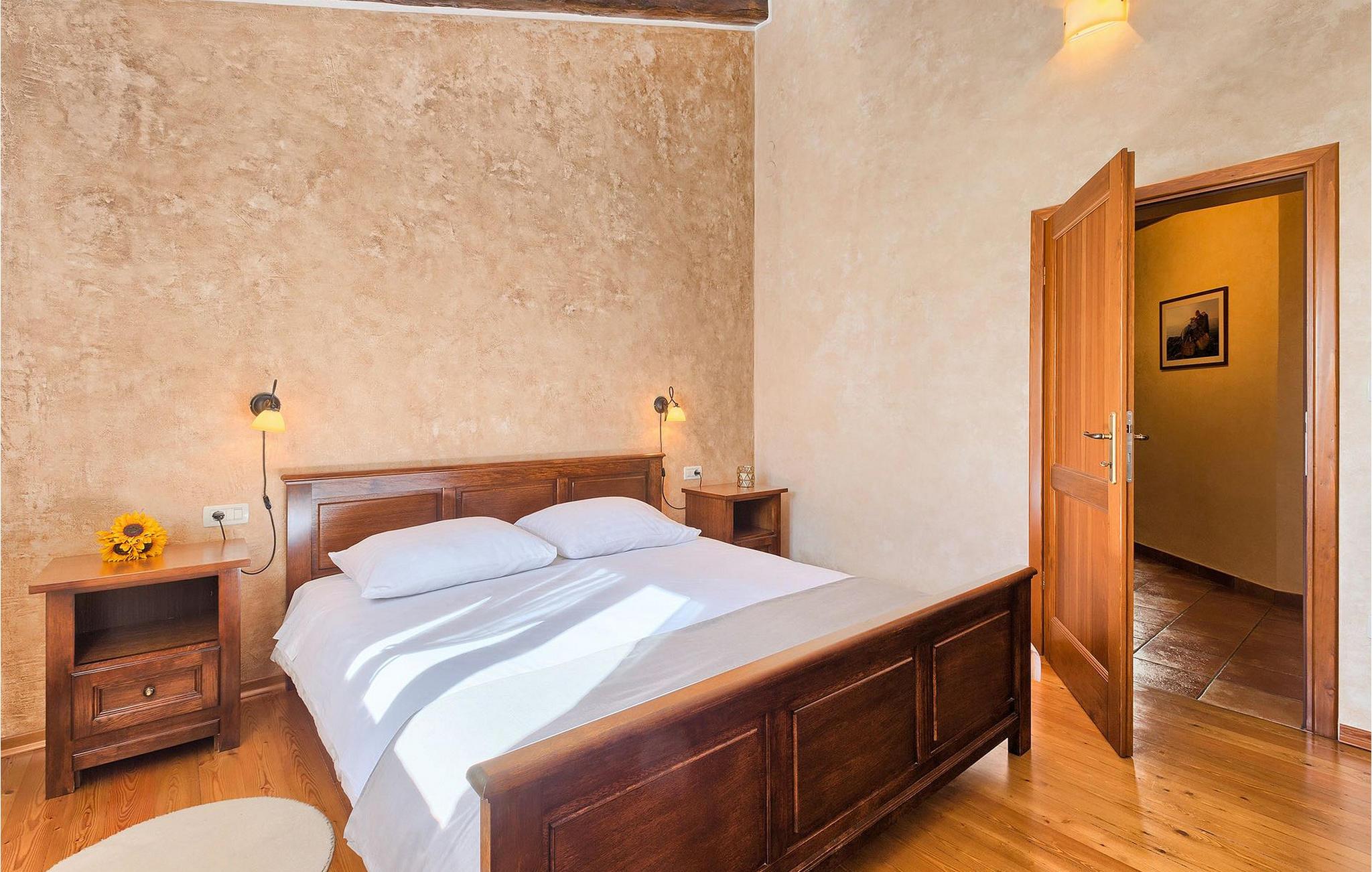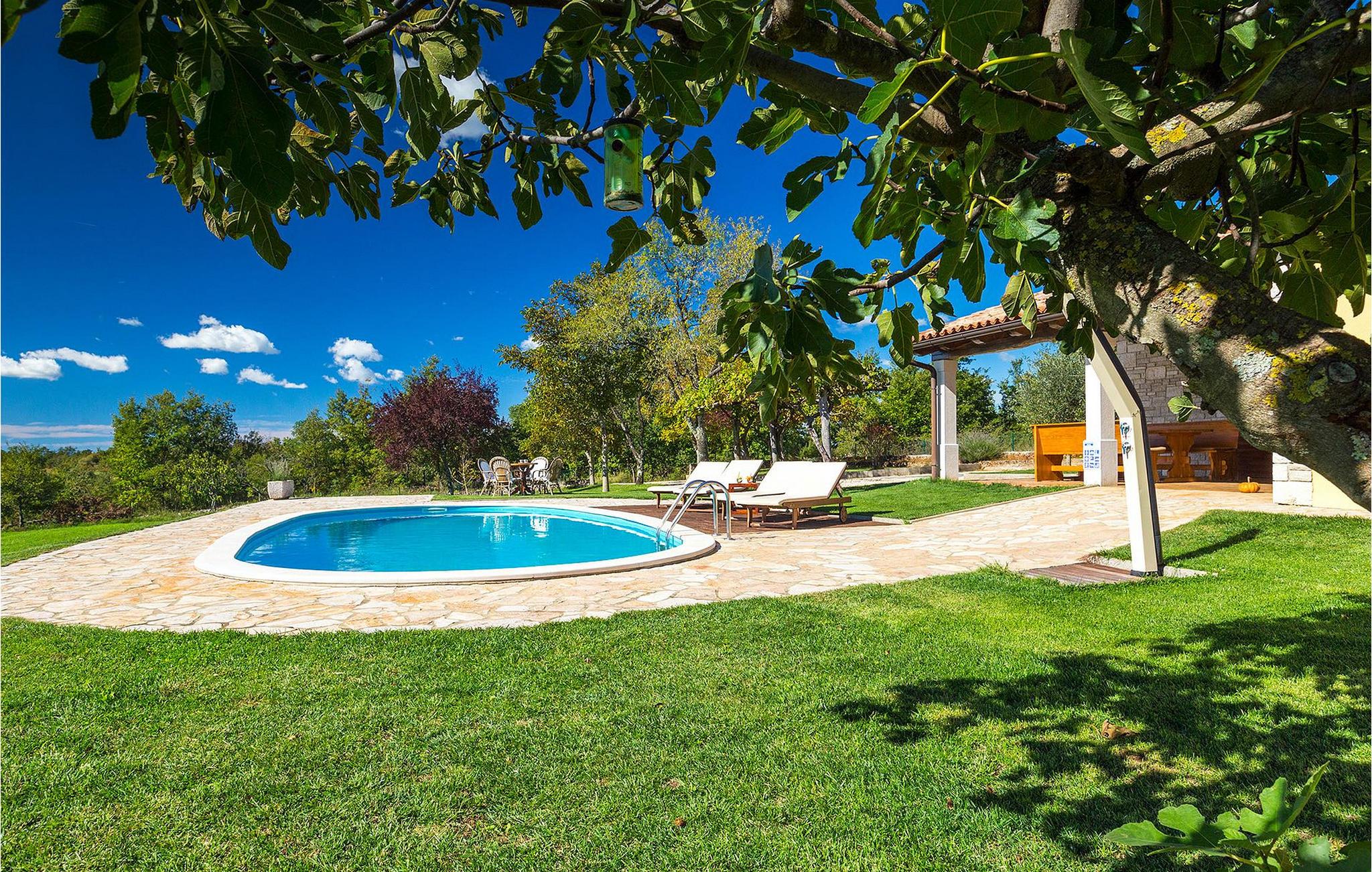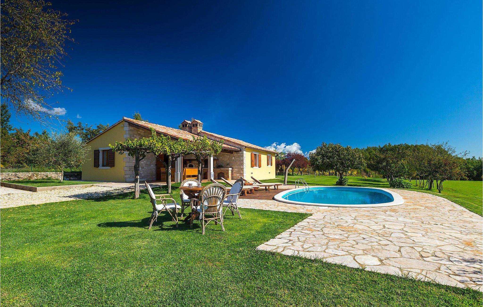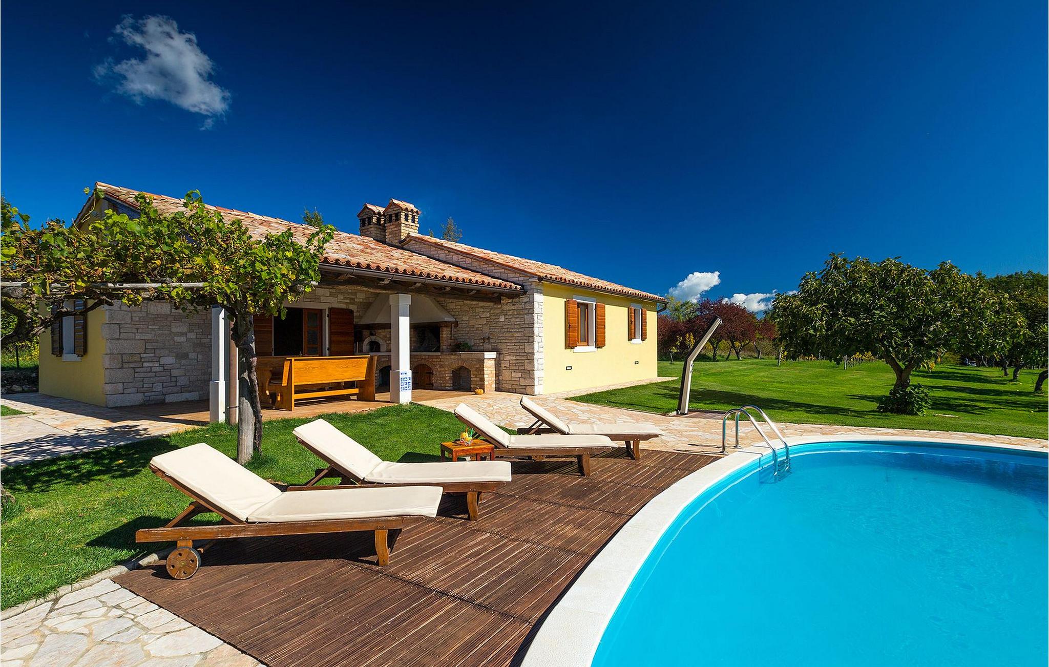 Den charmerende Villa Fiore ligger på en 12.000 kvm stor grund, omgivet af enge og skove og tilbyder fuldstændig privatliv og ro - ideel til en familieferie. Udenfor finder du en rummelig privat pool, hvor du virkelig kan slappe af, mens du nyder den smukke udsigt over den fortryllende natur. Der er liggestole omkring poolen, hvor du kan solbade eller slappe af efter en svømmetur i poolen. På den overdækkede terrasse er der stor grill og bageovn samt spisebord, hvor I kan slappe af med familien om aftenen. Villaen kan rumme i alt 6 gæster, fordelt på 130 kvadratmeter og alle værelser ligger i stueetagen. Interiøret byder på en behagelig atmosfære, der vil få dig til at føle dig hjemme. I den åbne plan stue og spisestue finder du en sofa, et tv og en åben pejs samt et fuldt udstyret køkken og et spisebord. Villaen har to komfortabelt indrettede soveværelser og hvert soveværelse har sit eget badeværelse. Det ene værelse har en dobbeltseng og det andet har 2 enkeltsenge. Book Villa Fiore og tilbring en fredelig ferie omgivet af uberørt natur! Hvis alle veje i Europa fører til Rom, så fører alle veje i Istrien til Zminj, centrum af Istrien og det gamle vejkryds. Villaen ligger lige uden for Zminj, og den er ideelt placeret for at udforske regionen. Du finder alle faciliteter, butikker, restauranter osv. der. Selve villaen ligger i et isoleret og perfekt afslappende sted... så ideel, hvis du værdsætter privatliv og fred og ro... Kysten med de store turistcentre er kun en kort køretur væk, ligesom Pula lufthavn. Istrien er godt forbundet og har et fremragende og uoverfyldt vejsystem.