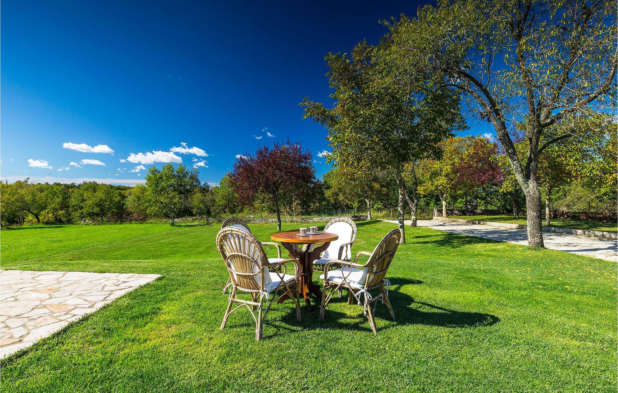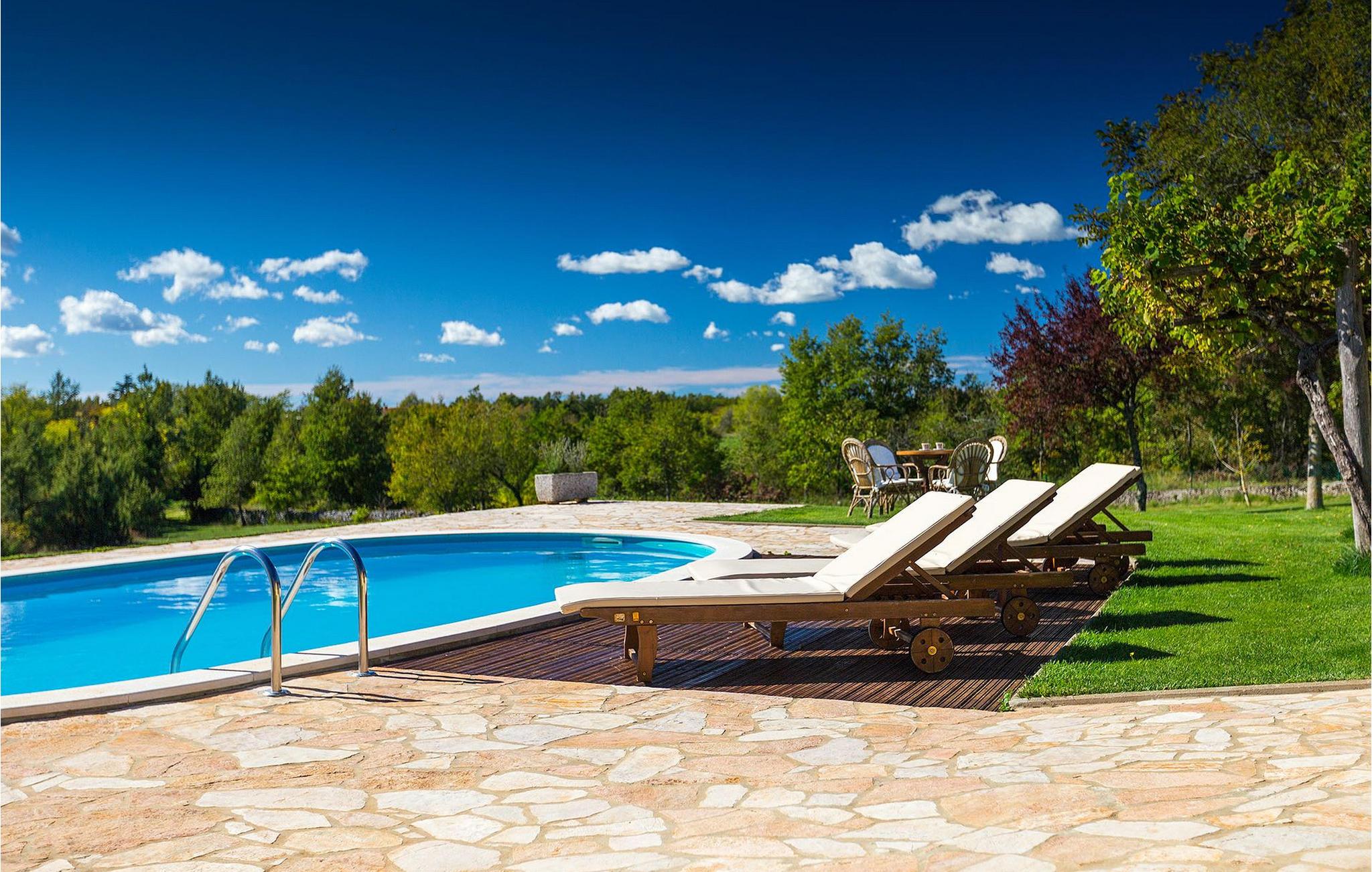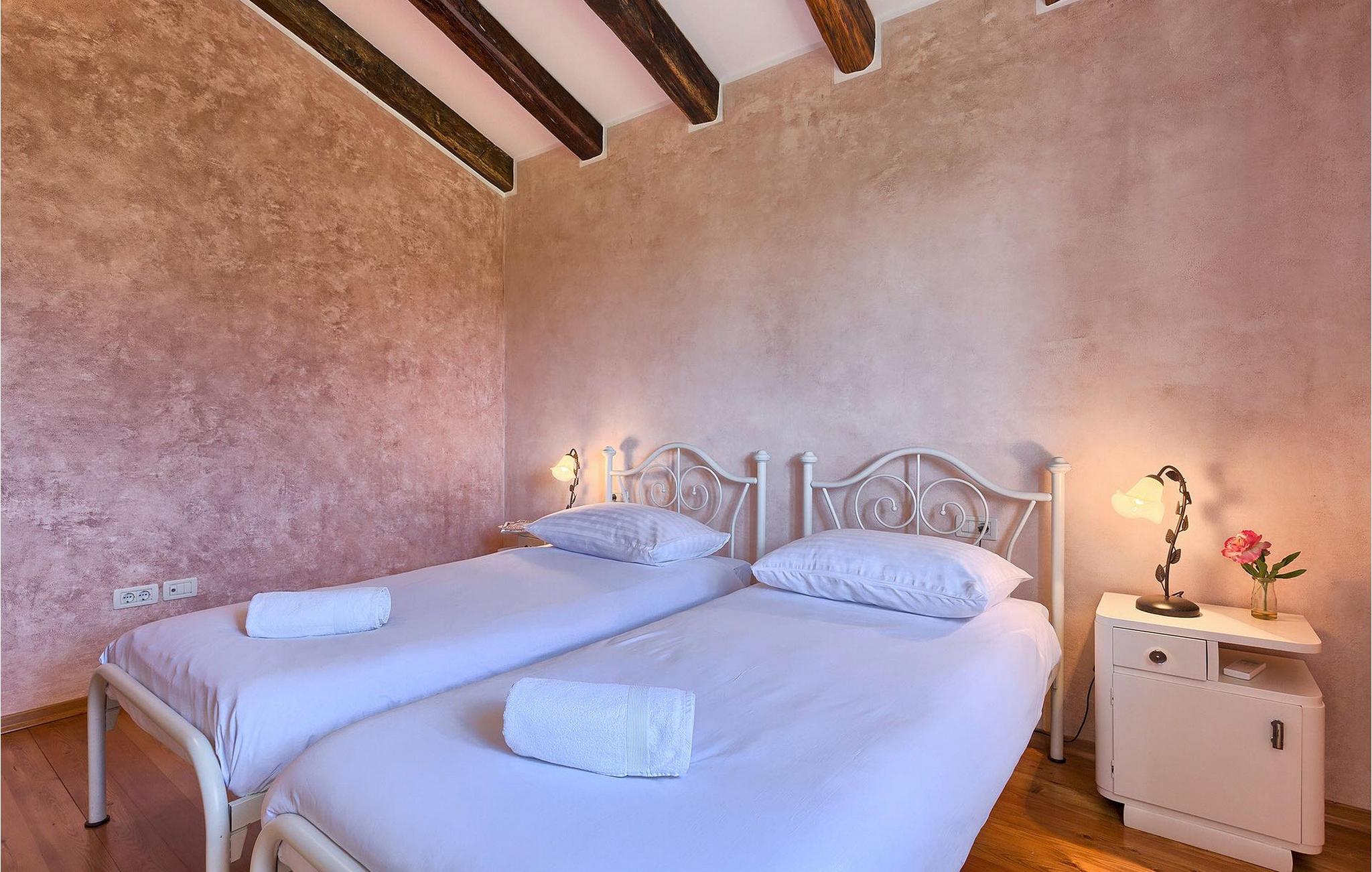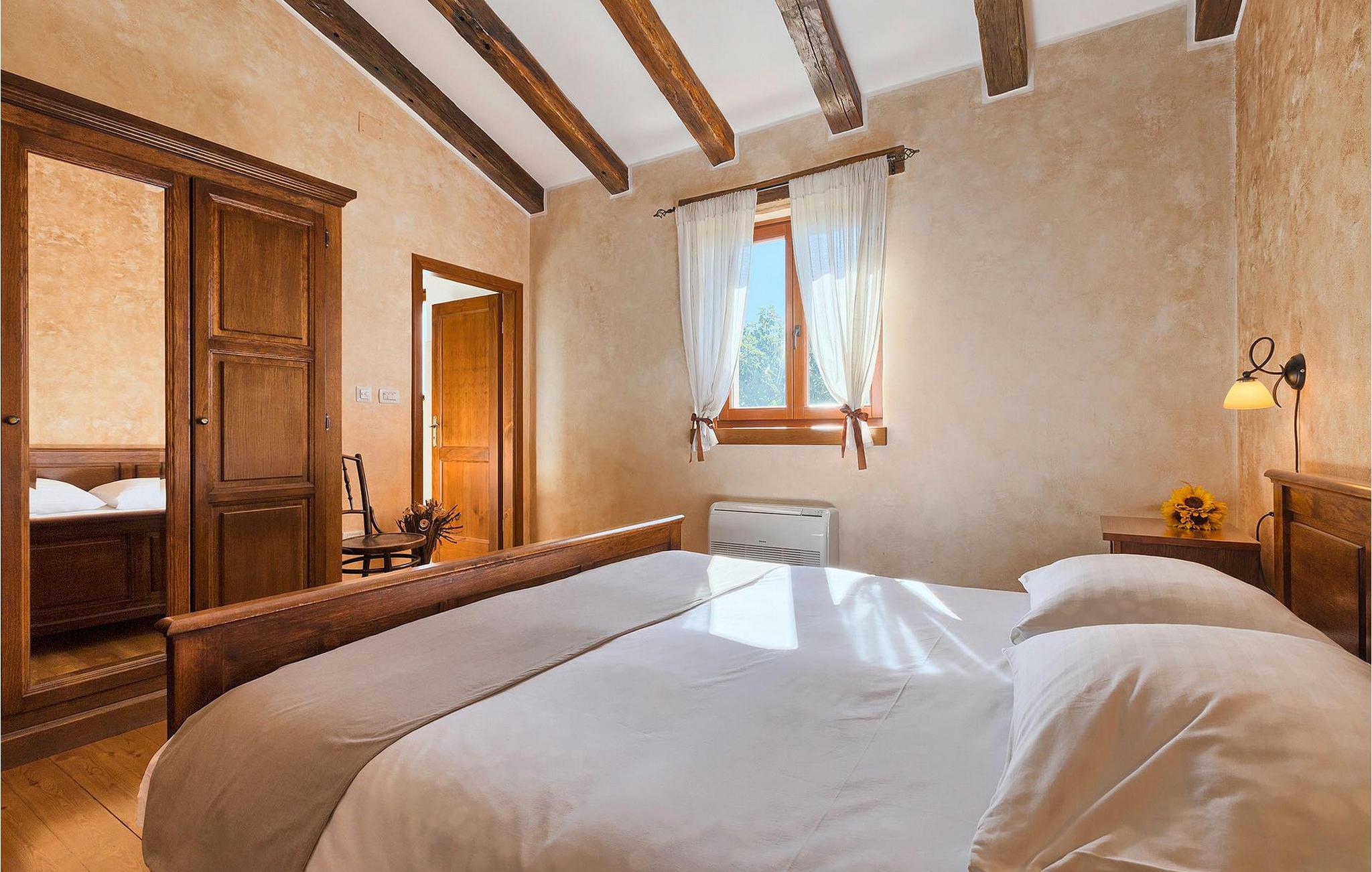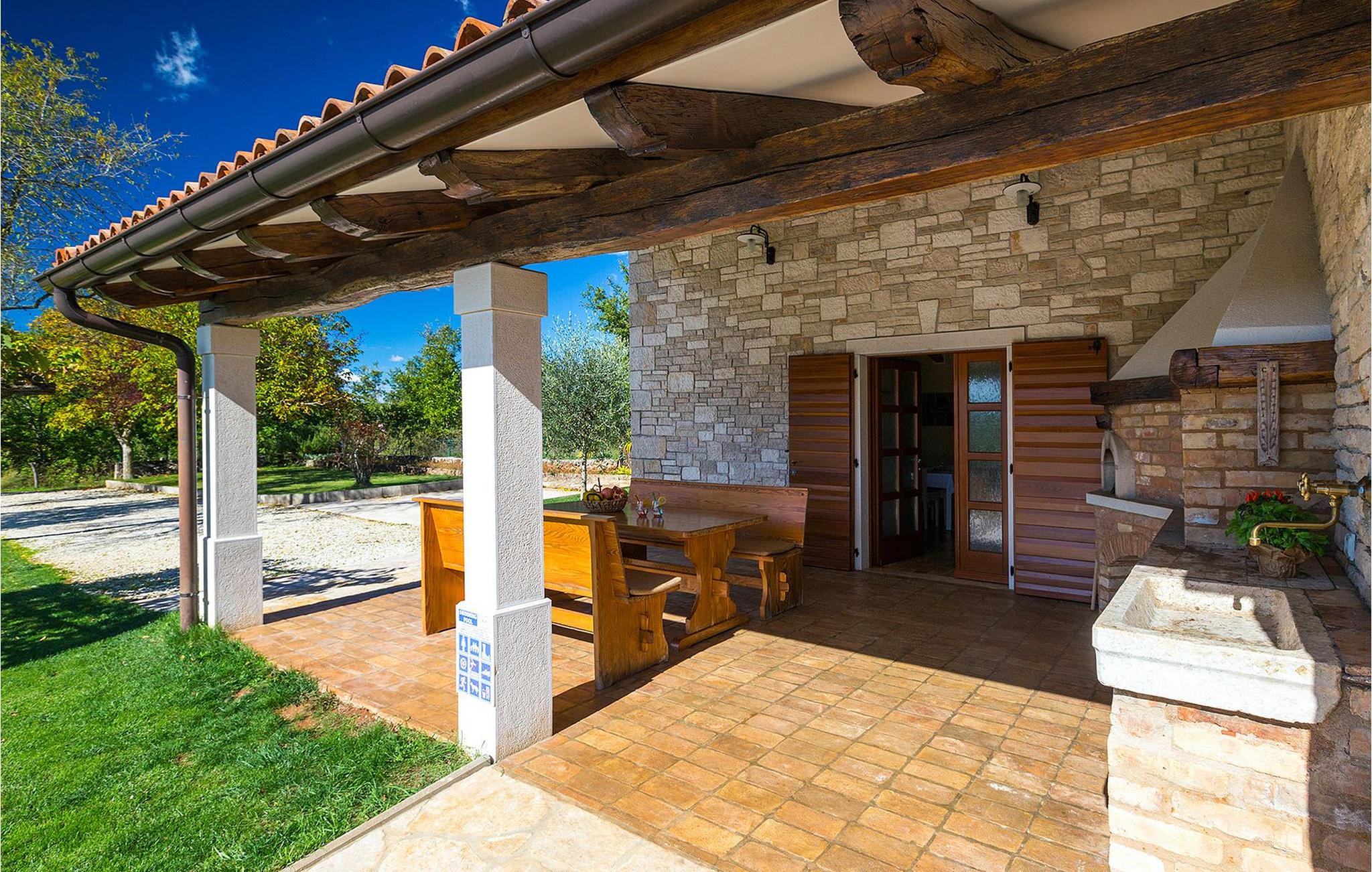 Den charmerende Villa Fiore ligger på en 12.000 kvm stor grund, omgivet af enge og skove og tilbyder fuldstændig privatliv og ro - ideel til en familieferie. Udenfor finder du en rummelig privat pool, hvor du virkelig kan slappe af, mens du nyder den smukke udsigt over den fortryllende natur. Der er liggestole omkring poolen, hvor du kan solbade eller slappe af efter en svømmetur i poolen. På den overdækkede terrasse er der stor grill og bageovn samt spisebord, hvor I kan slappe af med familien om aftenen. Villaen kan rumme i alt 6 gæster, fordelt på 130 kvadratmeter og alle værelser ligger i stueetagen. Interiøret byder på en behagelig atmosfære, der vil få dig til at føle dig hjemme. I den åbne plan stue og spisestue finder du en sofa, et tv og en åben pejs samt et fuldt udstyret køkken og et spisebord. Villaen har to komfortabelt indrettede soveværelser og hvert soveværelse har sit eget badeværelse. Det ene værelse har en dobbeltseng og det andet har 2 enkeltsenge. Book Villa Fiore og tilbring en fredelig ferie omgivet af uberørt natur! Hvis alle veje i Europa fører til Rom, så fører alle veje i Istrien til Zminj, centrum af Istrien og det gamle vejkryds. Villaen ligger lige uden for Zminj, og den er ideelt placeret for at udforske regionen. Du finder alle faciliteter, butikker, restauranter osv. der. Selve villaen ligger i et isoleret og perfekt afslappende sted... så ideel, hvis du værdsætter privatliv og fred og ro... Kysten med de store turistcentre er kun en kort køretur væk, ligesom Pula lufthavn. Istrien er godt forbundet og har et fremragende og uoverfyldt vejsystem.
