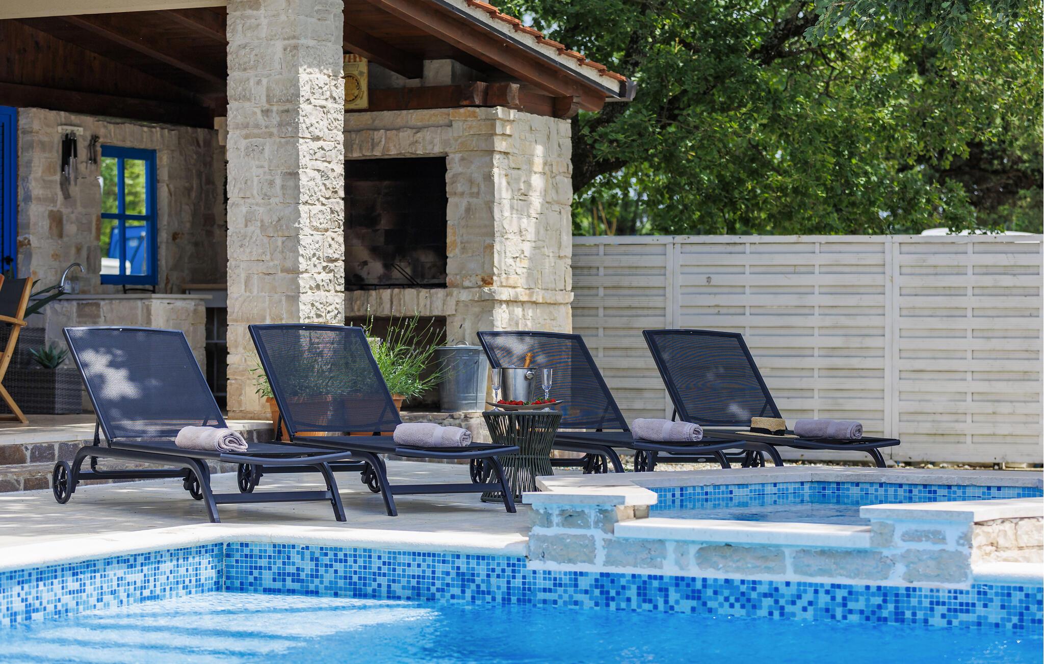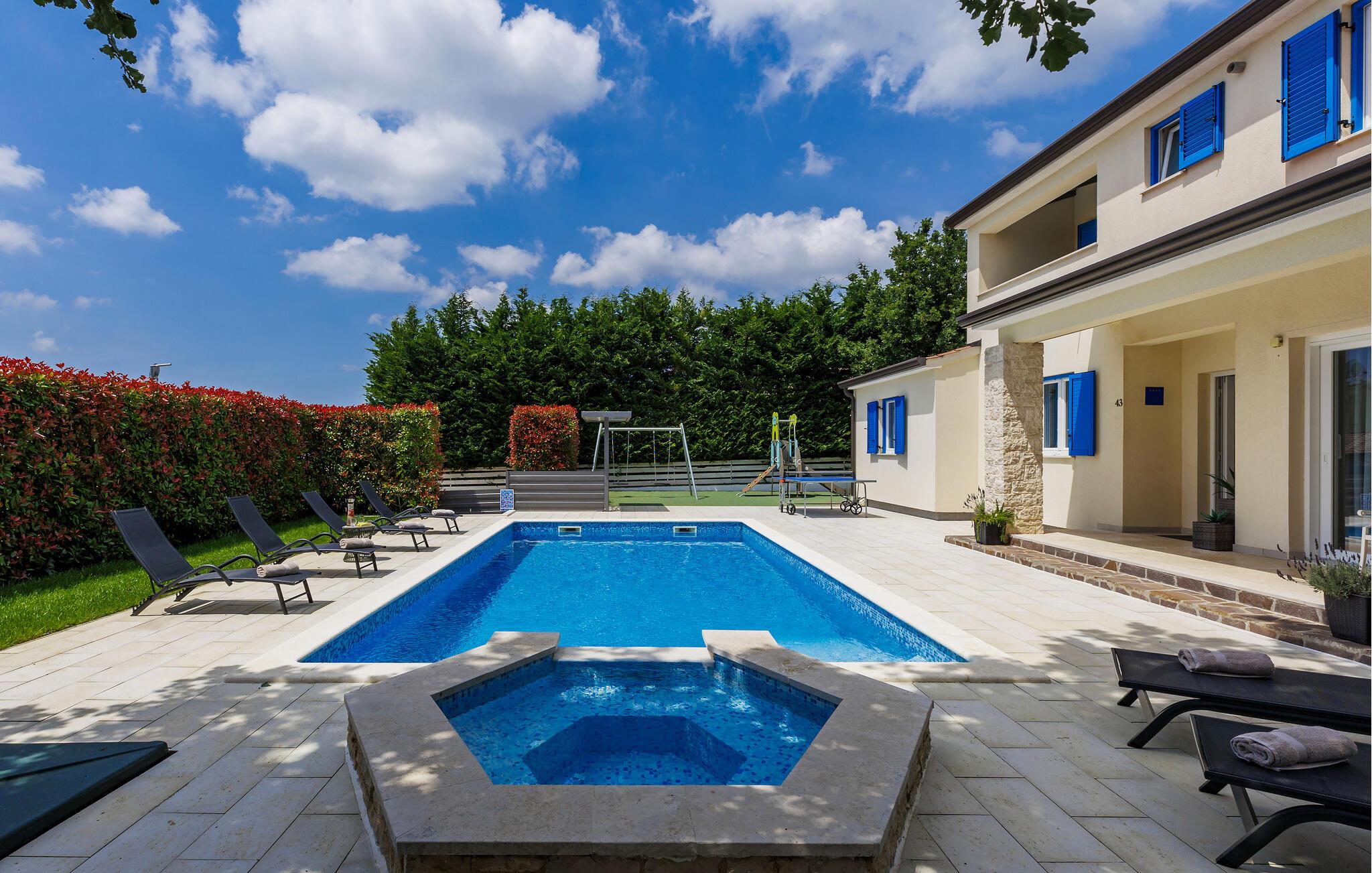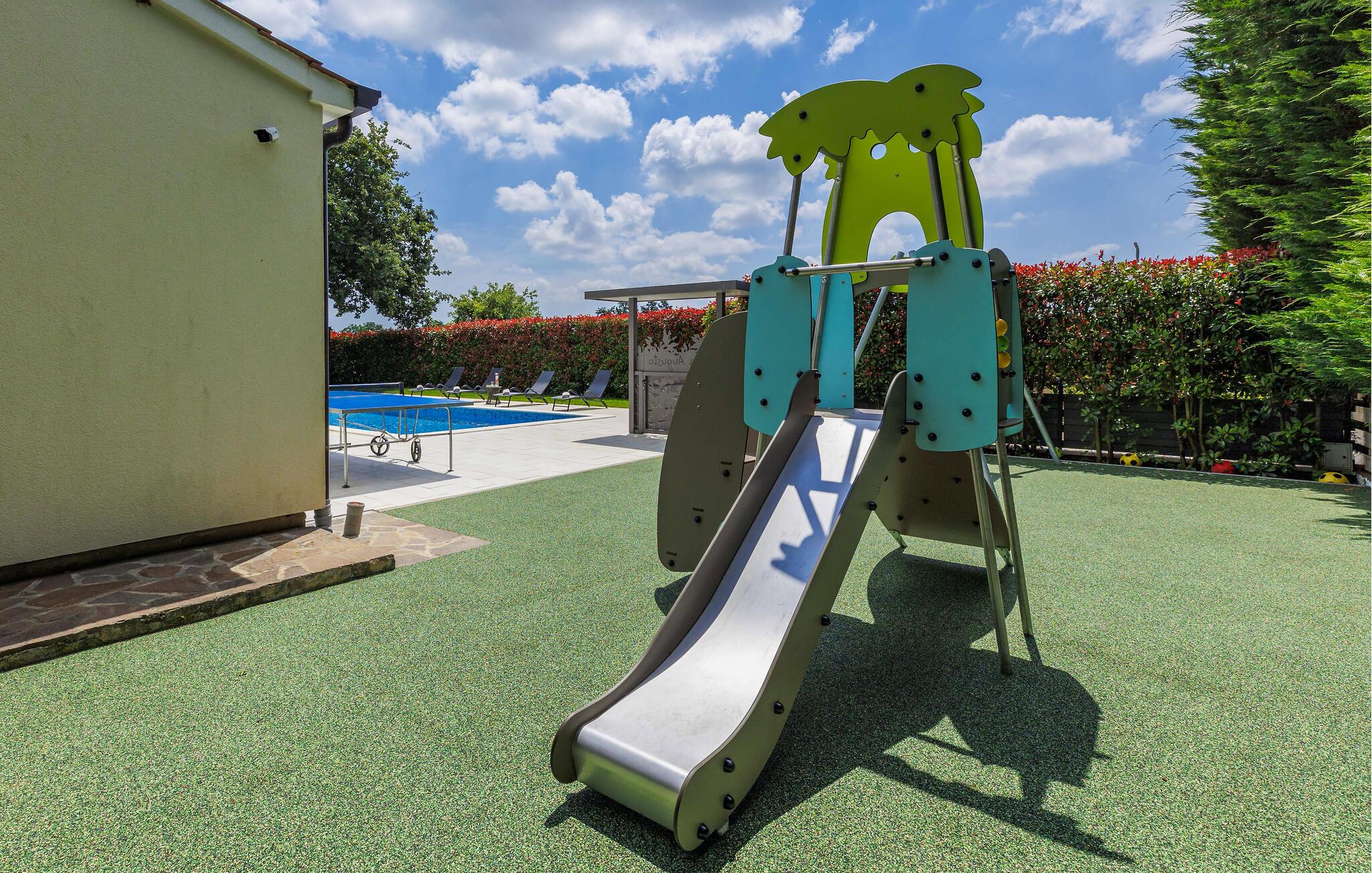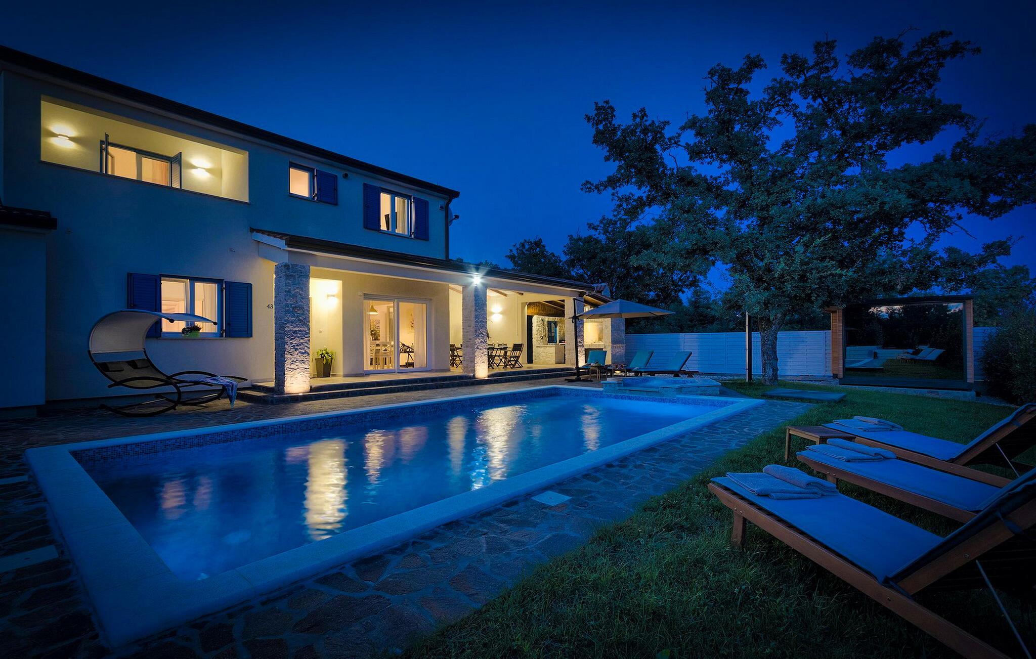 Luksuriøs og rolig beliggenhed midt i uspoleret natur – hvis det lyder som jeres drømmeferie, så kunne Villa Augusta være ideel til dig! Denne fantastiske ejendom har i alt 5 soveværelser og kan rumme op til 12 gæster. I hjertet af udendørsområdet ligger den store, indbydende swimmingpool, den perfekte løsning til varme sommerdage. Nyd solen ved poolen, mens børnene løber rundt i haven eller hopper på trampolinen. For at forbedre oplevelsen er der også en sauna med udsigt over poolen. Hvis I nyder at spise under åben himmel, har villaen også en kulgrill og et udendørs spiseområde. I den åbne stueetage, som tilbyder direkte adgang til terrassen og poolen, finder I den komfortable stue og et fuldt udstyret køkken. Tre soveværelser er også placeret i stueetagen, mens yderligere to soveværelser, hver med eget badeværelse, er placeret på første sal. Alle soveværelser har aircondition for at sikre jeres komfort. Book denne smukke villa og tilbring en dejlig ferie i Istrien! Villa Augusta ligger i Folici, en charmerende lille landsby nær Zminj i Istrien. Byen Zminj har altid spillet en vigtig rolle takket være sin centrale beliggenhed, der gør den let tilgængelig fra alle retninger. Denne beliggenhed er perfekt til gåture gennem uspoleret natur, mens sportsentusiaster også kan nyde vandreture eller cykling. Besøg middelalderbyen, beundre kirkerne, bymurene og tårnene og nyd atmosfæren. Den ældste festival i Istrien, Brtulja, finder sted i Zminj den sidste lørdag i august. Deltag i festivalen og smag lokale produkter som ost og prosciutto. I kan også købe håndlavet legetøj og souvenirs. Uanset hvor I tager hen, vil I blive budt velkommen af ??de lokale. Og hvis I føler jer eventyrlysten, er det krystalklare Adriaterhav med sine smukke strande samt store turistbyer kun en kort køretur fra villaen.