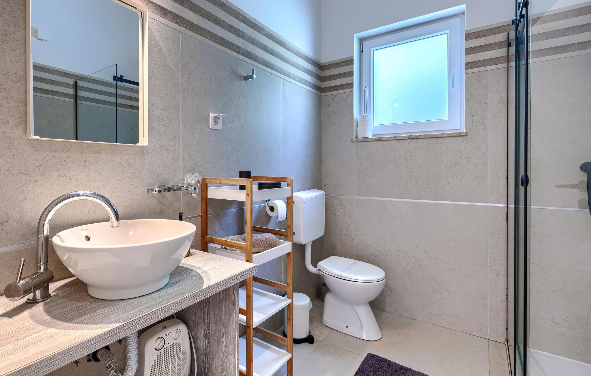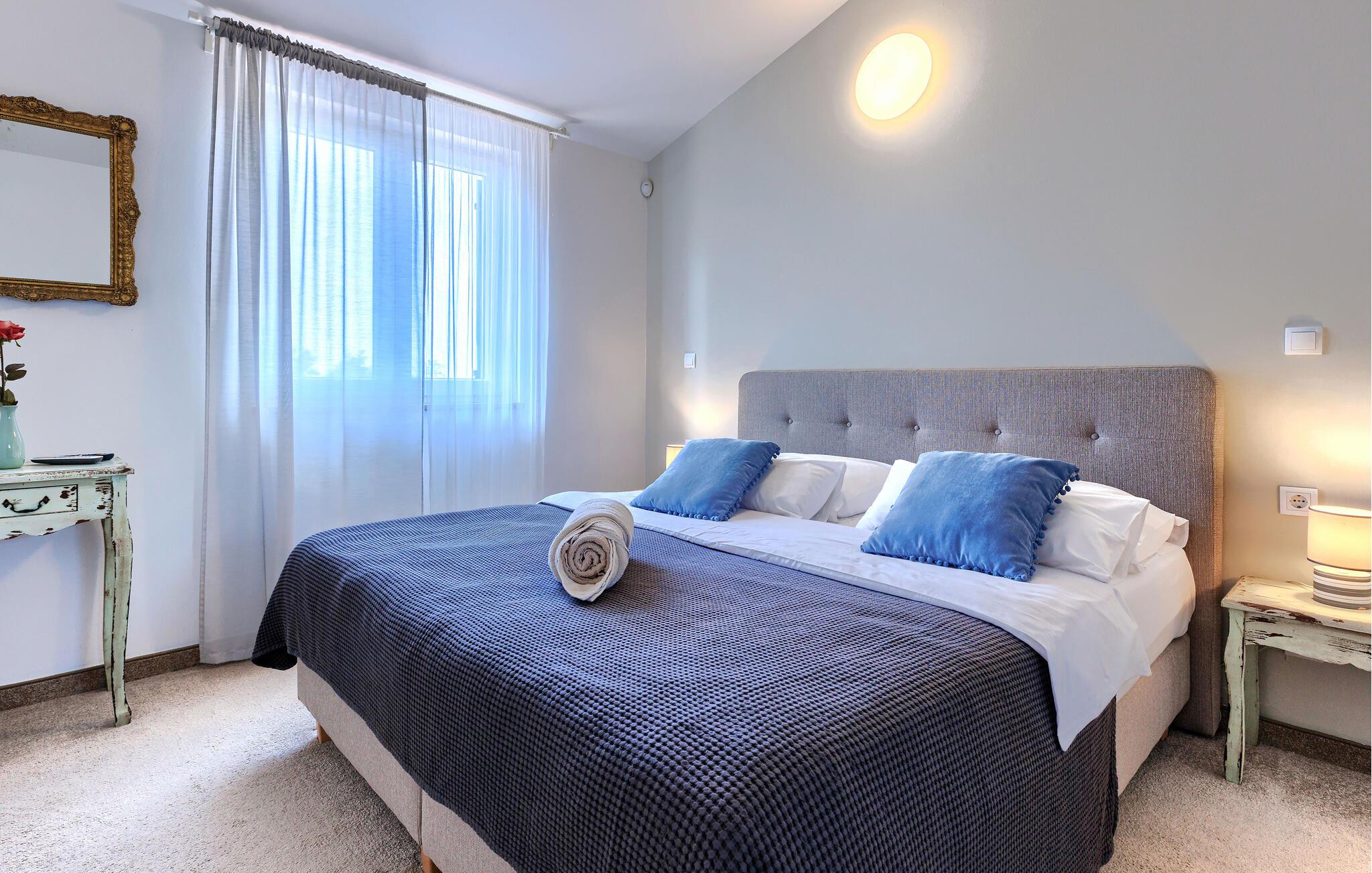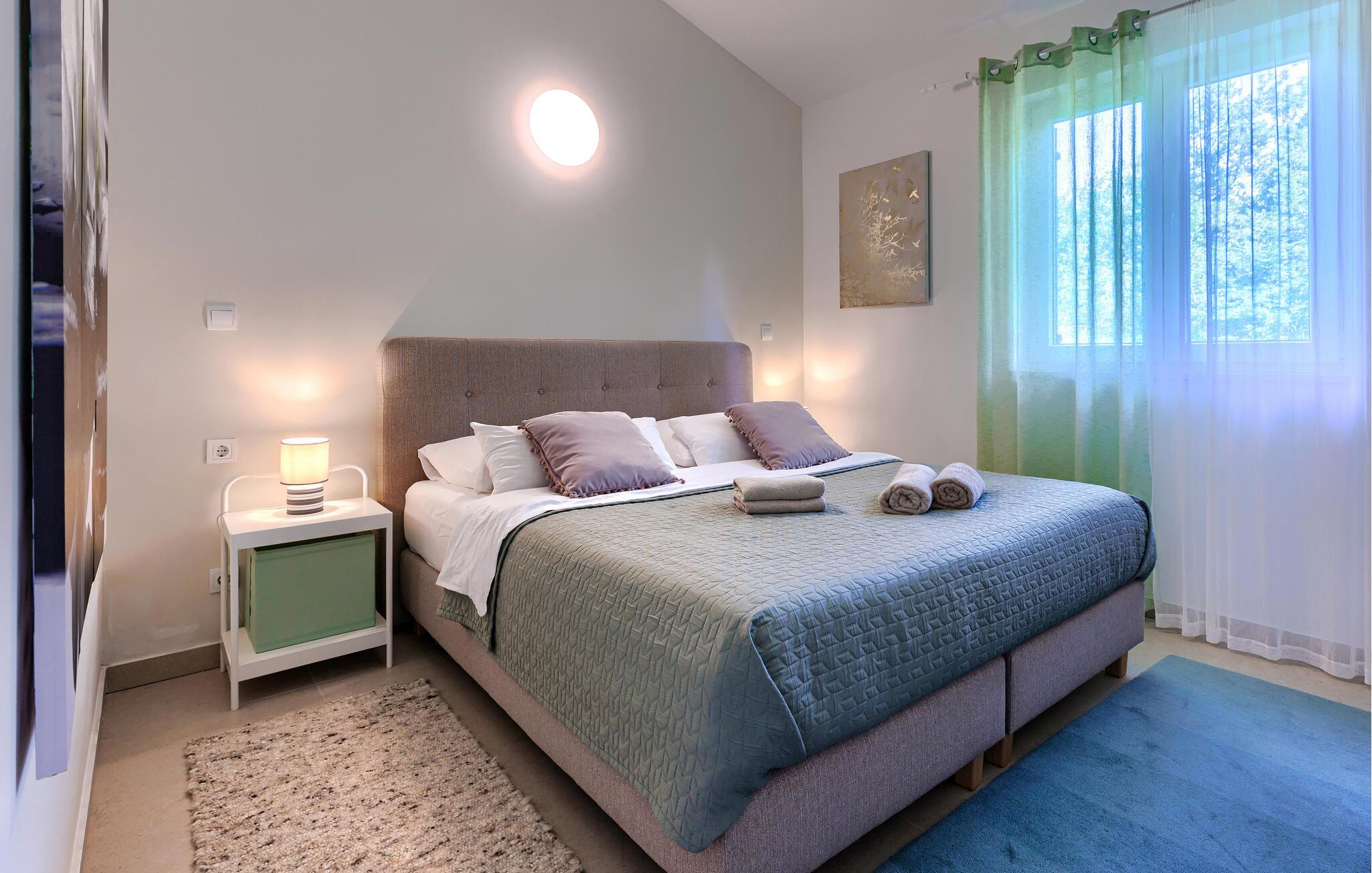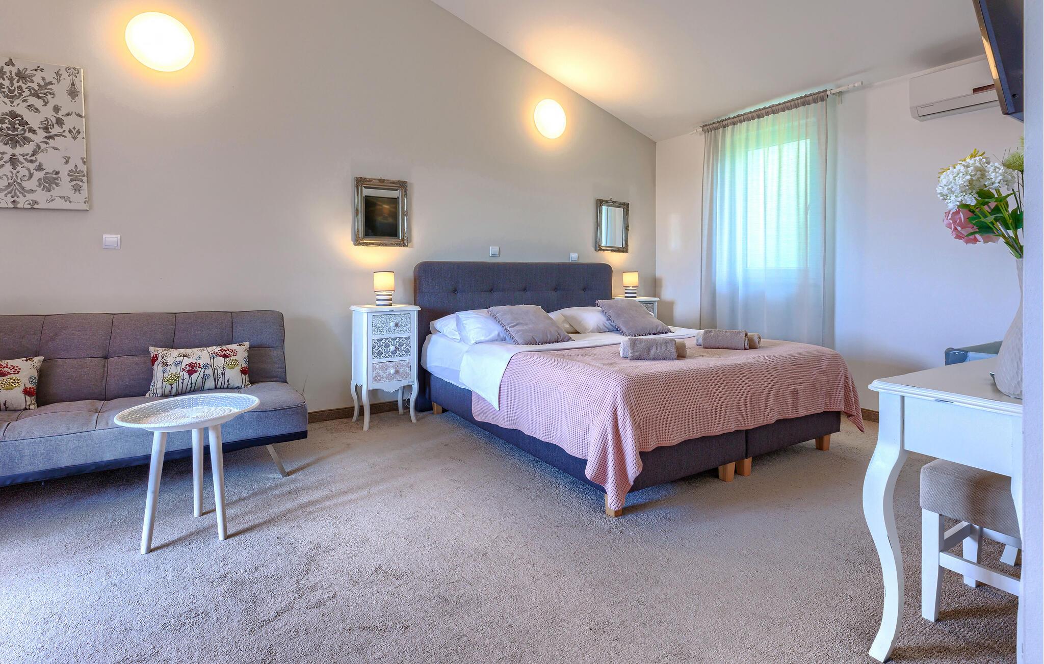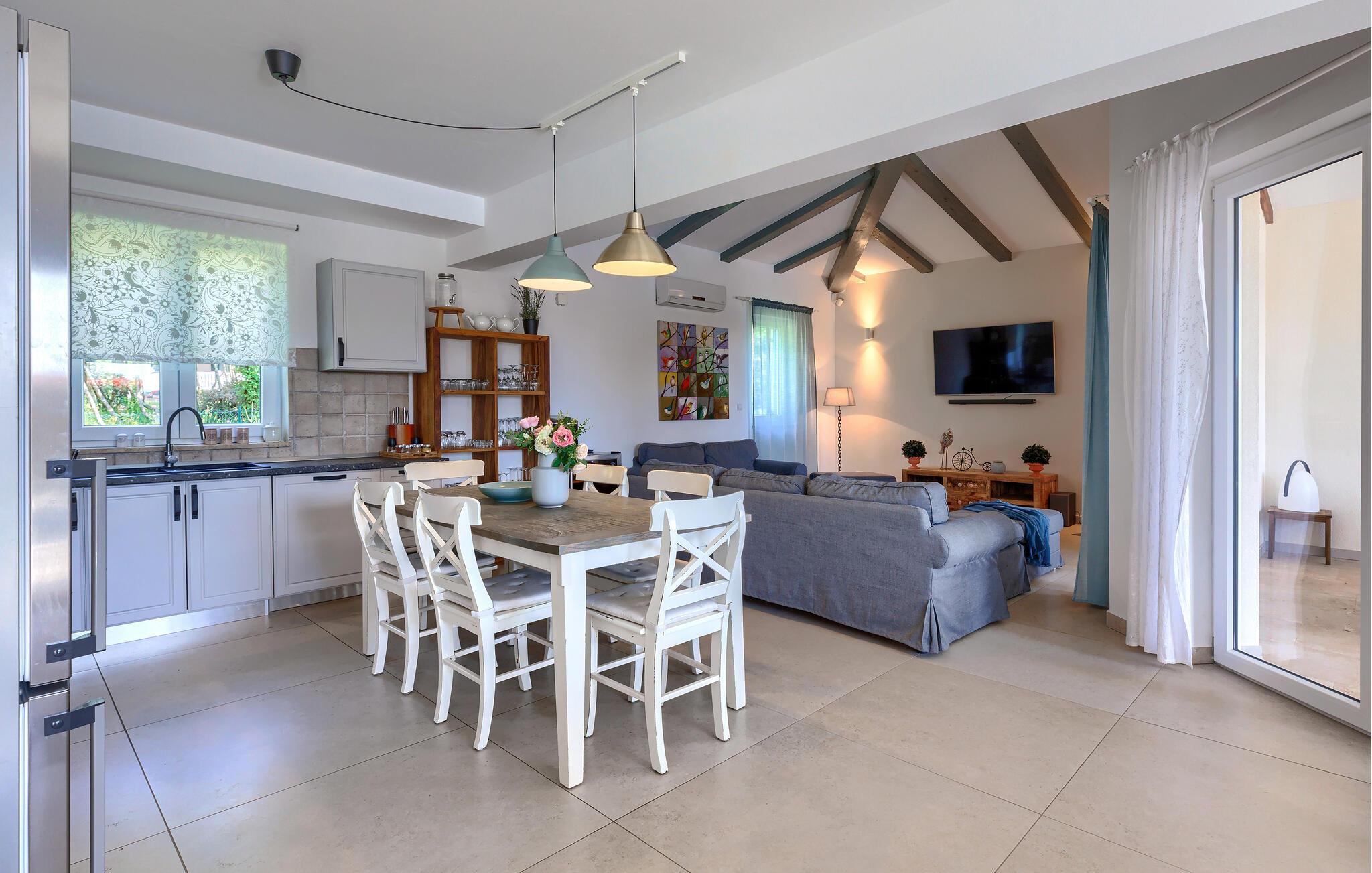 Luksuriøs og rolig beliggenhed midt i uspoleret natur – hvis det lyder som jeres drømmeferie, så kunne Villa Augusta være ideel til dig! Denne fantastiske ejendom har i alt 5 soveværelser og kan rumme op til 12 gæster. I hjertet af udendørsområdet ligger den store, indbydende swimmingpool, den perfekte løsning til varme sommerdage. Nyd solen ved poolen, mens børnene løber rundt i haven eller hopper på trampolinen. For at forbedre oplevelsen er der også en sauna med udsigt over poolen. Hvis I nyder at spise under åben himmel, har villaen også en kulgrill og et udendørs spiseområde. I den åbne stueetage, som tilbyder direkte adgang til terrassen og poolen, finder I den komfortable stue og et fuldt udstyret køkken. Tre soveværelser er også placeret i stueetagen, mens yderligere to soveværelser, hver med eget badeværelse, er placeret på første sal. Alle soveværelser har aircondition for at sikre jeres komfort. Book denne smukke villa og tilbring en dejlig ferie i Istrien! Villa Augusta ligger i Folici, en charmerende lille landsby nær Zminj i Istrien. Byen Zminj har altid spillet en vigtig rolle takket være sin centrale beliggenhed, der gør den let tilgængelig fra alle retninger. Denne beliggenhed er perfekt til gåture gennem uspoleret natur, mens sportsentusiaster også kan nyde vandreture eller cykling. Besøg middelalderbyen, beundre kirkerne, bymurene og tårnene og nyd atmosfæren. Den ældste festival i Istrien, Brtulja, finder sted i Zminj den sidste lørdag i august. Deltag i festivalen og smag lokale produkter som ost og prosciutto. I kan også købe håndlavet legetøj og souvenirs. Uanset hvor I tager hen, vil I blive budt velkommen af ??de lokale. Og hvis I føler jer eventyrlysten, er det krystalklare Adriaterhav med sine smukke strande samt store turistbyer kun en kort køretur fra villaen.