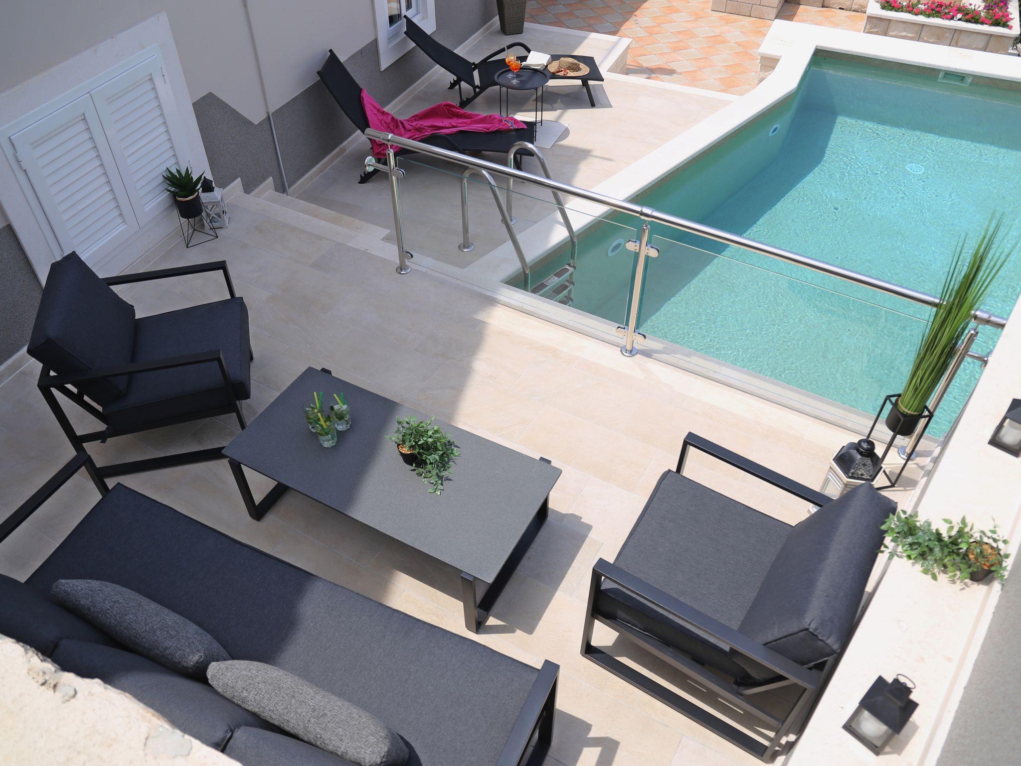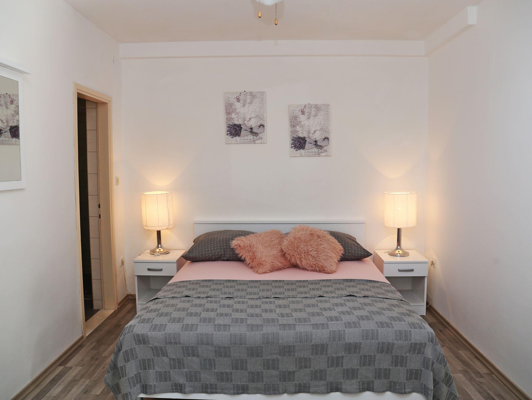 Ferienwohnung bietet Platz für 6 Gäste. Die Betten sind in Schlafzimmern, die es 3 gibt, innerhalb einer Gesamtfläche von 66m2, angeordnet. Die Gäste haben eine eigene Terrasse zur Verfügung, auf der sie in warmen Sommernächten genießen können. Das Apartment bietet Meerblick. Es ist erlaubt, Speisen auf dem Gemeinschafts-Grill vorzubereiten. Während ihres Aufenthalts können sich Gäste im privaten Schwimmbad entspannen. Räume der gebuchten Unterkunftseinheit werden nicht in eine Ganze verbunden. IM PREIS INBEGRIFFEN: Kurtaxe, Endreinigung, Klimatisierung, Pool, Parkplatz, Internet, Wäschewaschen, Bootsanlegeplatz, Kinderbett, Zusatzbett, Bügeleisen, Bügelbrett, Föhn, Sonnenschirm, Liegestühle. Die Verfügbarkeit zusätzlicher Dienstleistungen in Ihrem reservierten Termin und die Preise derselben (falls nicht aufgeführt) müssen im Voraus überprüft werden. Zusätzliche Dienstleistungen die in der Zahlungsaufforderung nicht aufgeführt sind werden direkt beim Vermieter bezahlt, angenommen der Gast nutzt auch diese.