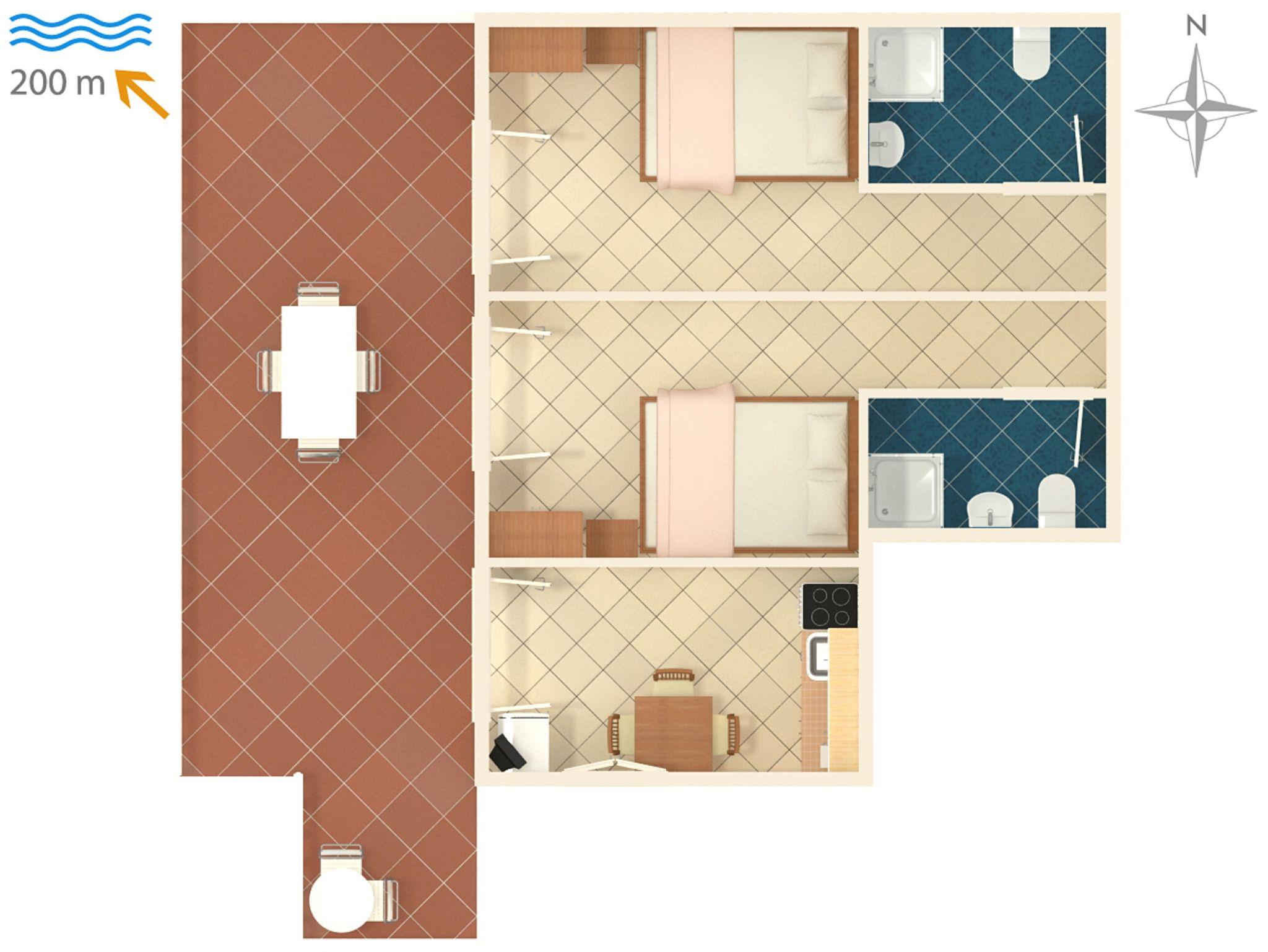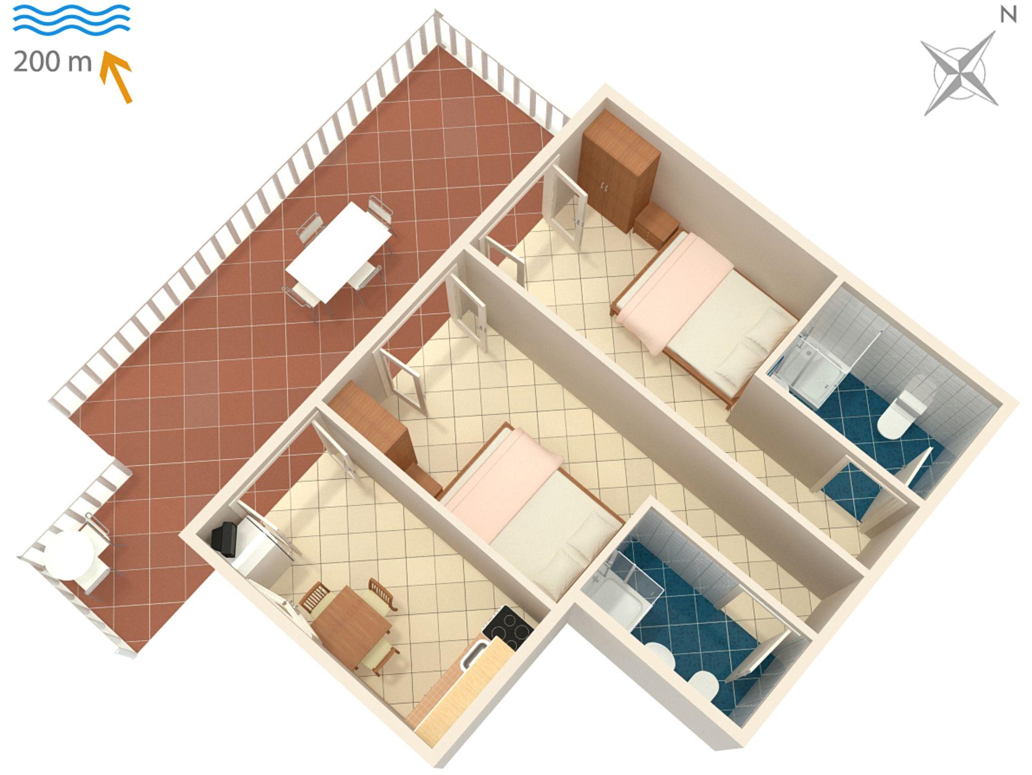 Ferienwohnung bietet Platz für 4 Gäste. Die Betten sind in Schlafzimmern, die es 2 gibt, innerhalb einer Gesamtfläche von 33m2, angeordnet. Die Gäste haben eine eigene Terrasse zur Verfügung, auf der sie in warmen Sommernächten genießen können. Das Apartment bietet Meerblick. Es ist erlaubt, Speisen auf dem Gemeinschafts-Grill vorzubereiten. Räume der gebuchten Unterkunftseinheit werden nicht in eine Ganze verbunden. IM PREIS INBEGRIFFEN: Kurtaxe, Endreinigung, Klimatisierung, Parkplatz, Internet. Die Verfügbarkeit zusätzlicher Dienstleistungen in Ihrem reservierten Termin und die Preise derselben (falls nicht aufgeführt) müssen im Voraus überprüft werden. Zusätzliche Dienstleistungen die in der Zahlungsaufforderung nicht aufgeführt sind werden direkt beim Vermieter bezahlt, angenommen der Gast nutzt auch diese.