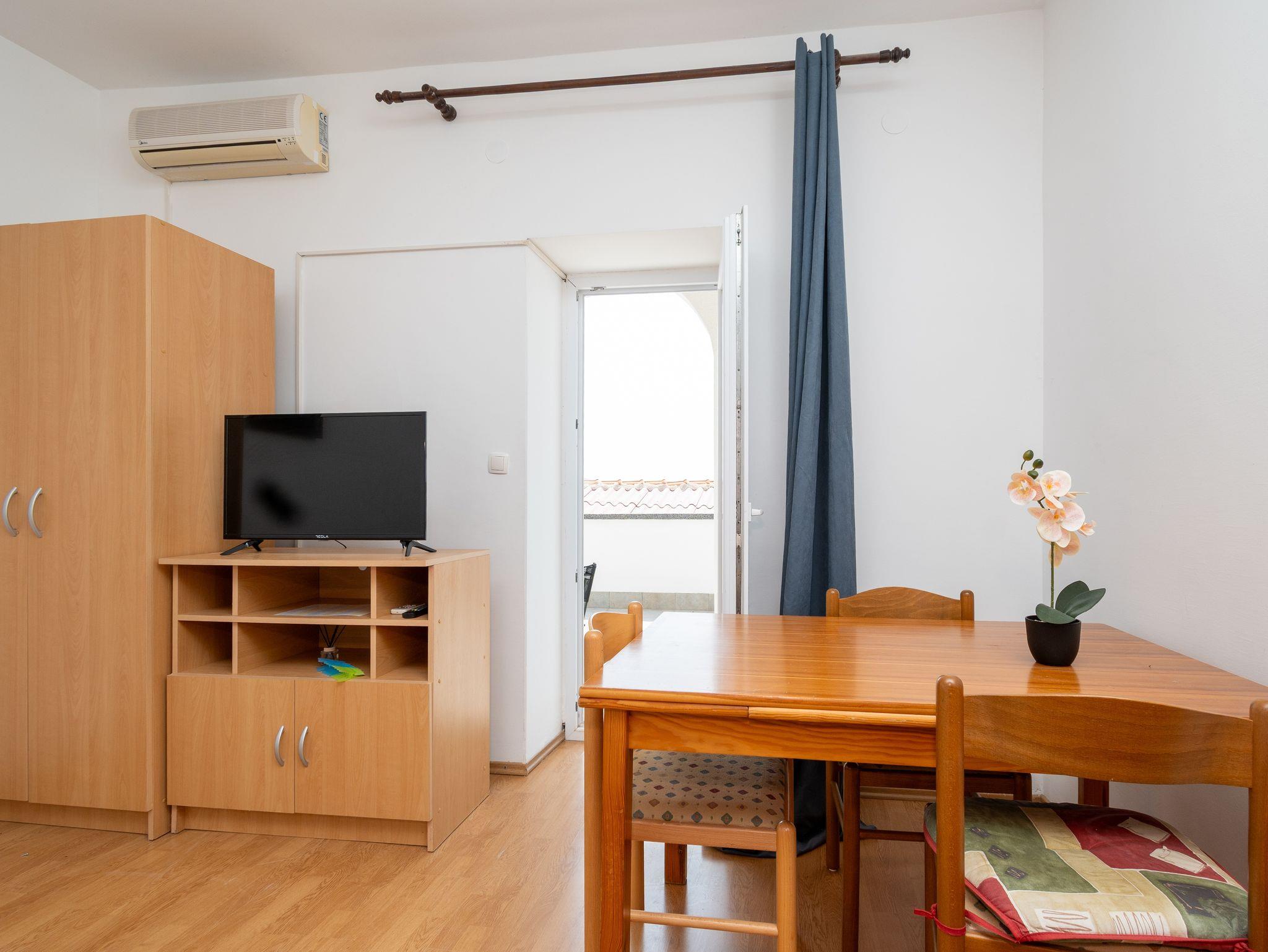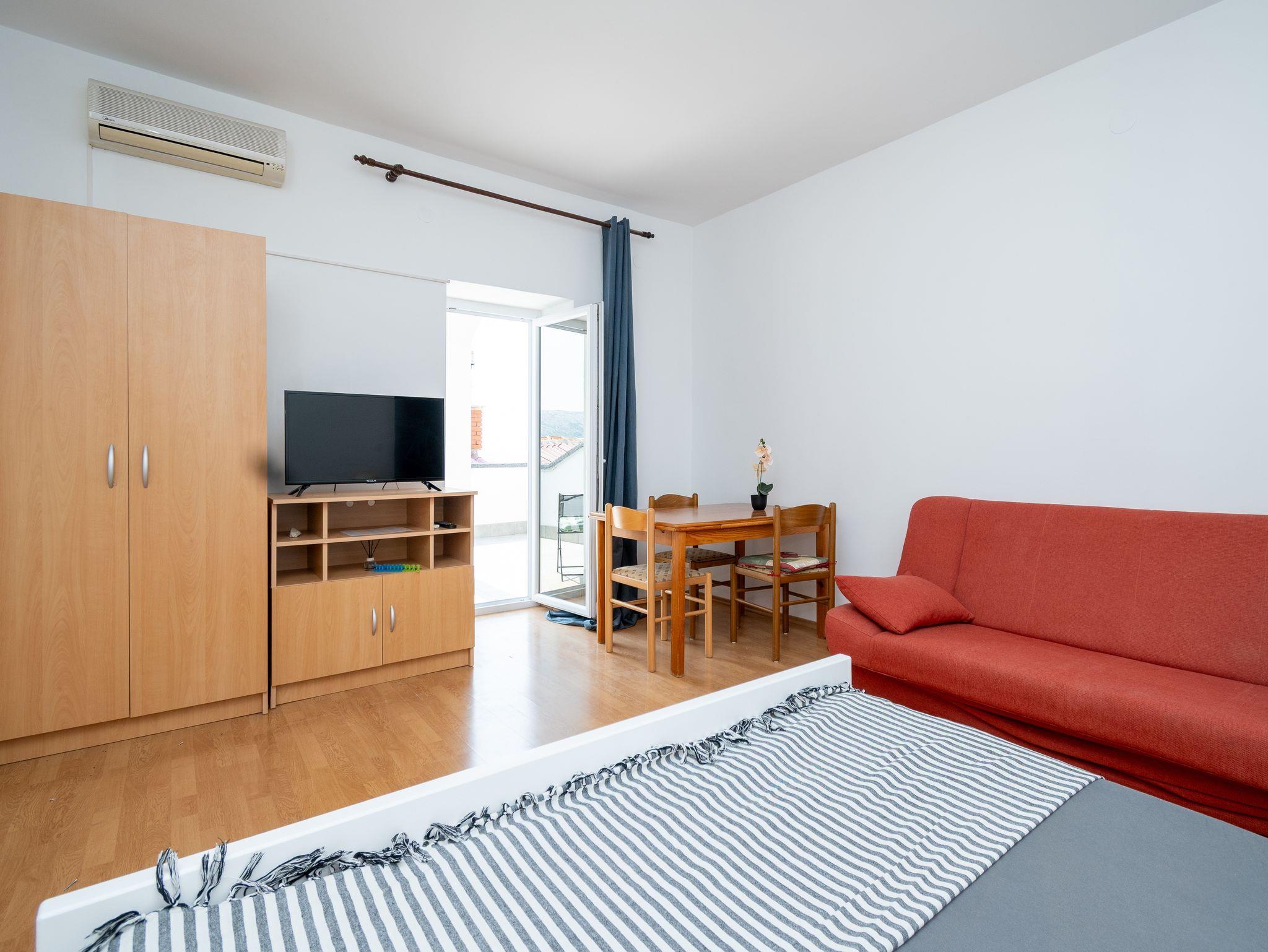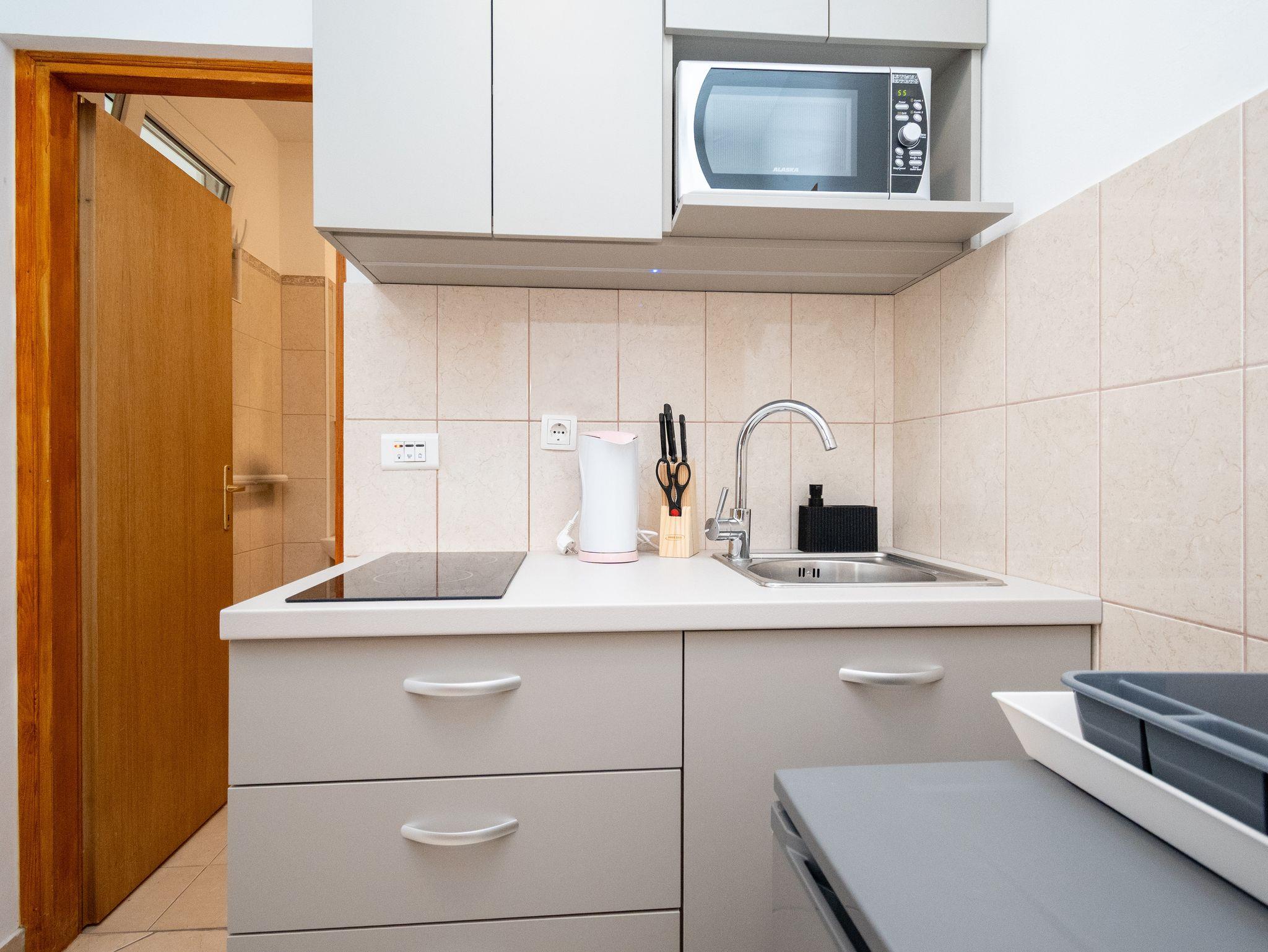 Studio bietet Platz für 2 Gäste. Die Betten sind in Schlafzimmern, die es 1 gibt, innerhalb einer Gesamtfläche von 28m2, angeordnet. Die Gäste haben eine eigene Terrasse zur Verfügung, auf der sie in warmen Sommernächten genießen können. Das Studio-Apartment bietet Meerblick. Es ist erlaubt, Speisen auf dem Gemeinschafts-Grill vorzubereiten. Während ihres Aufenthalts können Gäste das gemeinsam zur Nutzung stehende Schwimmbad benutzen. In der Unterkunftseinheit besteht die Möglichkeit des Mitbringens von Haustieren, und die Dienstleistung ist im Preis der Unterkunft enthalten. In der gebuchten Unterkunftseinheit zahlt man am Ort ein Depositum ( der Preis ist an der Internetseite angeführt ). IM PREIS INBEGRIFFEN: Kurtaxe, Endreinigung, Klimatisierung, Pool, Parkplatz, Internet, Wäschewaschen, Haustiere, Fahrrad, Kinderbett, Bügeleisen, Bügelbrett, Föhn. VERBINDLICHE ZUSÄTZLICHE KOSTEN: Kaution (200,00 € Einmalzahlung), Aufzahlung für Kurzaufenthalte (prozentualer Zuschlag pro Nächtigungsanzahl: 30% - 1, 20% - 2, 10% - 3). Die Verfügbarkeit zusätzlicher Dienstleistungen in Ihrem reservierten Termin und die Preise derselben (falls nicht aufgeführt) müssen im Voraus überprüft werden. Zusätzliche Dienstleistungen die in der Zahlungsaufforderung nicht aufgeführt sind werden direkt beim Vermieter bezahlt, angenommen der Gast nutzt auch diese. Ermäßigung auf den Grundpreis: Gratistag 21=19 (bei einem Aufenthalt von 21 Tagen oder mehr erhalten Sie 2 Gratistage für den Aufenthalt bis 31.12.26).