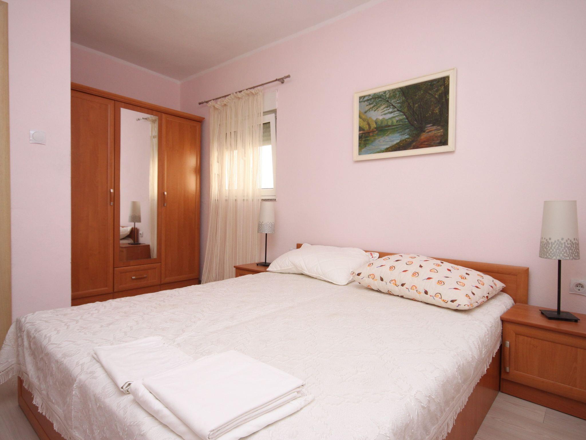Ferienwohnung bietet Platz für 5 Gäste. Die Betten sind in Schlafzimmern, die es 2 gibt, und in Wohnzimmer, innerhalb einer Gesamtfläche von 44m2, angeordnet. Die Gäste haben eine eigene Terrasse zur Verfügung, auf der sie in warmen Sommernächten genießen können. Das Apartment bietet Meerblick. Es ist erlaubt, Speisen auf dem Gemeinschafts-Grill vorzubereiten. In der Unterkunftseinheit besteht die Möglichkeit des Mitbringens von Haustieren gegen Aufpreis. IM PREIS INBEGRIFFEN: Kurtaxe, Endreinigung, Klimatisierung, Parkplatz, Internet. VERBINDLICHE ZUSÄTZLICHE KOSTEN: Aufzahlung für Kurzaufenthalte (prozentualer Zuschlag pro Nächtigungsanzahl: 30% - 1, 20% - 2, 10% - 3). UNVERBINDLICHE ZUSÄTZLICHE KOSTEN: Wäschewaschen (10,00 € Waschen), Haustiere (5,00 € pro Nacht). Die Verfügbarkeit zusätzlicher Dienstleistungen in Ihrem reservierten Termin und die Preise derselben (falls nicht aufgeführt) müssen im Voraus überprüft werden. Zusätzliche Dienstleistungen die in der Zahlungsaufforderung nicht aufgeführt sind werden direkt beim Vermieter bezahlt, angenommen der Gast nutzt auch diese. Ermäßigung auf den Grundpreis: Gratistag 21=19 (bei einem Aufenthalt von 21 Tagen oder mehr erhalten Sie 2 Gratistage für den Aufenthalt bis 31.12.26).