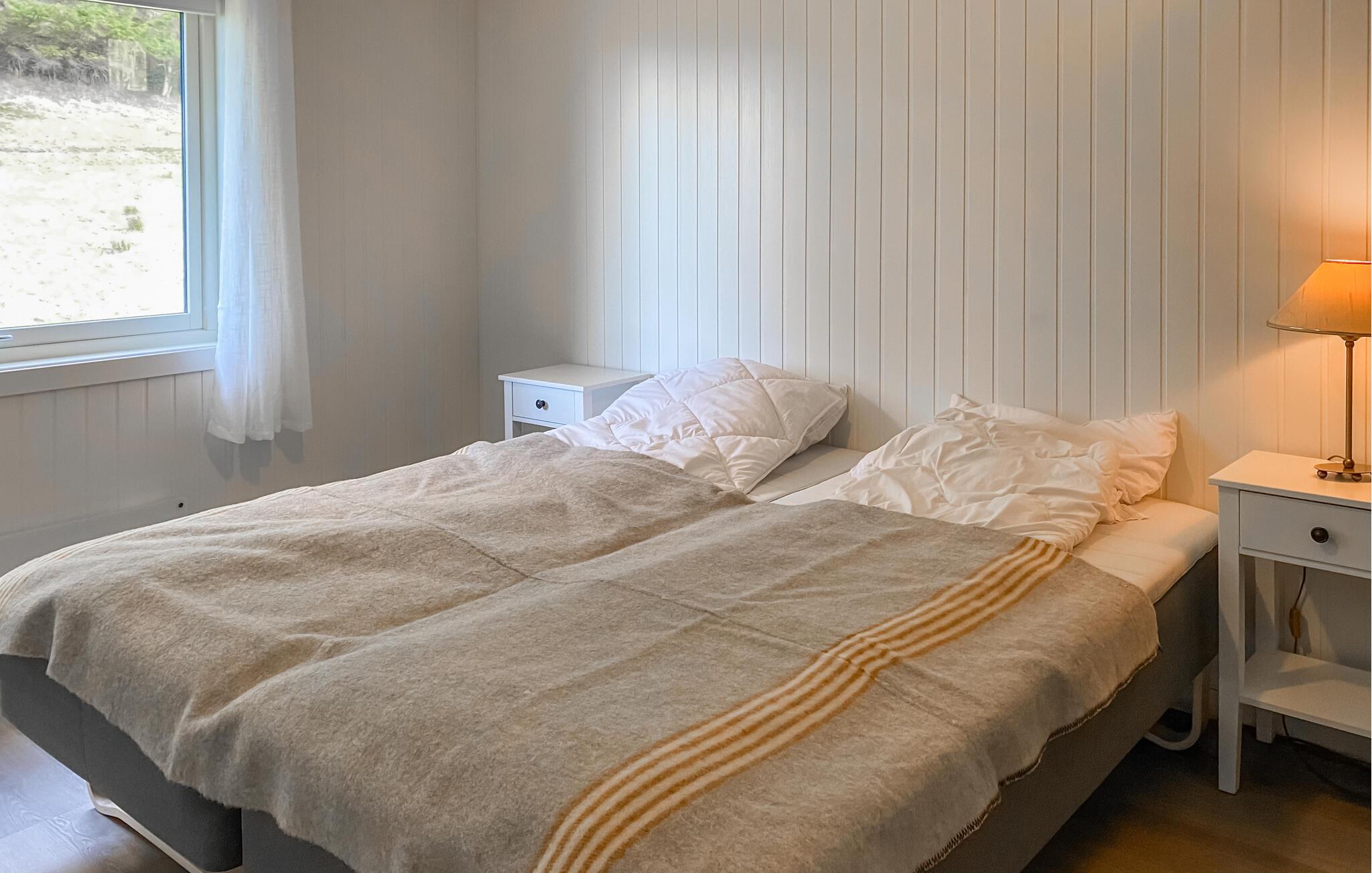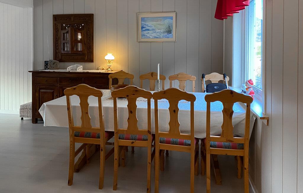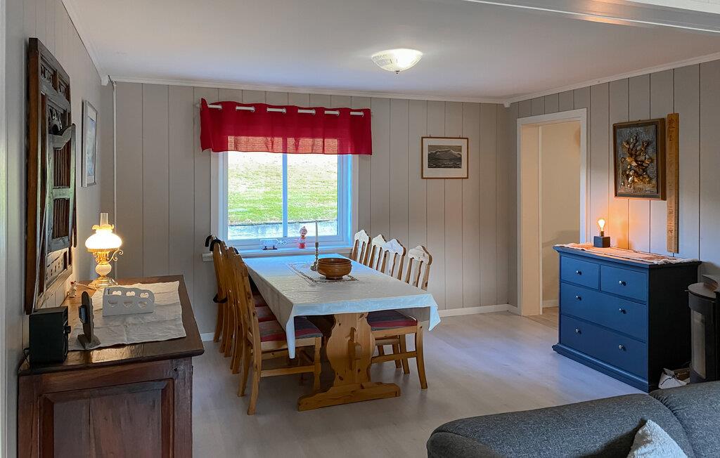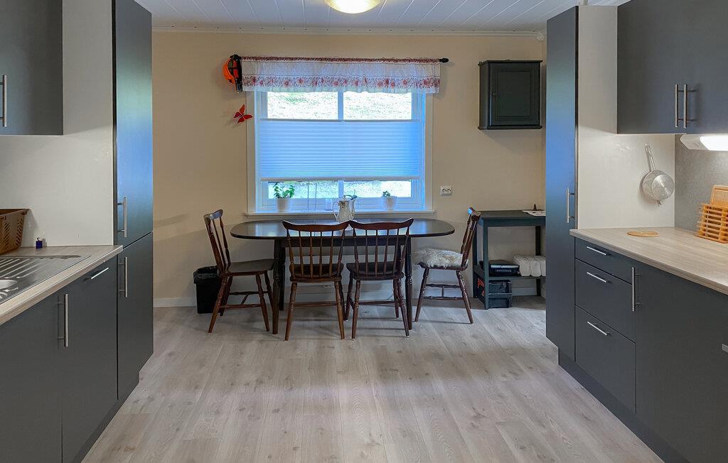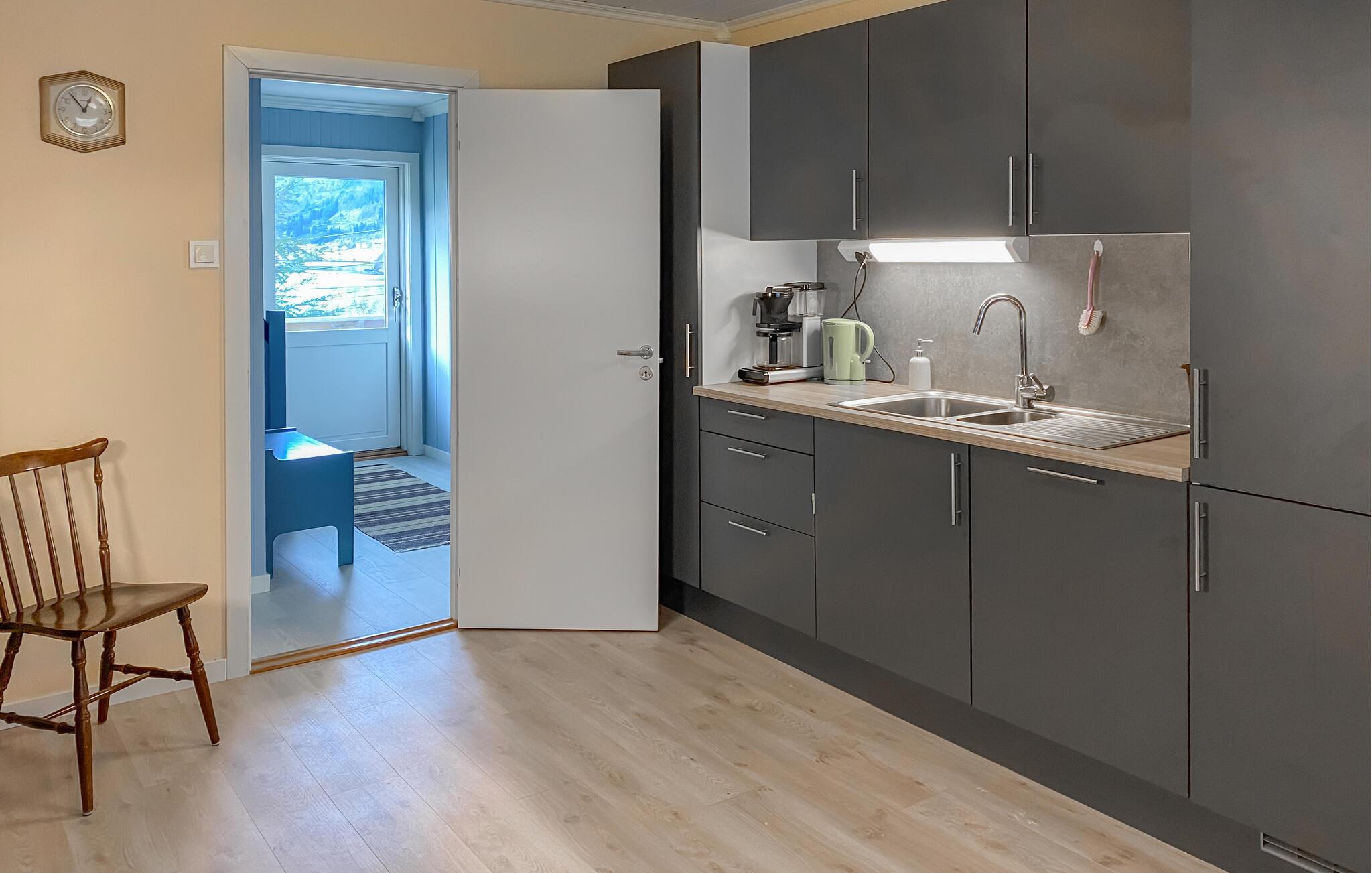 Dette hyggelige feriehus har udsigt over den maleriske fjord og byder velkommen midt i et imponerende landskab. Tilbered jeres yndlingsretter sammen med familien i det moderne køkken og nyd dem ved det indbydende spisebord. Slap af i den hyggelige stue med et brætspil eller læn jer tilbage med en bog i en af ??de komfortable lænestole.
