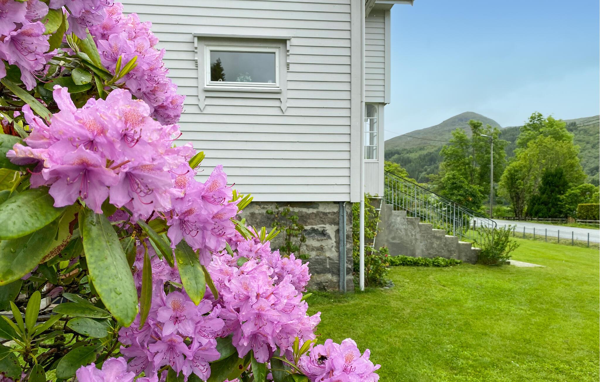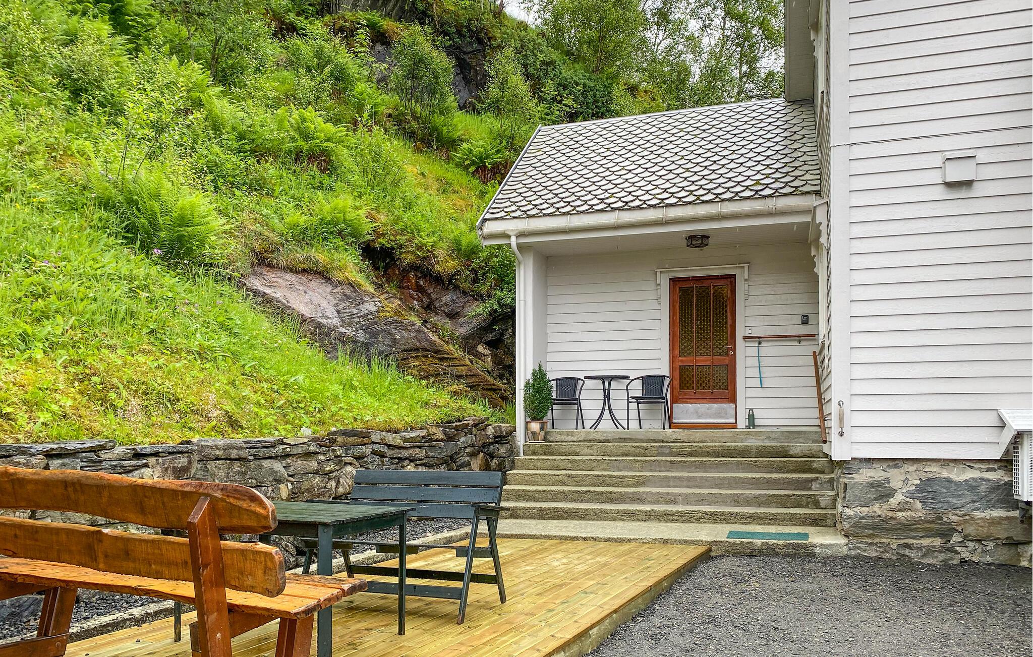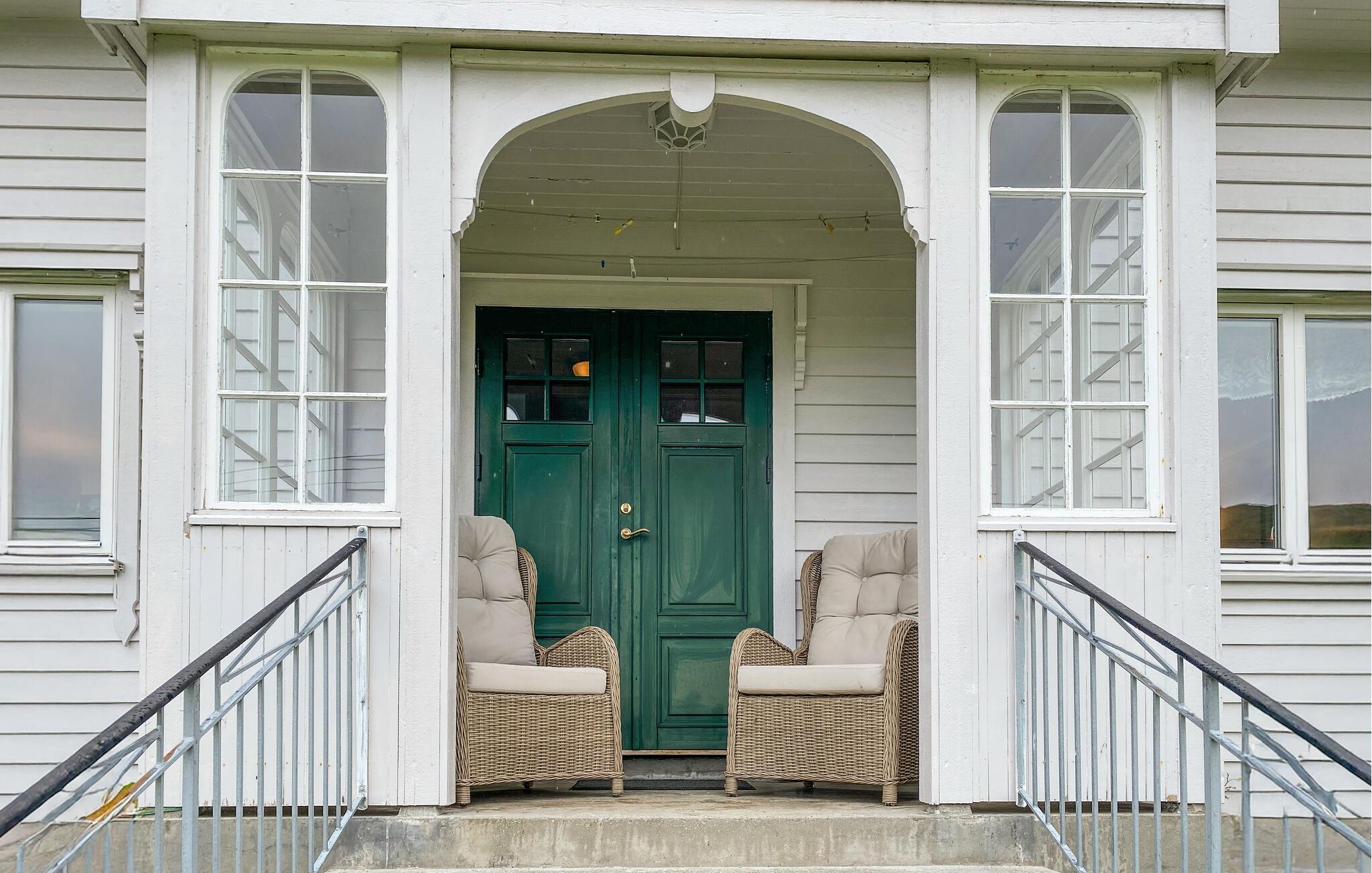 I solskinsvejr inviterer den store, grønne have jer til hyggestunder. Nyd en lækker morgenmad her, inden I begiver jer ud på vandreture i naturen. Hvis I leder efter et beskyttet sted, kan I finde jer en behagelig plads i lænestolene under det overdækkede indgangsparti.