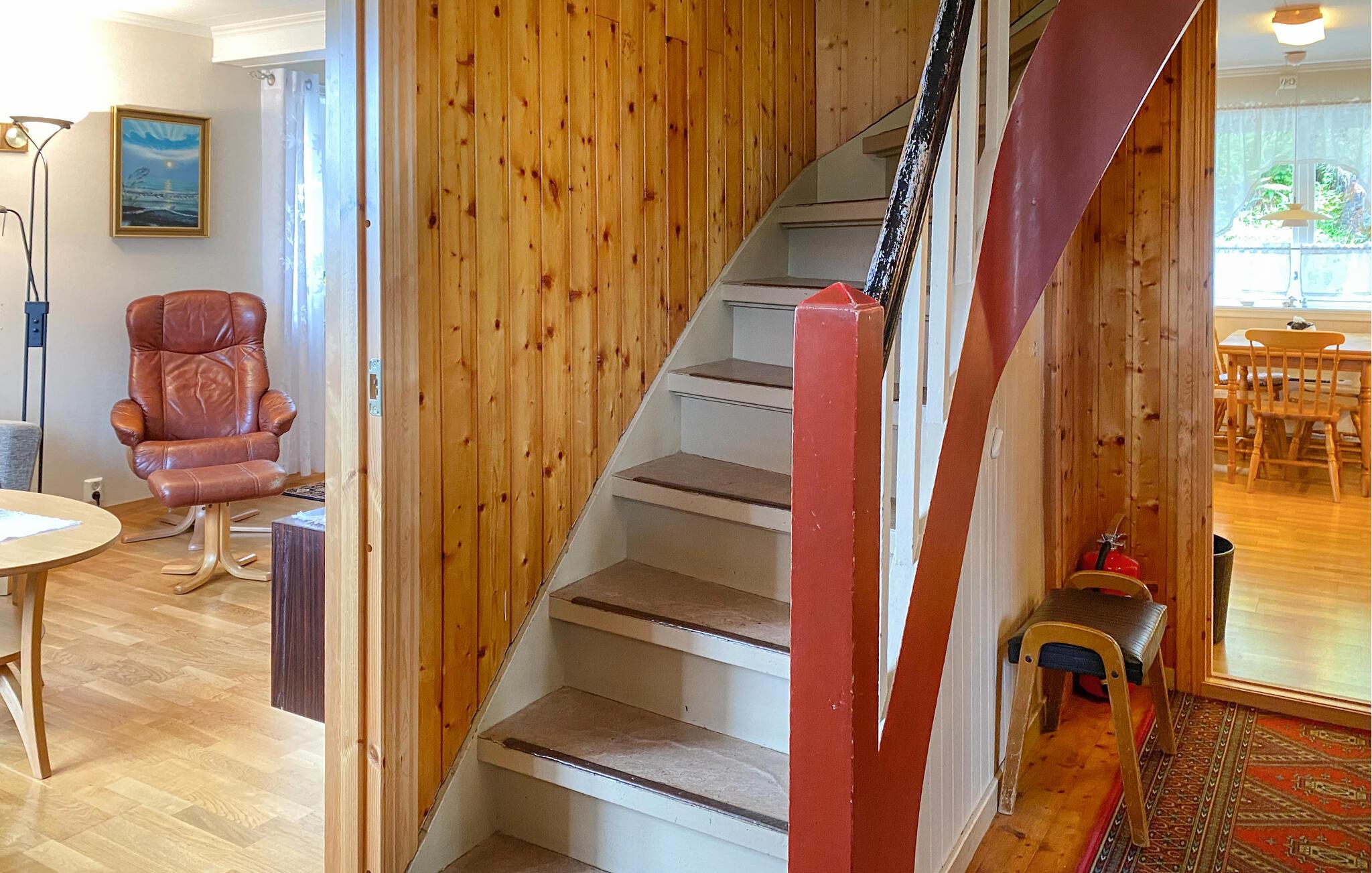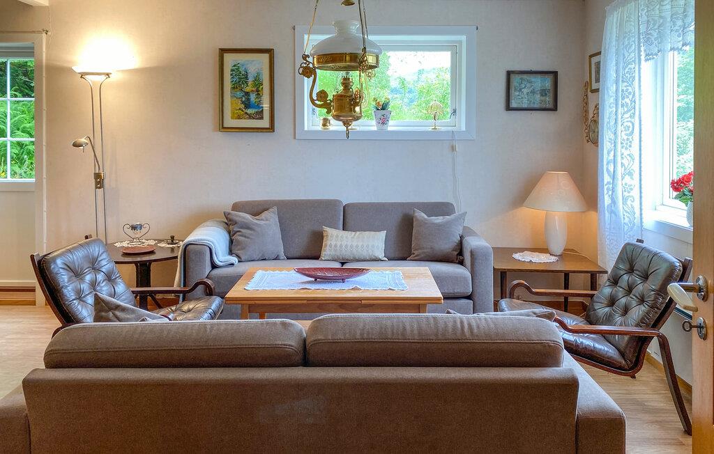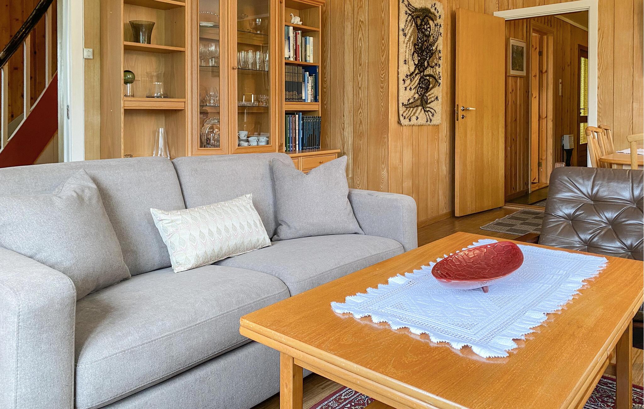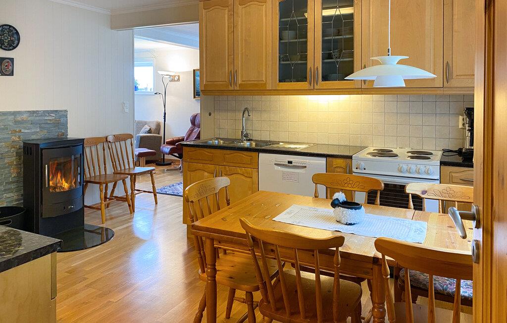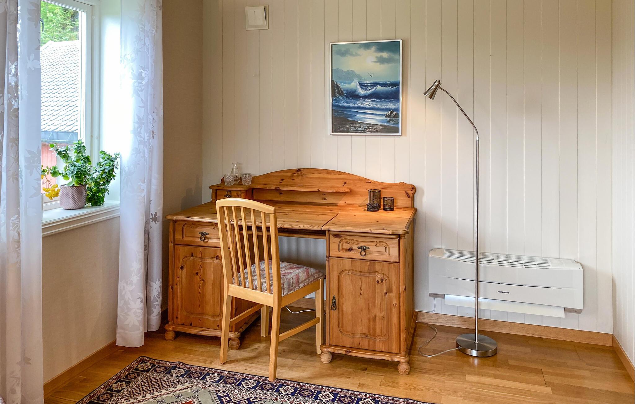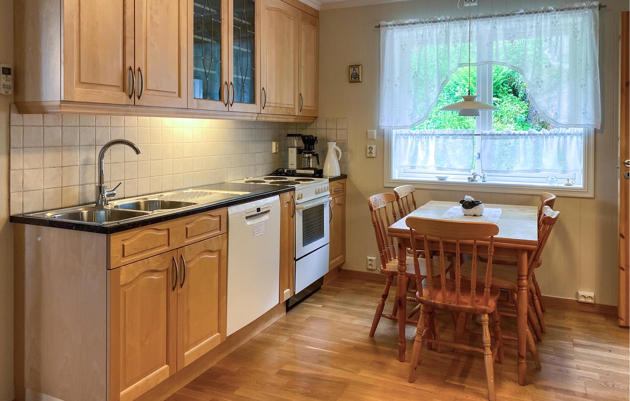 Dette idyllisk beliggende hus er praktisk og komfortabelt indrettet. En hyggelig stue med komfortable sofaer lægger op til at tilbringe afslappende timer med at lytte til musik eller snakke. I det funktionelle køkken kan I tilberede lækre måltider og nyde dem ved den knitrende brændeovn.