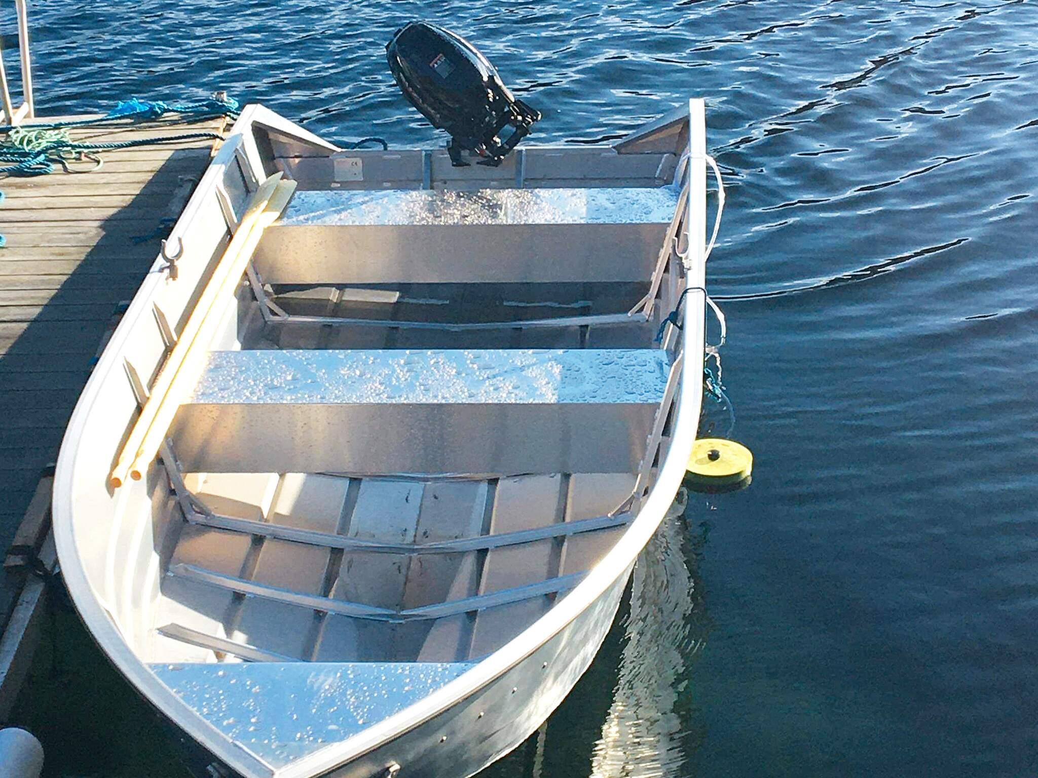 80 m til båten som ligger ved flytebrygge nede ved fjorden, en 16 fots aluminiumsbåt med 15 hk Suzuki motor. Flytevester inklusiv i båtleien. Lån av sjøkart med markerte fiskeplasser og fiskeslag er inkludert i prisen.
