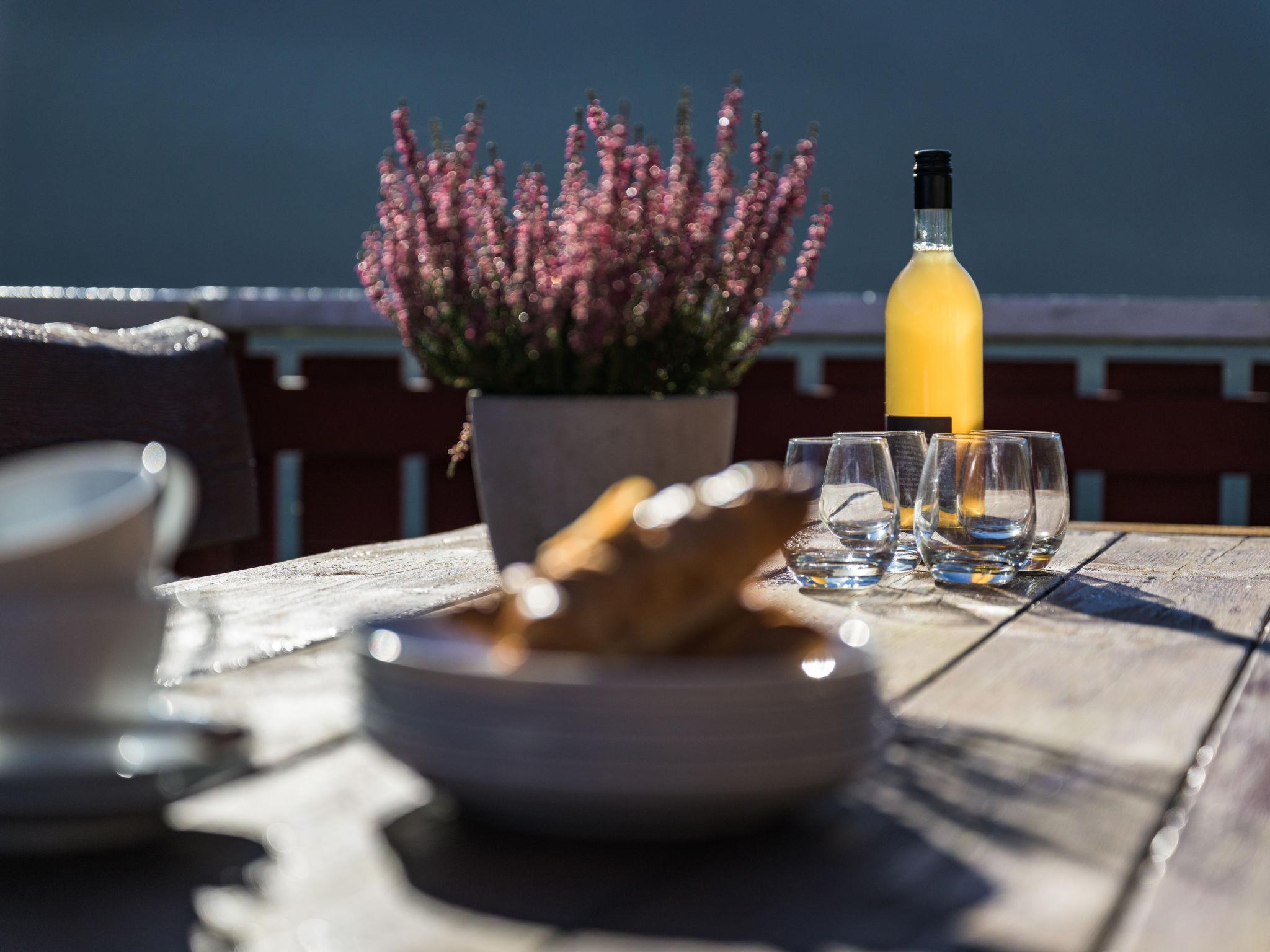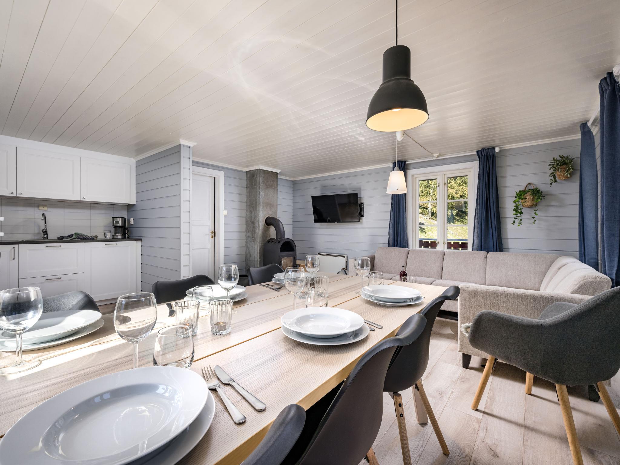 "Tor", 5-room house 110 m2 on 3 levels. Cosy furnishings: living/dining room with Scandinavian wood stove, dining table, TV and DVD. Exit to the terrace. Open kitchen (oven, dishwasher, 4 ceramic glass hob hotplates, microwave, freezer, electric coffee machine). Shower/WC. On the lower ground floor: 2 double bedrooms. Shower/WC, Sauna. Upper floor: 1 double bedroom. 1 room with 2 beds (75 cm). Electric heating, underfloor heating. Beautiful view of the sea, the mountains and fjord. Facilities: washing machine. Please note: smoke alarm, fire extinguisher. No internal connecting door between the floors. Freezer approx. 300 l. TV via WIFI. Bed layout is flexible. There are more sleeping options available than the maximum number of people allowed which may, however, not be exceeded. 924531169