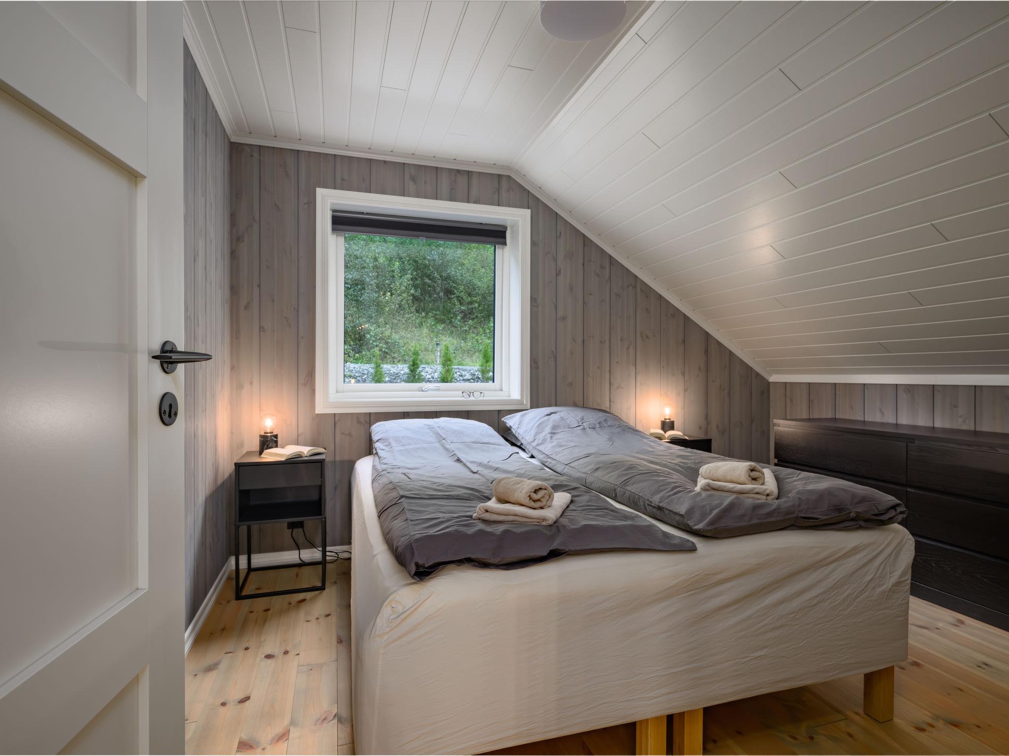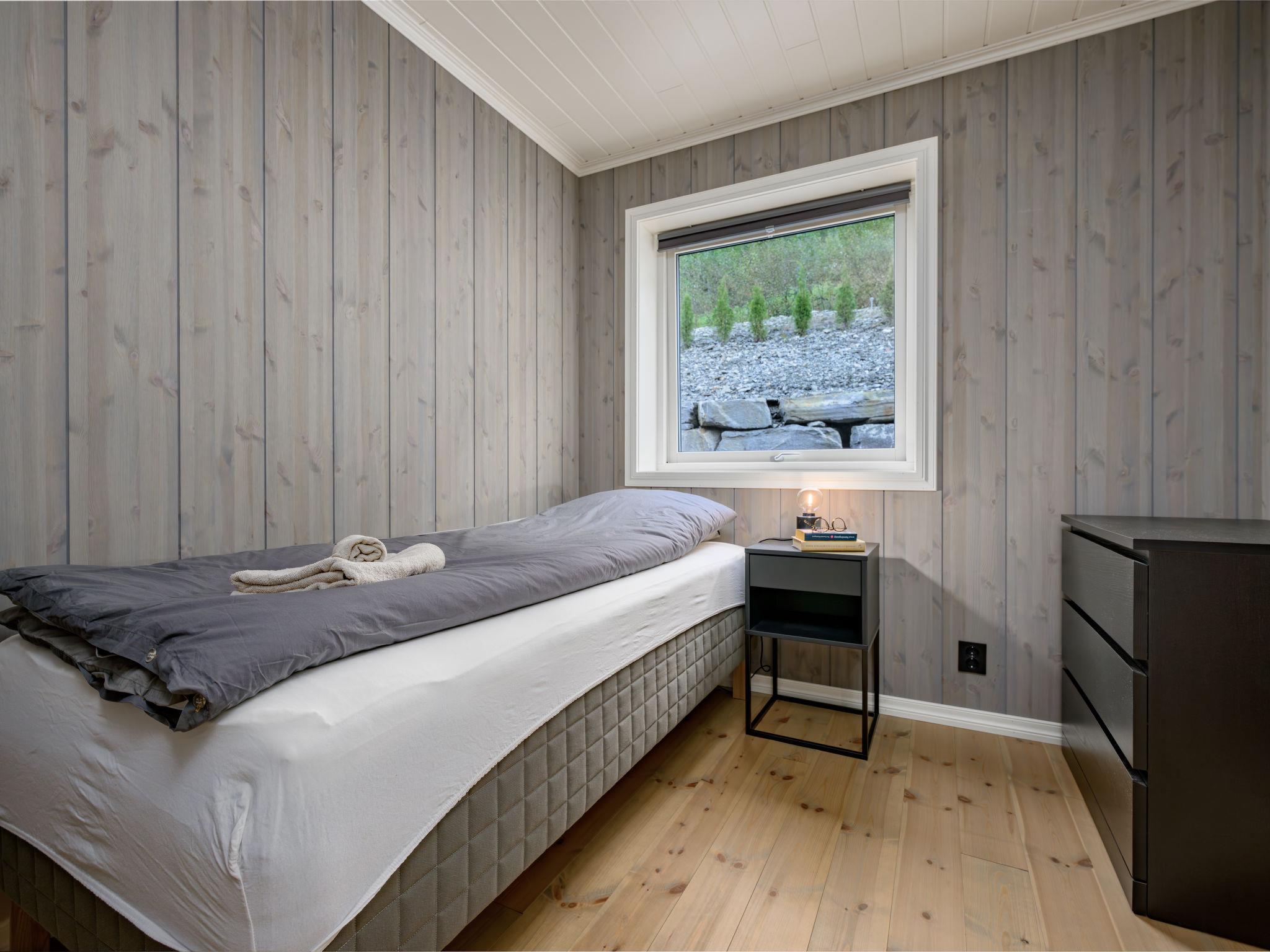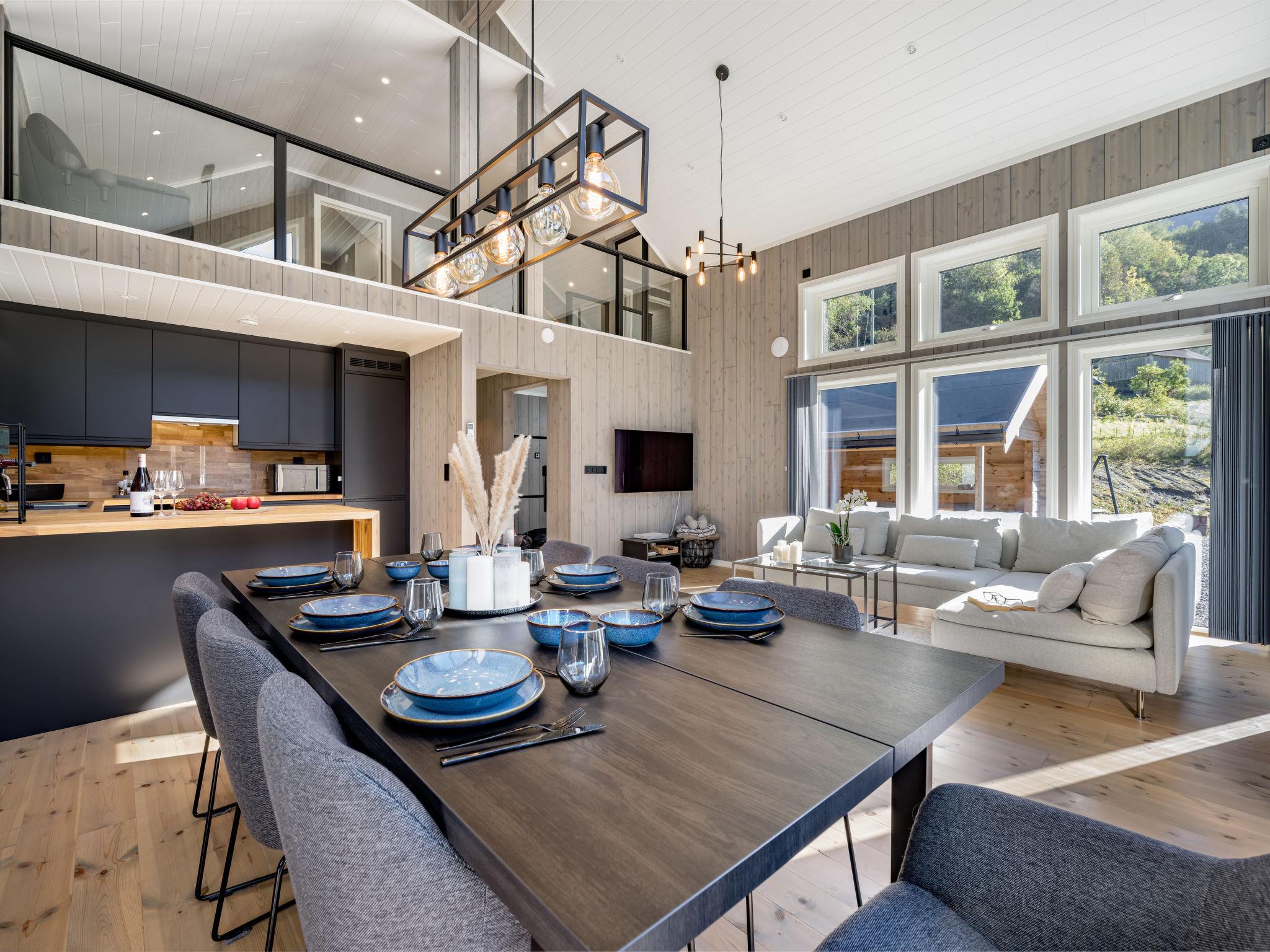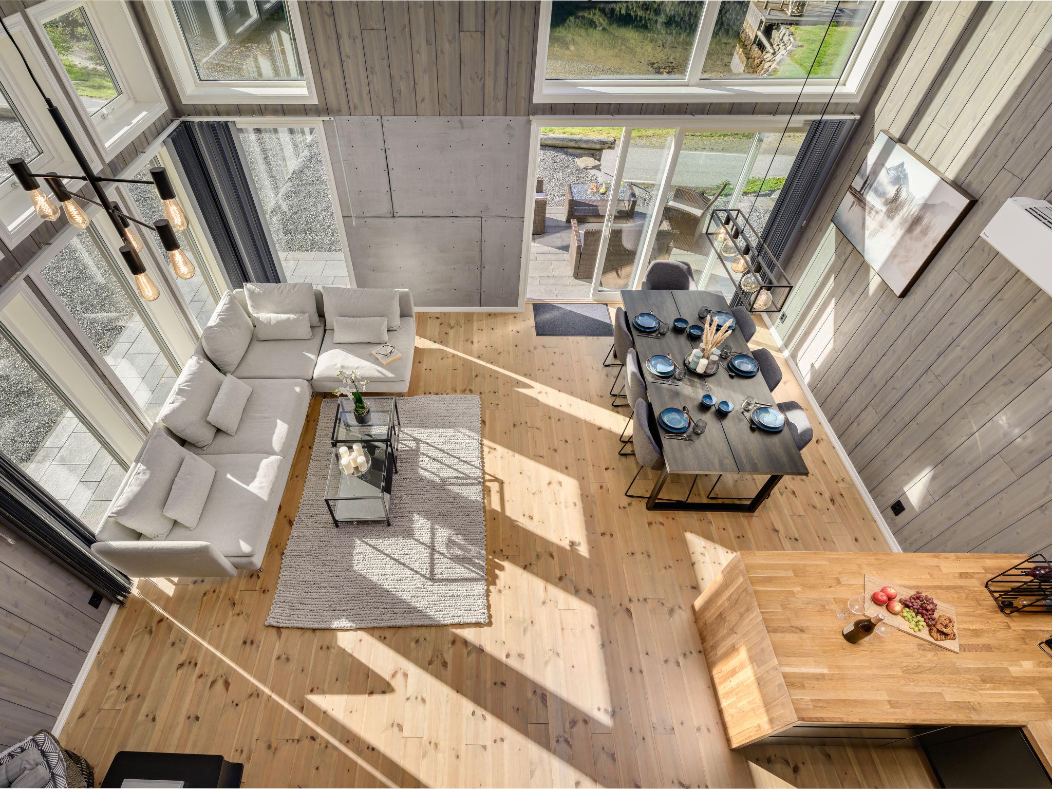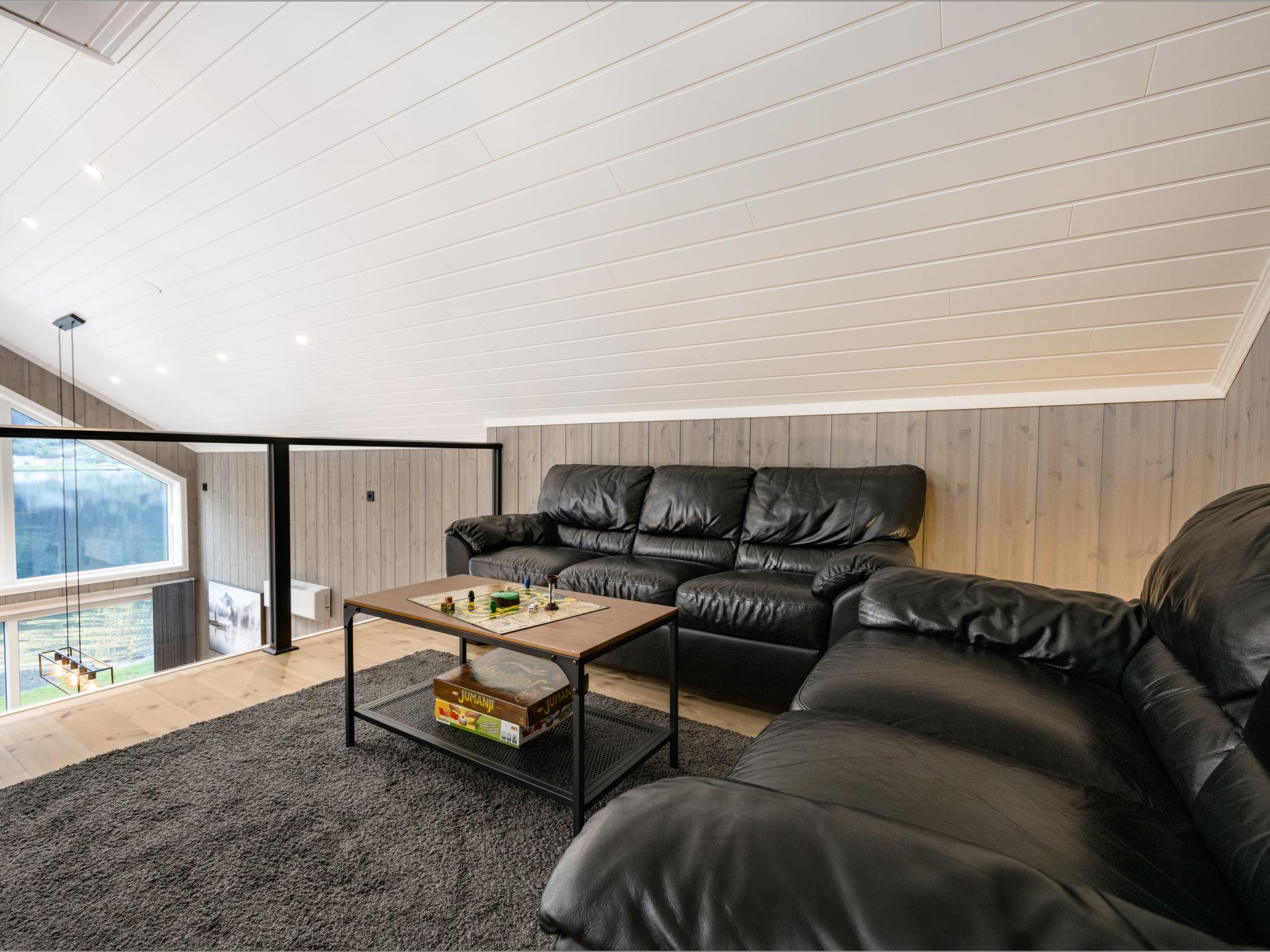 "Kaja", 6-room chalet 115 m2 on 2 levels. Bright, tasteful furnishings: open living/dining room with TV and heating stove. 1 room with 1 double bed (160 cm, length 200 cm). 1 room with 1 bed (90 cm, length 200 cm). Open kitchen (oven, dishwasher, 4 induction hot plates, toaster, kettle, microwave, freezer, electric coffee machine) with dining table. Shower/WC. Upper floor: open living room. 1 room with 1 double bed (160 cm, length 200 cm). 1 room with 2 beds (80 cm, length 200 cm). Beautiful panoramic view of the sea, the mountains and fjord. Facilities: washing machine, sauna. Internet (WiFi, free). Please note: non-smokers only. 924531169
