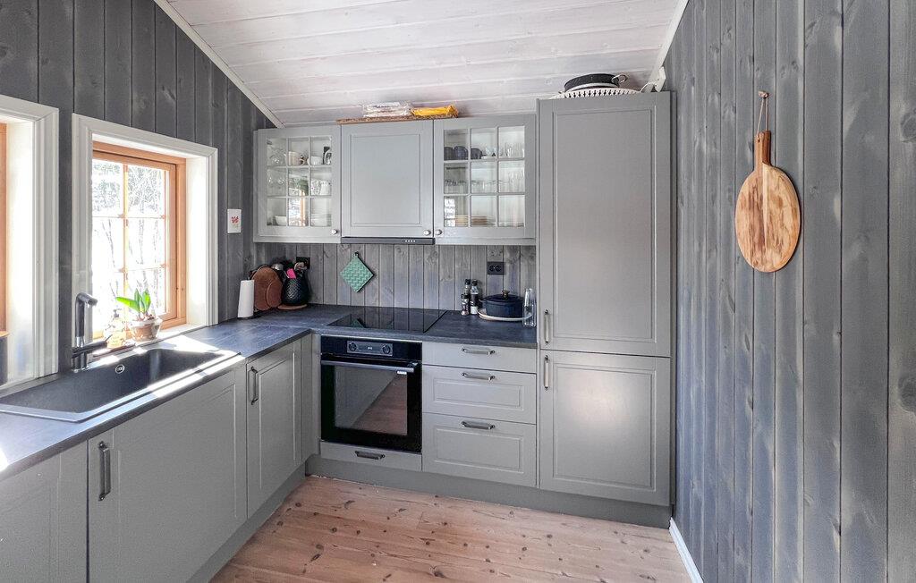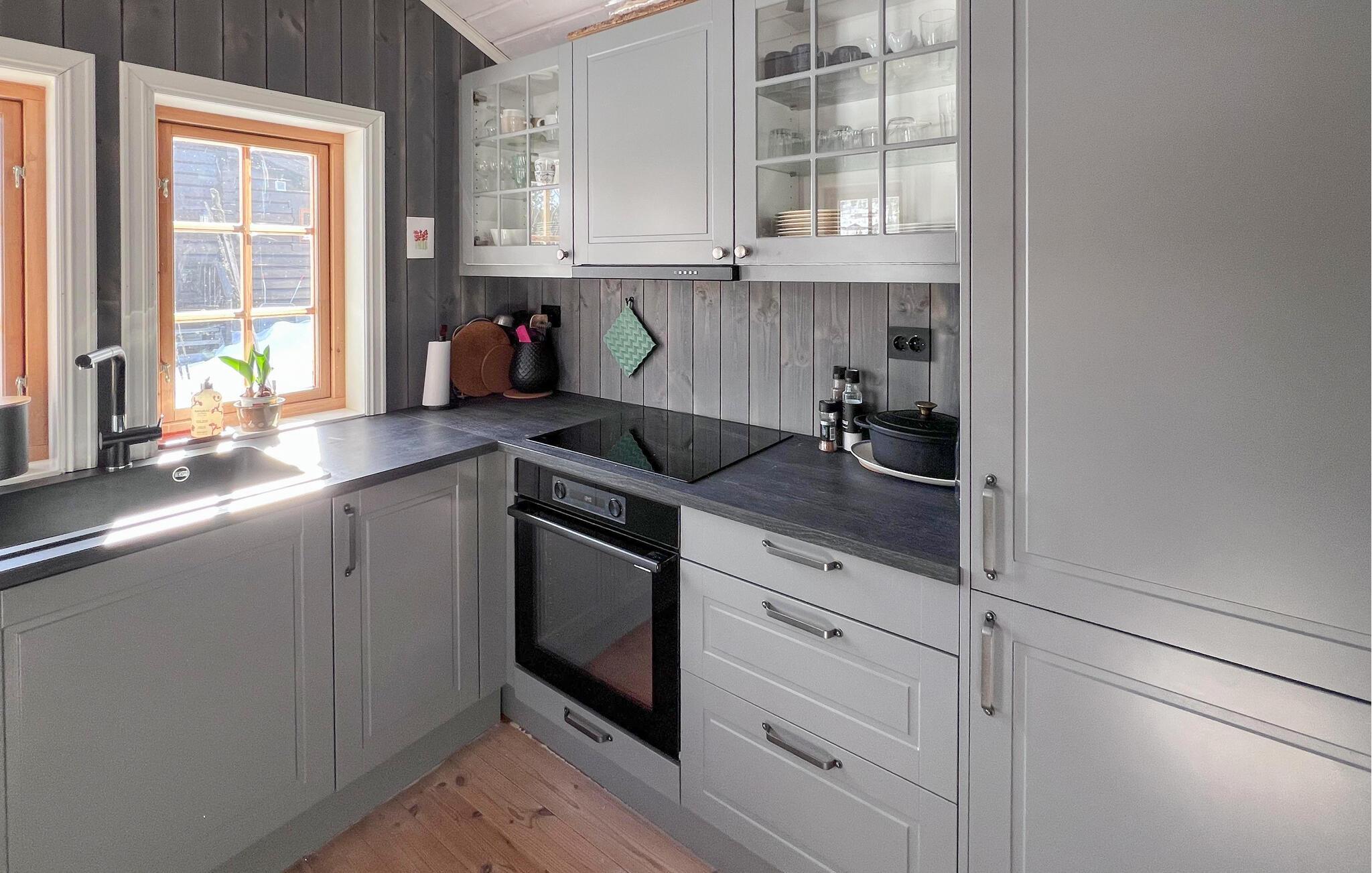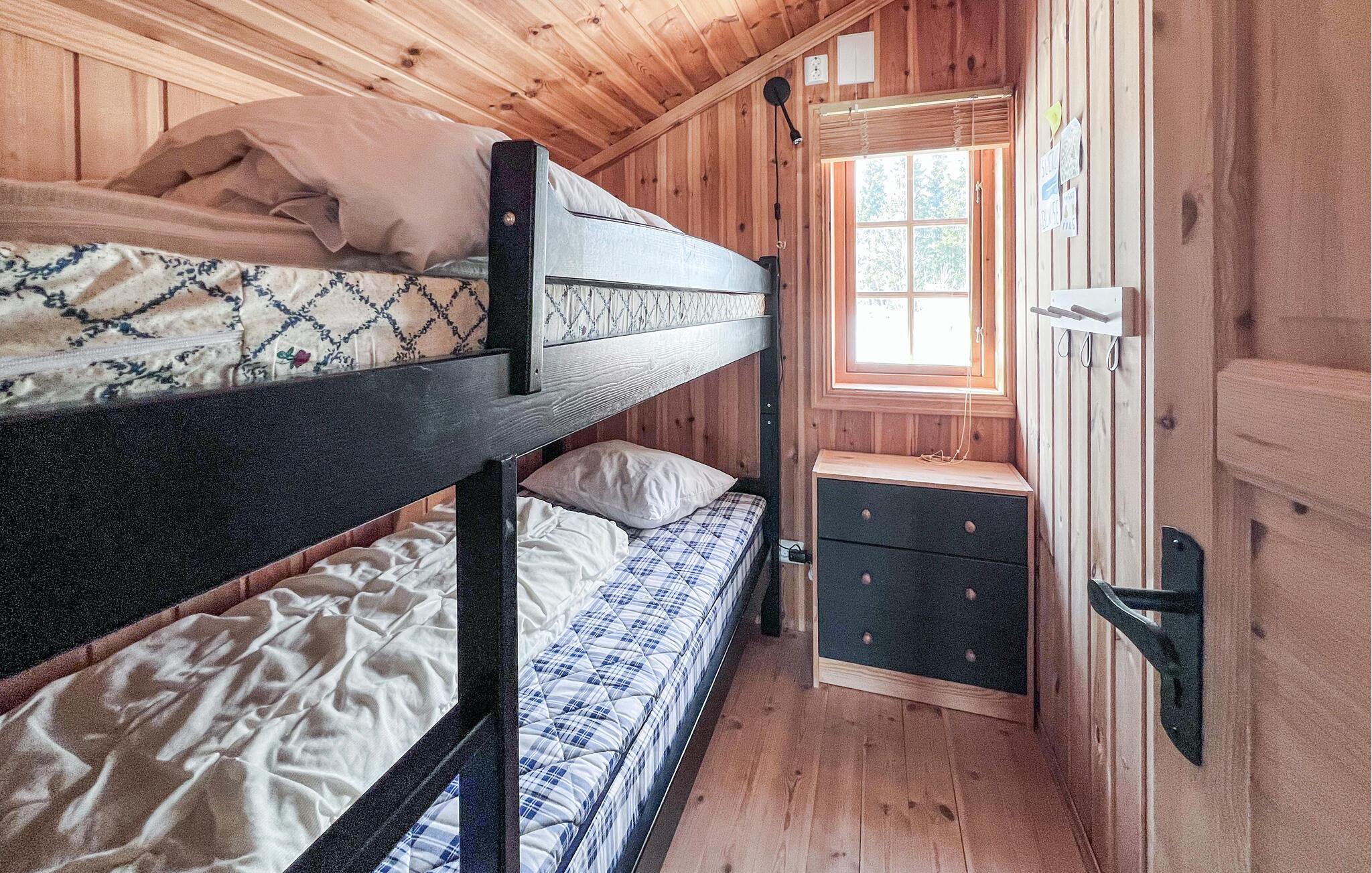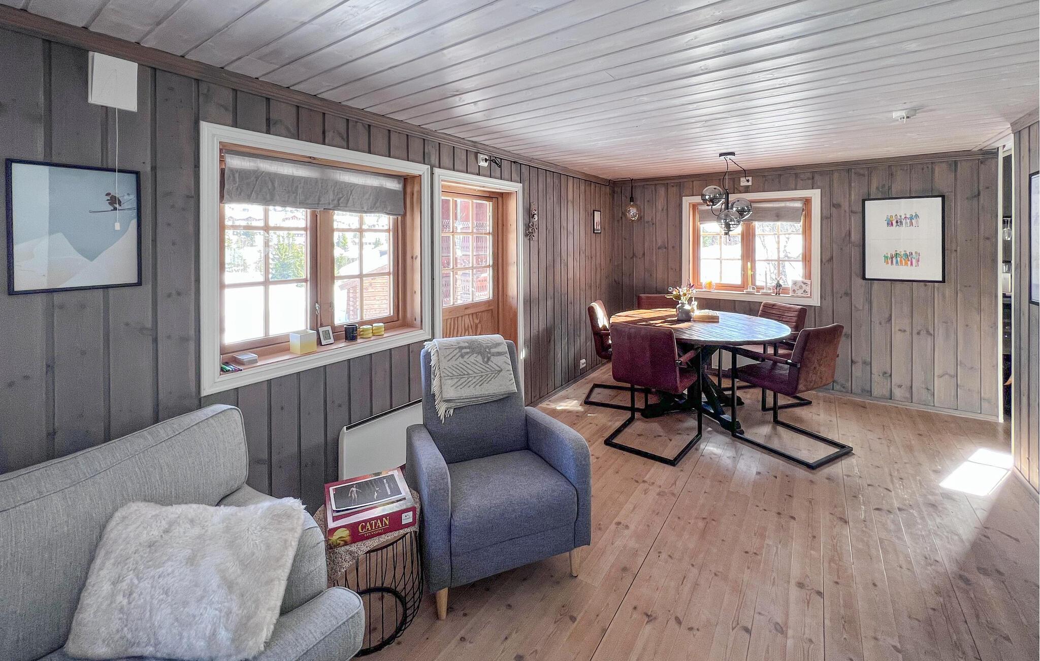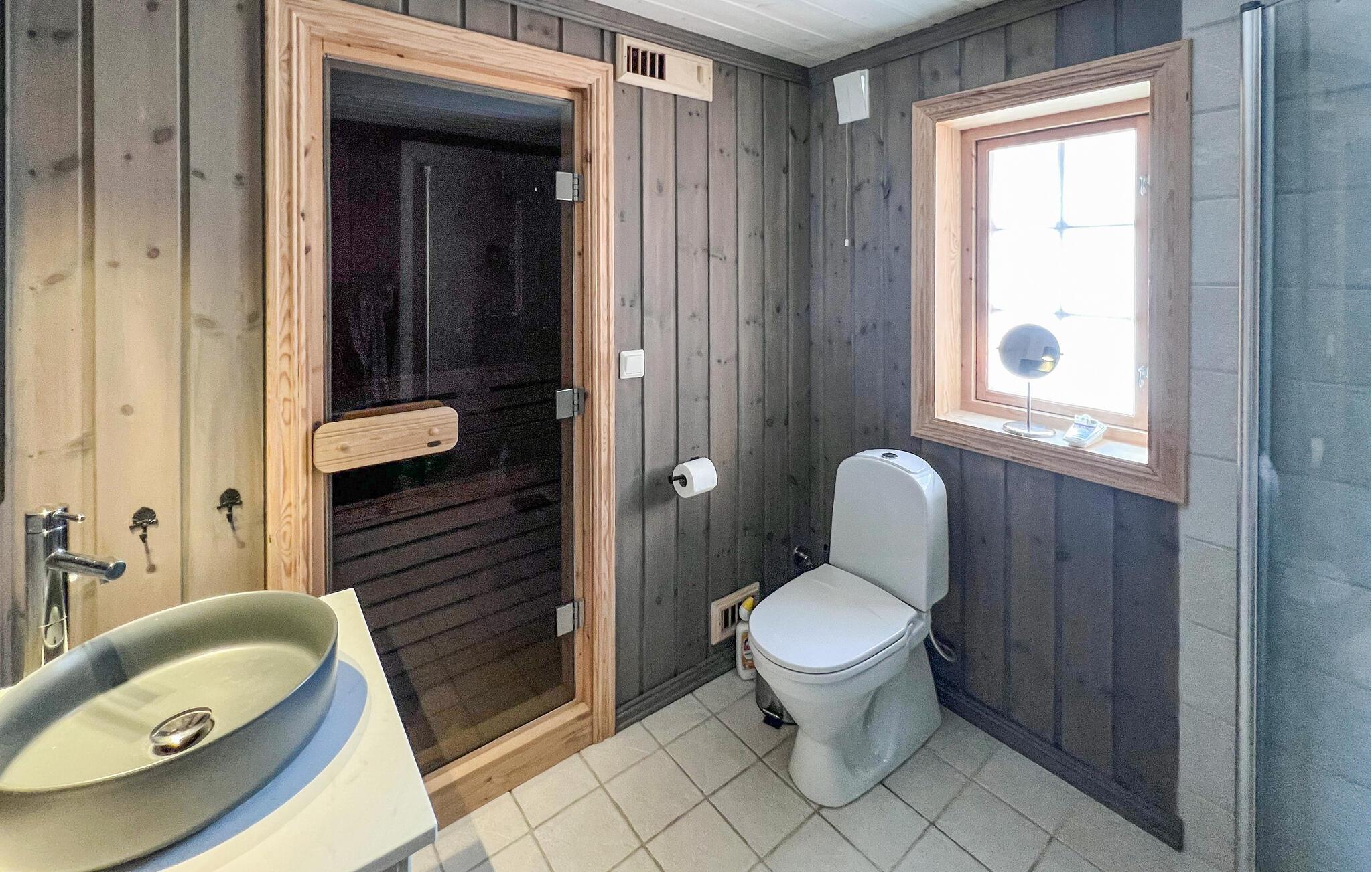 Træd indenfor og nyd den varme atmosfære i huset med masser af træ og smukke detaljer. Opholdsstuen med komfortable lænestole og sofa indbyder til afslappende timer. Hyg dig ved brændeovnen eller tilbring hyggelige aftener ved det smukke spisebord. Brug køkkenet med masser af bordplads til at tilberede dine måltider. Træk dig derefter tilbage til det øverste opholdsrum og slap af foran tv'et. Eller forkæl dig selv med beroligende øjeblikke i saunaen.