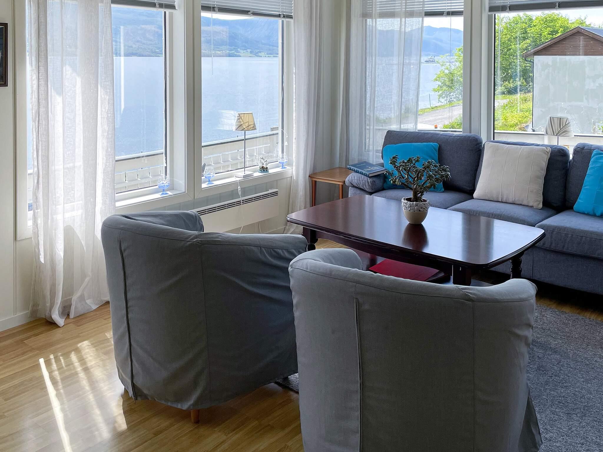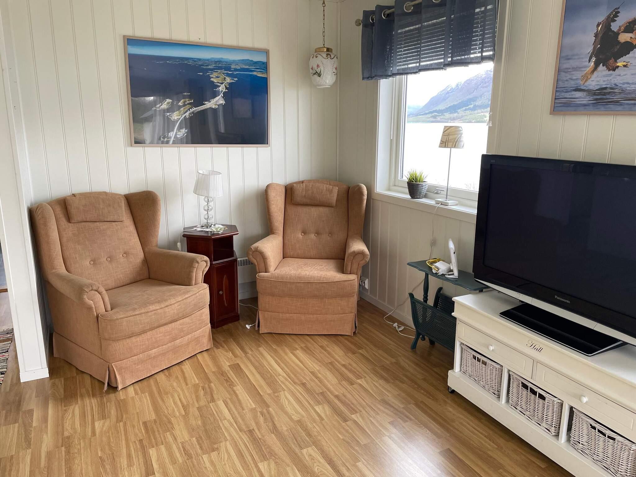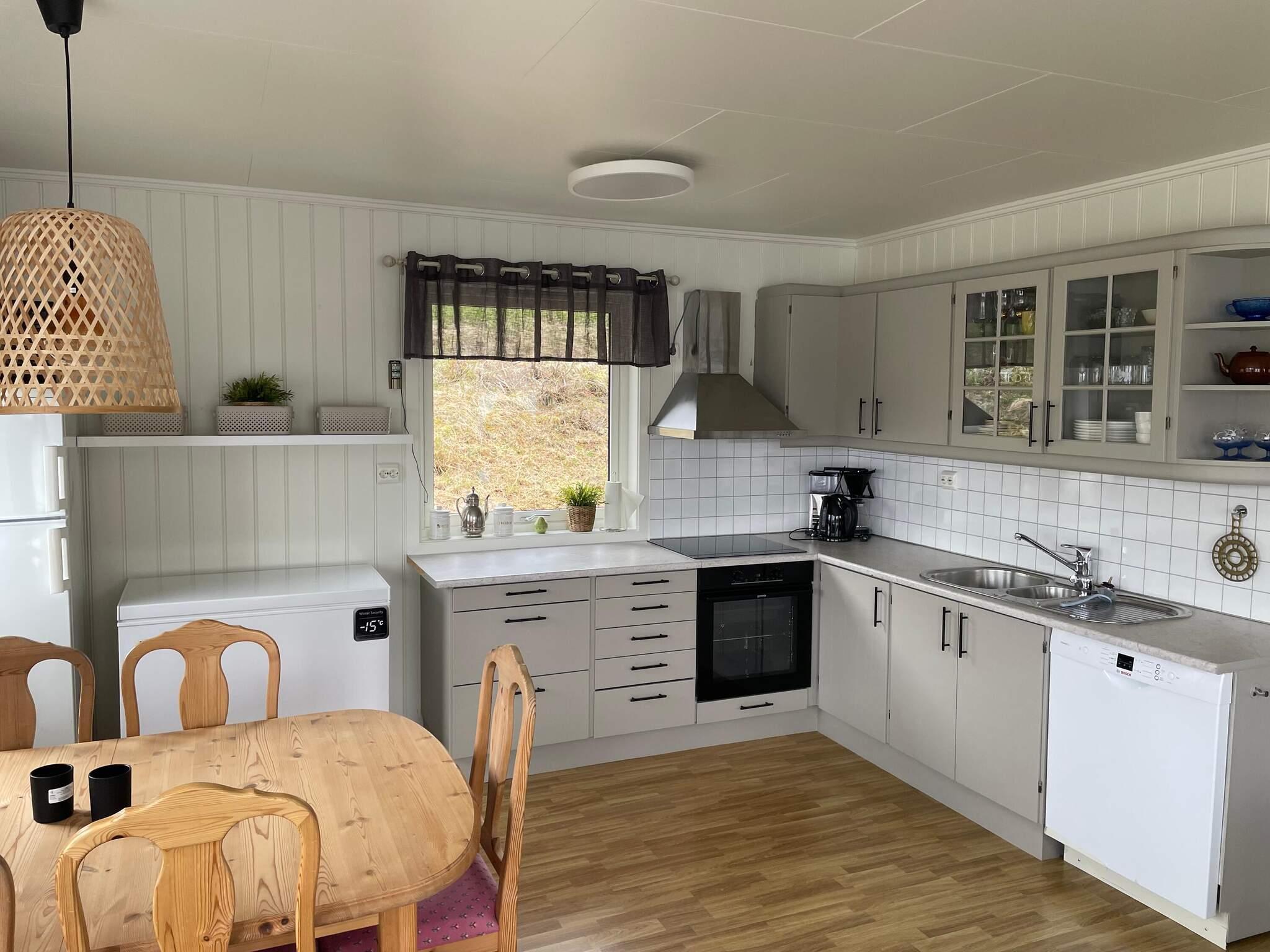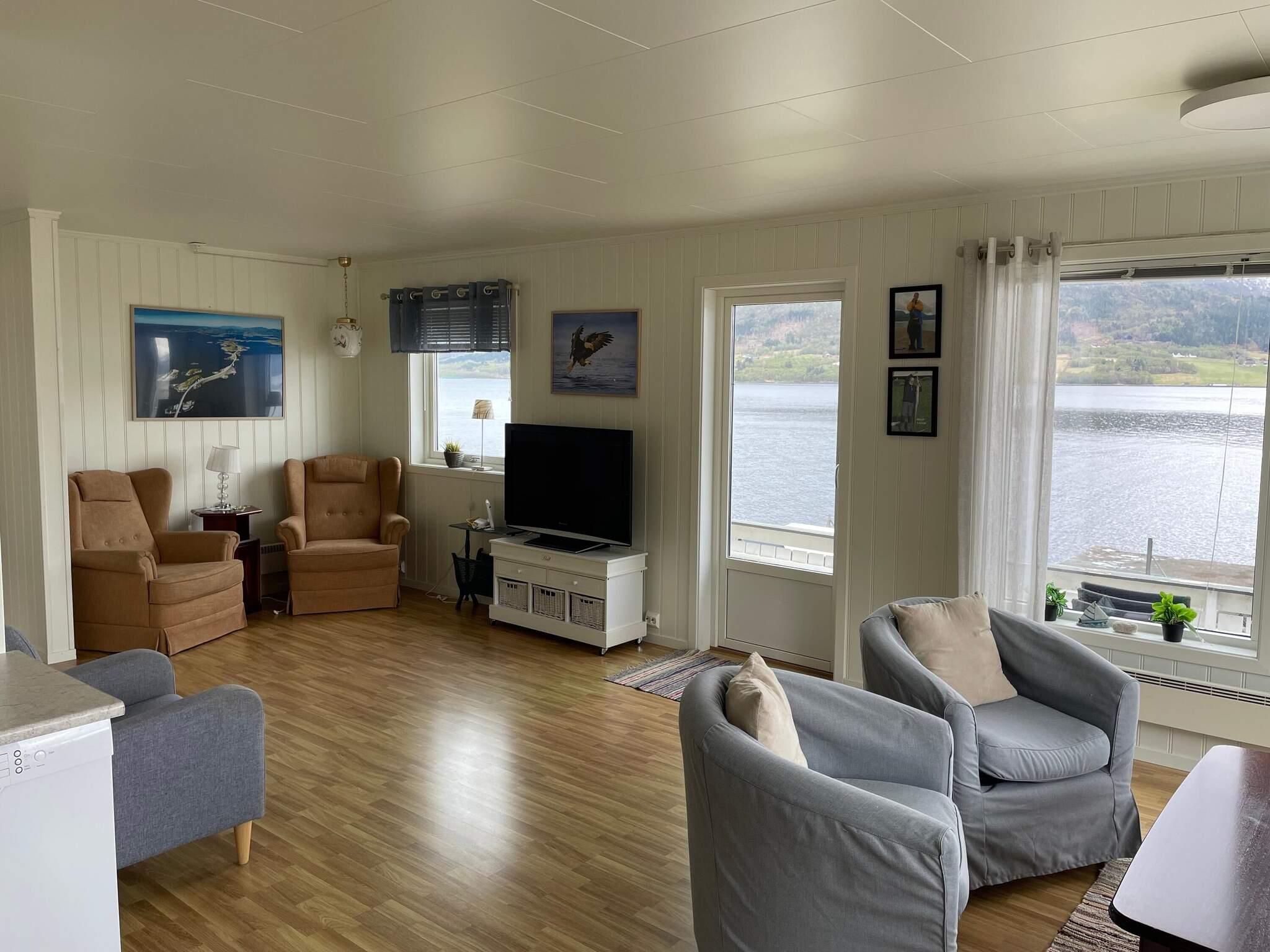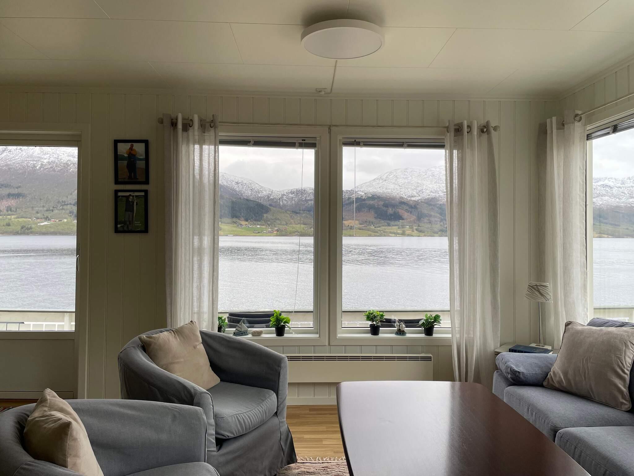 Fra de store vinduene i den lyse stuen og den 24 kvm åpne terrassen har du panoramautsikt ut over fjorden. TV med tilgang IP-Tv med alle TV-kanaler; norske, tyske m.m. På soverommet med 2 senger kan disse sammensettes til 1 dobbeltseng. Soverom med enkeltseng og en køyeseng for 2 personer, 80 cm bredde. Tilgang på fryser 180 liter, 100 m unna. Fryseskap i feriehuset på 50 liter.