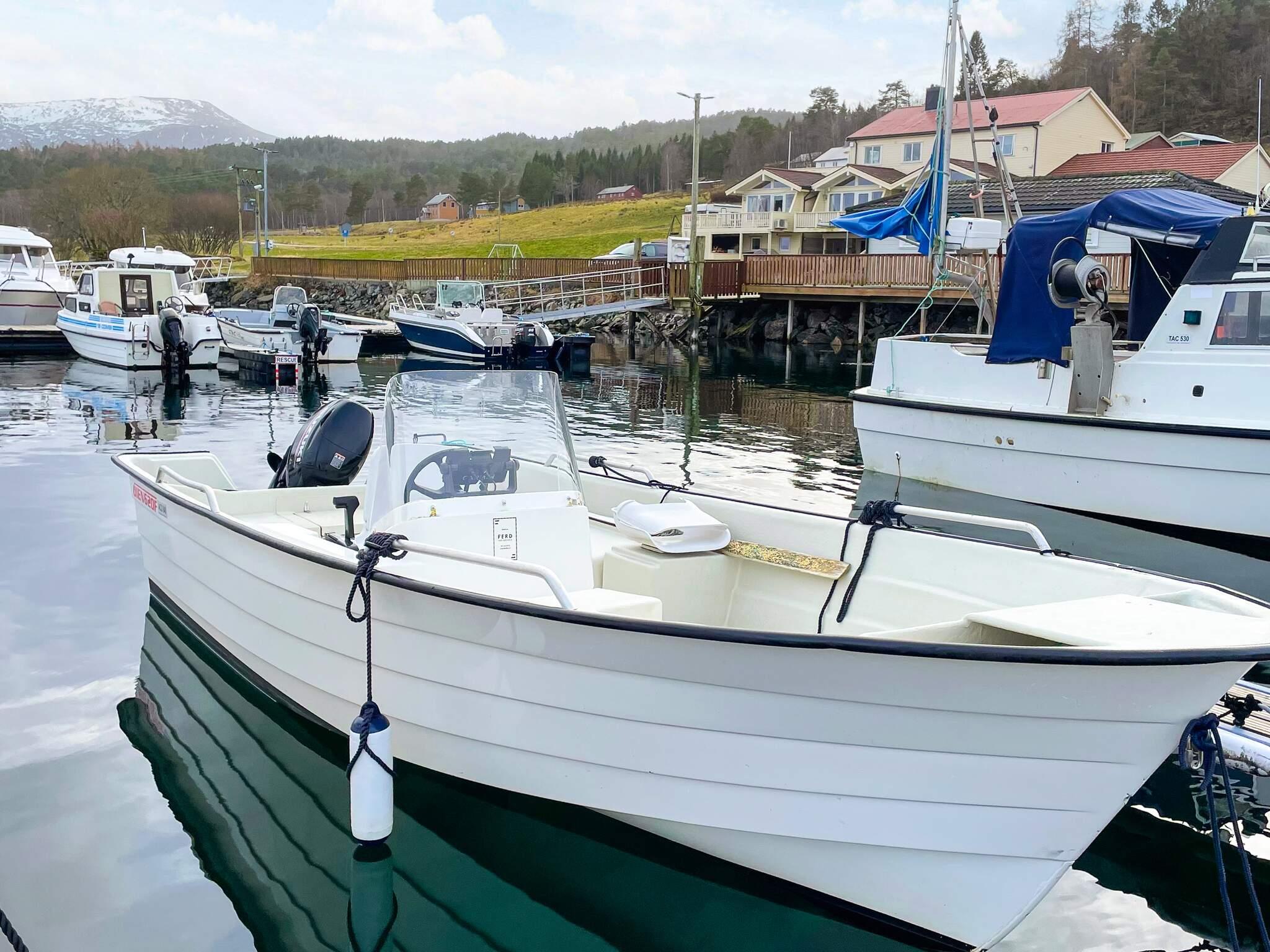 Båt til leie: 6 km unna feriehuset, østlig retning, i Kværnes Motorbåtforening, plass nr. 6. Når været er pent, kan også båten fortøyes i den private bryggen foran feriehuset for et kortere opphold på land, spise mat etc.