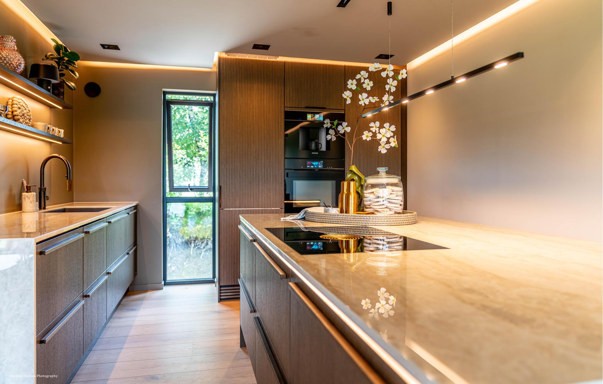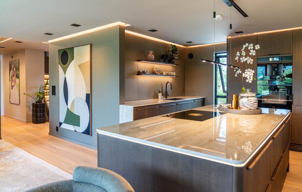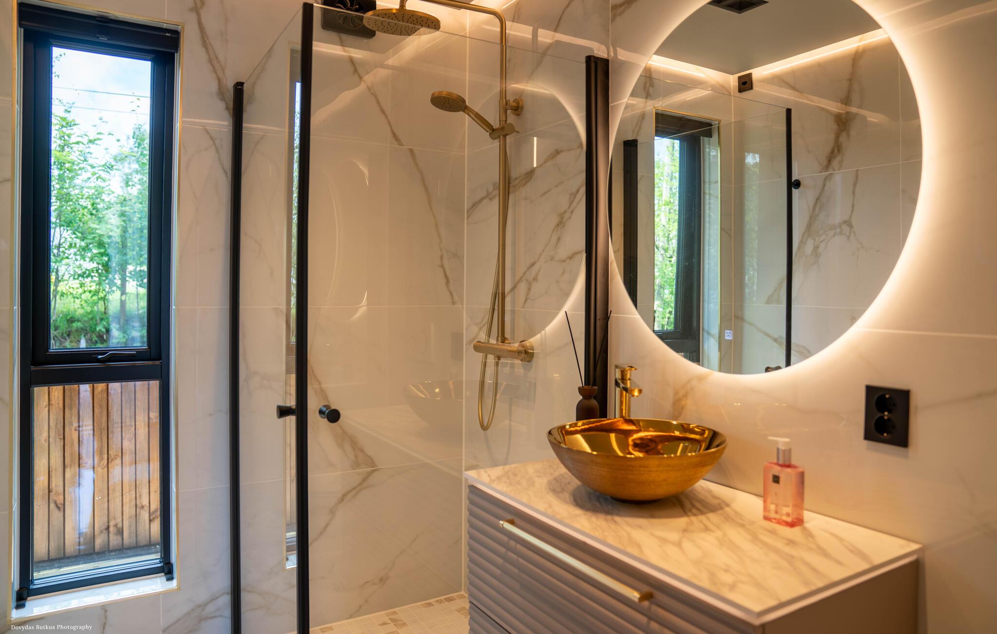 Dette træhus med sine store glasfacader lægger op til en afslappende pause fra hverdagen. lad batterierne op, mens I nyder panoramaudsigten over landskabet, og fordyb jer fuldt ud i feriefølelsen. Læn jer tilbage i den behagelige sofa, lyt til de seneste hits eller stream en god serie. Tilbered lækre måltider sammen og server dem med et glas vin.