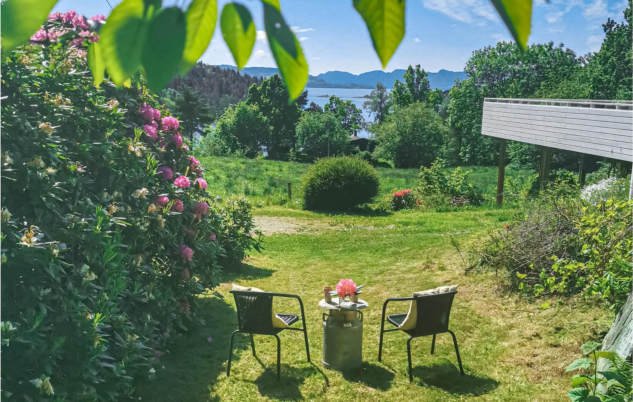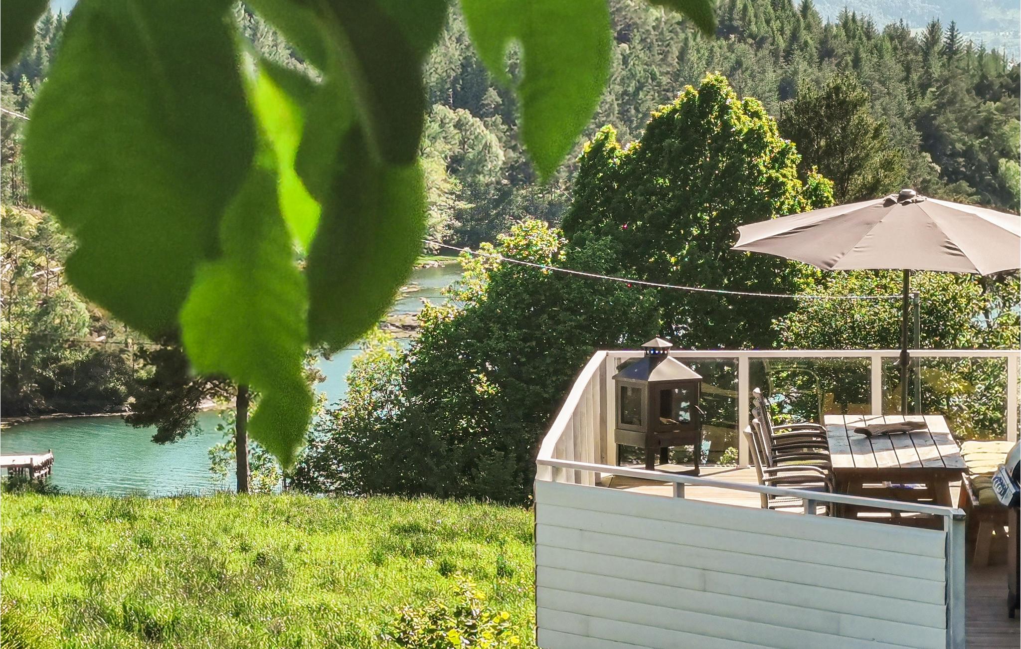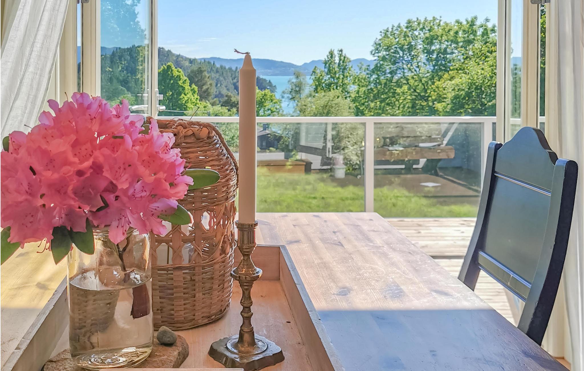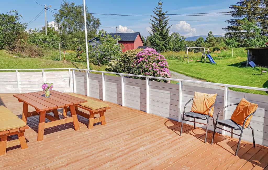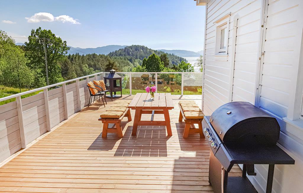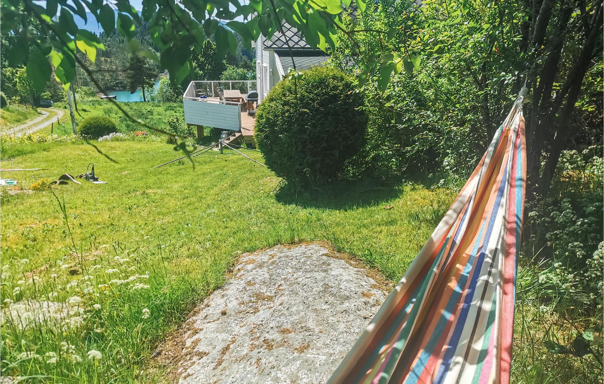 Feriehuset har en dejlig terrasse, hvor du kan hygge dig og nyde udsigten over fjorden samt de smukke bjerge. Grunden går ned til vandet, hvor du kan tage nogle forfriskende svømmeture i løbet af ferien.