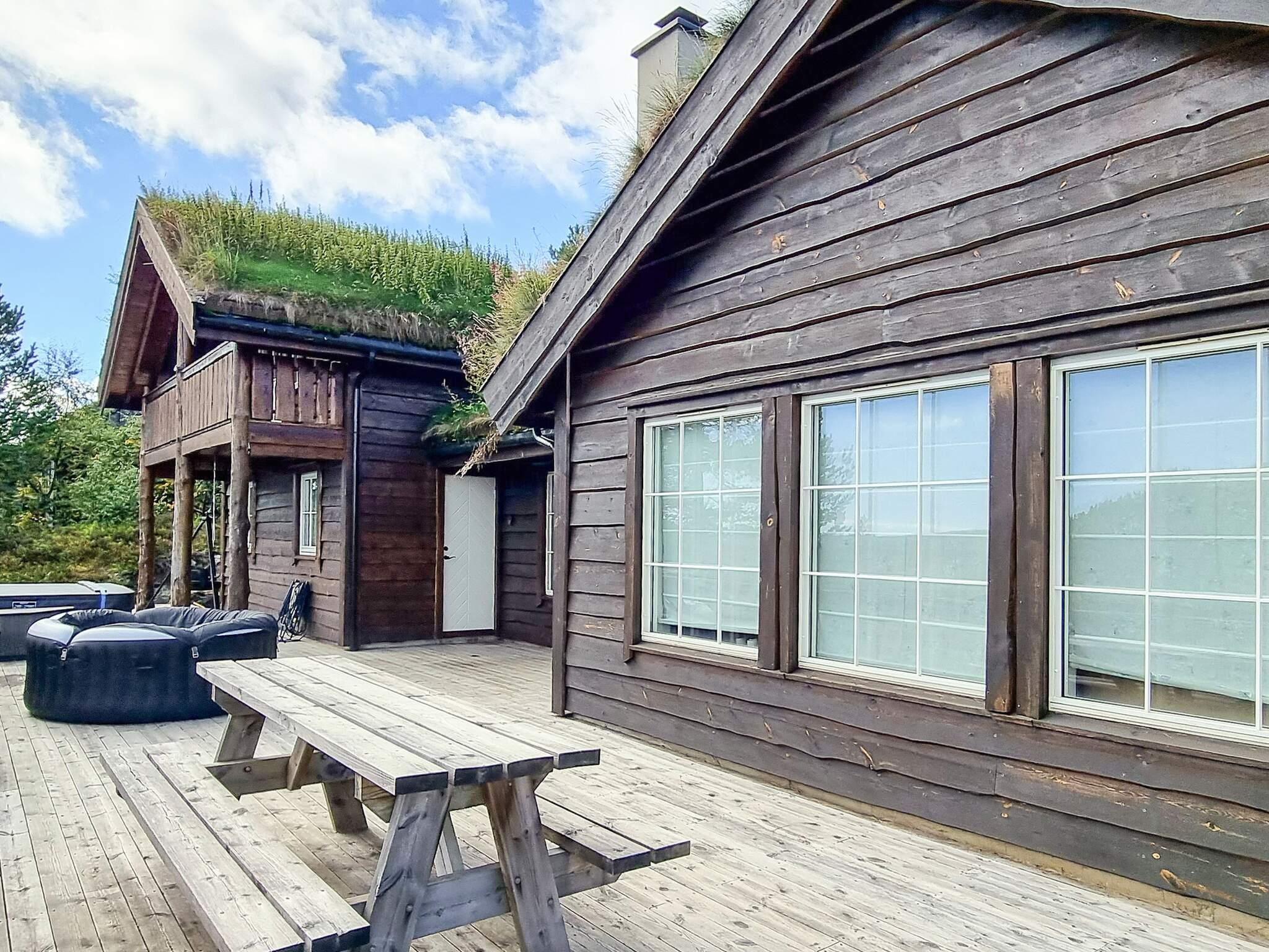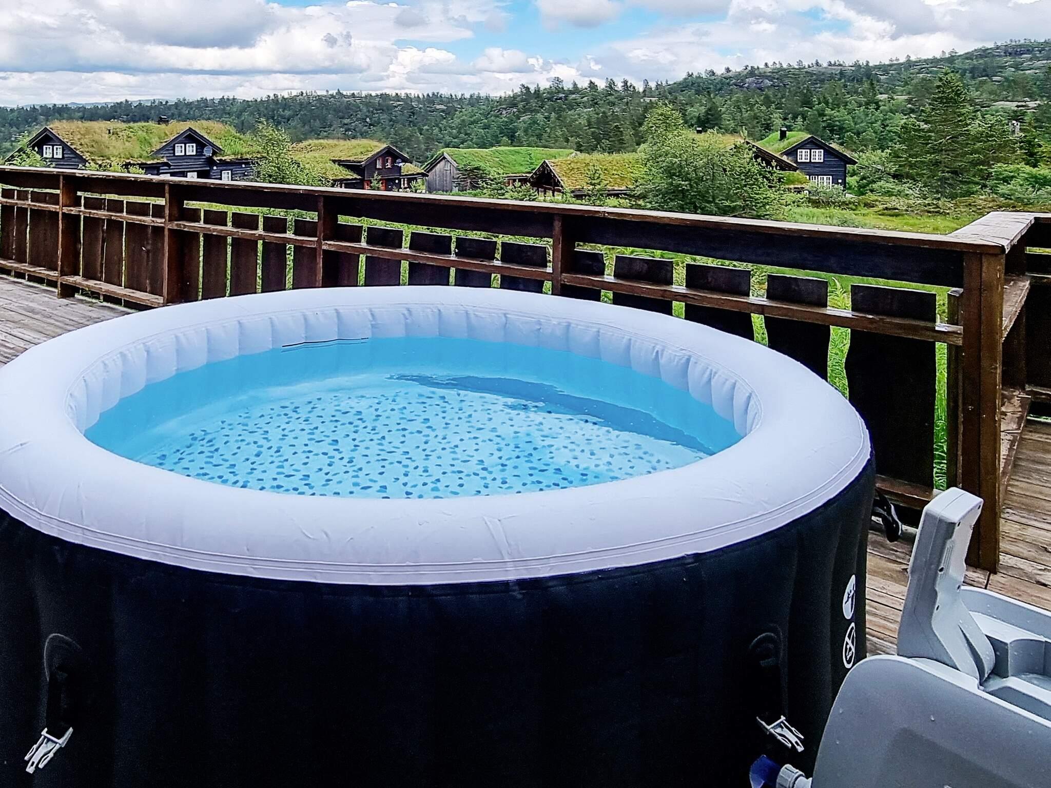 Romslig flott terrasse med boblebad - her er det deilig å sitte seg ned etter en lang dag på fjellet. Det er ikke andre hytter rett foran denne, så der er det god boltreplass til barn.
