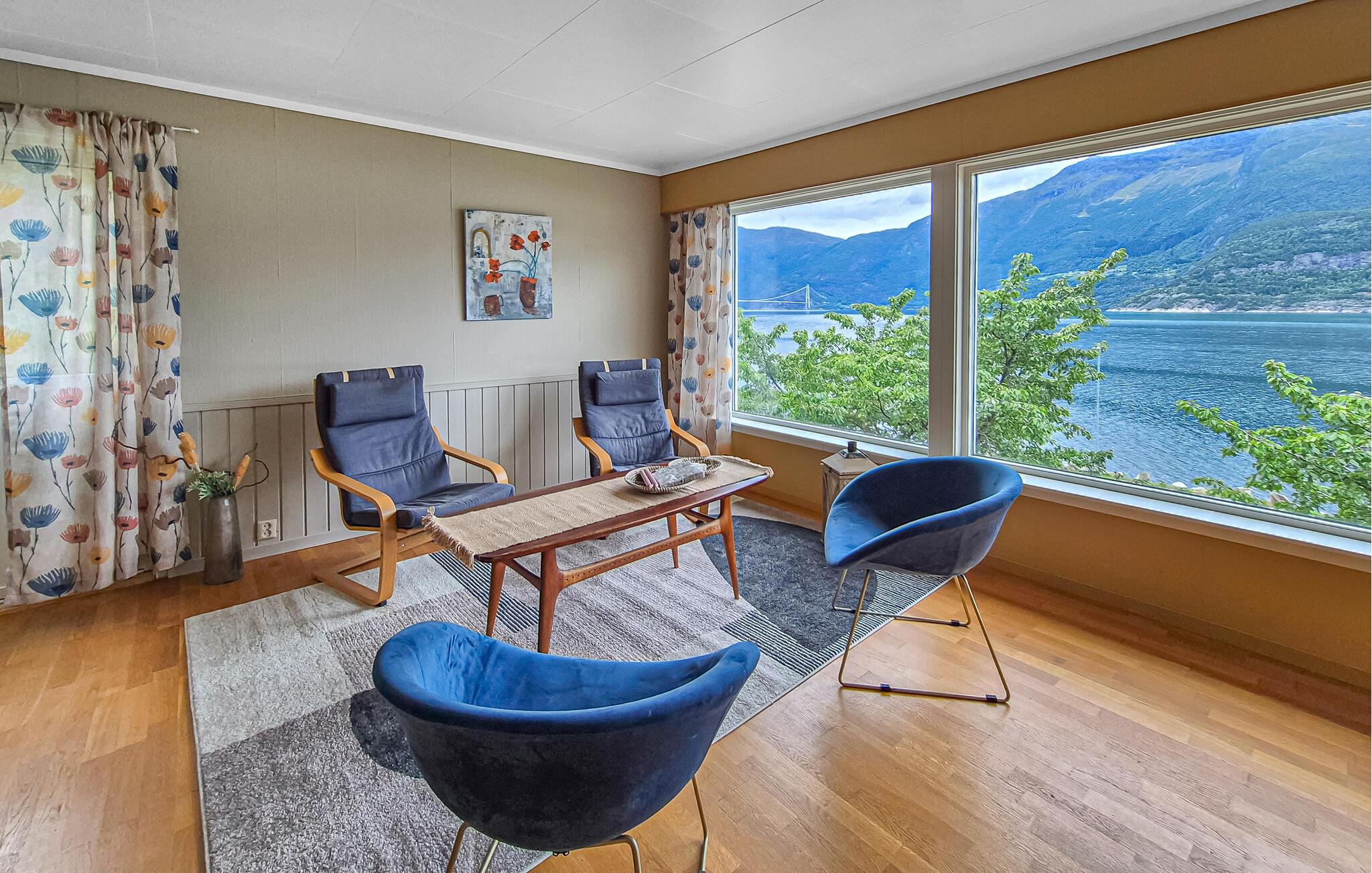 Dette hyggelige hus er det ideelle tilflugtssted for en afslappende pause fra hverdagen. Nyd udsigten gennem de store panoramavinduer, mens I tilbringer tid sammen i den lyse opholdsstue. De hyggelige møbler med komfortable lænestole, sofaer og en brændeovn lægger op til at slappe af og koble fra. Efter en dag udendørs kan I tænde brændeovnen og nyde en afslappende filmaften.