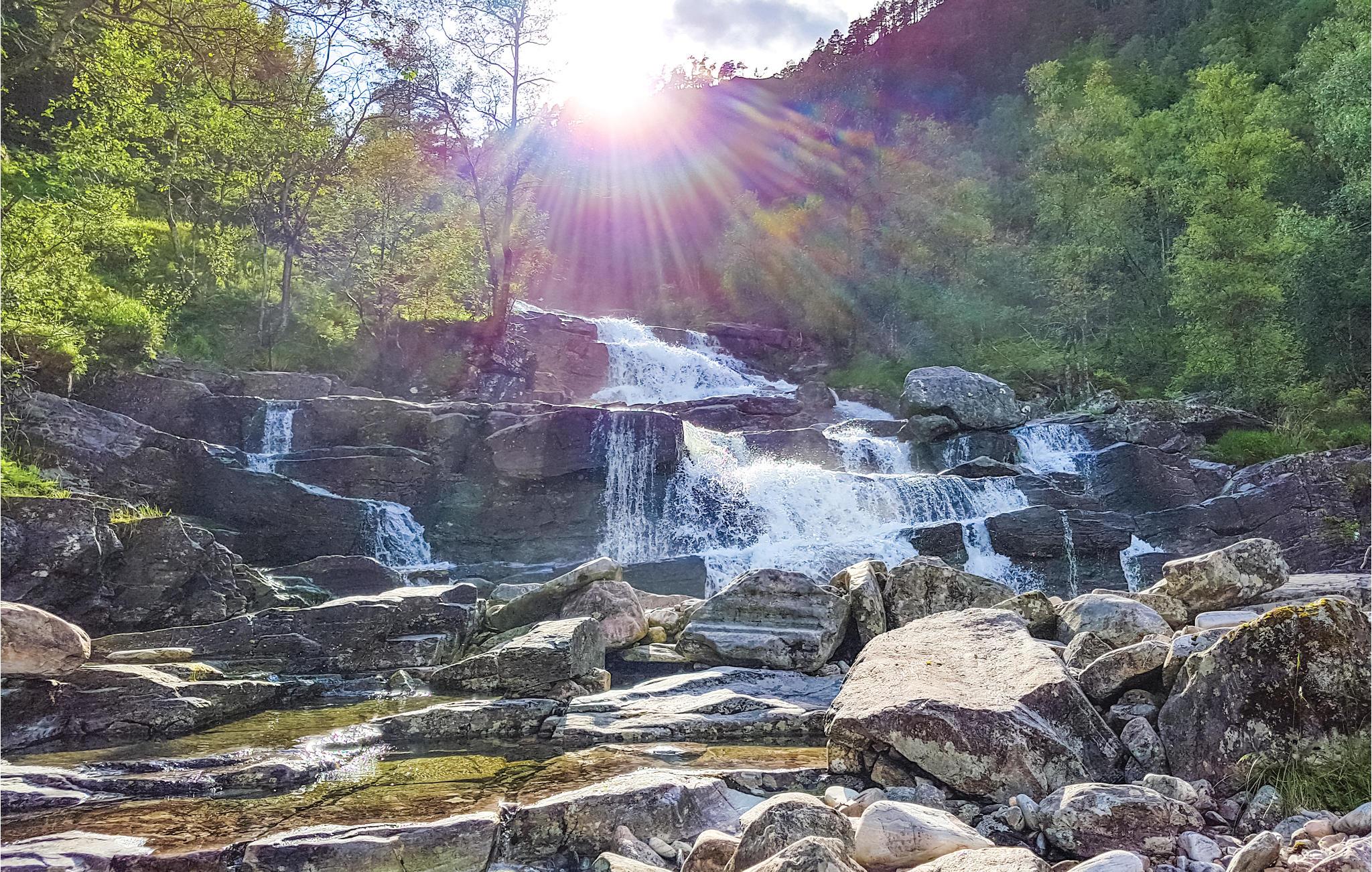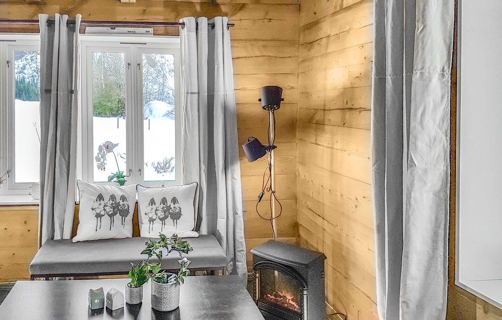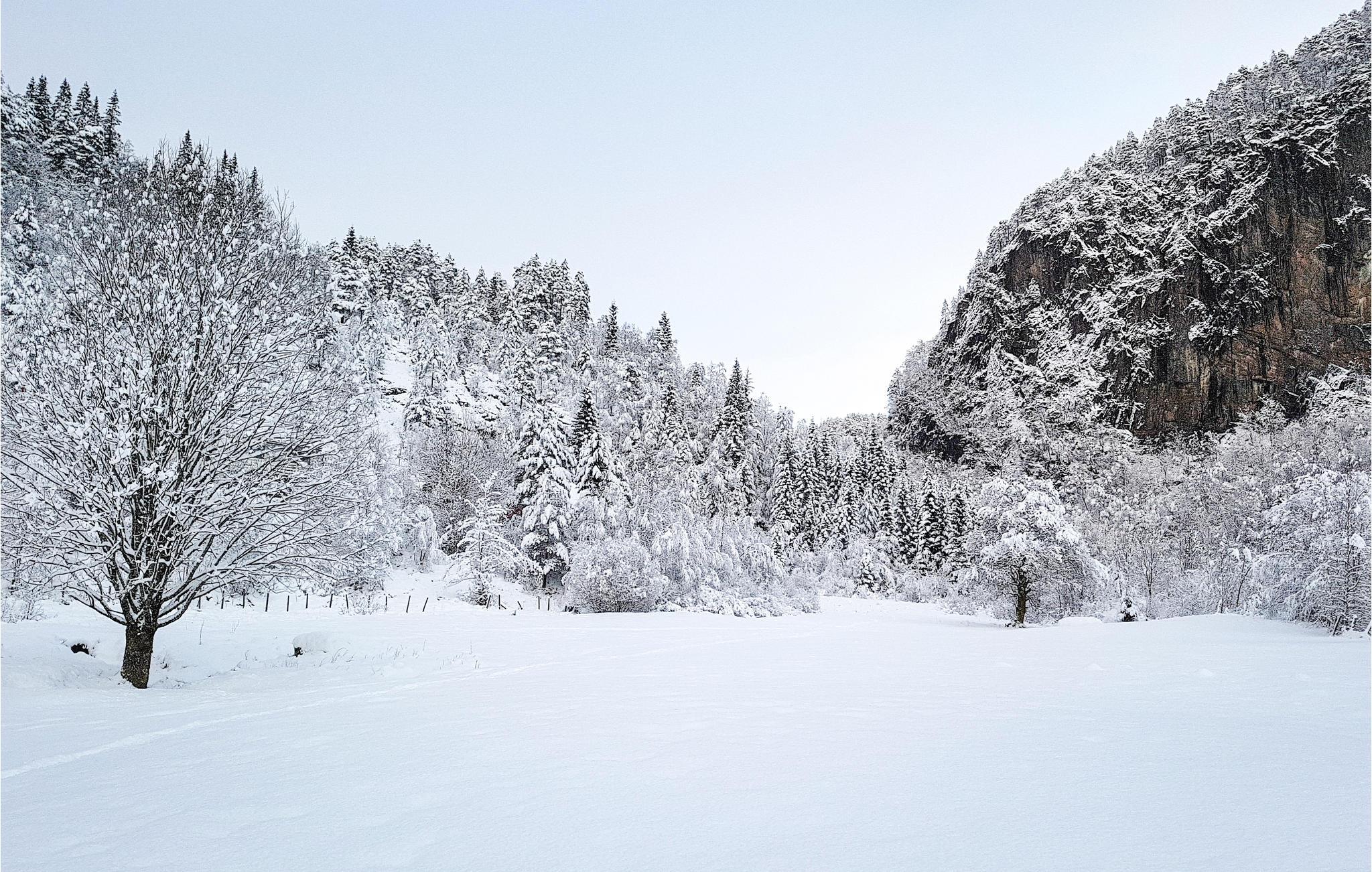 Dette giver huset en meget charmerende og næsten magisk atmosfære. Det ligger i lige så specielle omgivelser - lige midt mellem fjelde og en god fiskeelv. I elven er der fanget laks på over ti kilo. Der stilles ikke krav om fiskekort. De stejle fjelde er et yndet mål for erfarne klatrere om sommeren. Husets ejer har en sæter på fjeldet, som I kan benytte. Den ligger ca. en times vandring fra huset.
