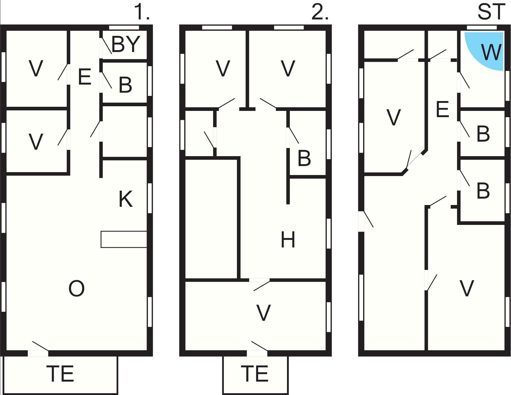 7 Soveværelser: (1DS)+(1S)+(2S)+(1DS)+(1DS)+(1DS+1S)+(1DS+1S), barneseng og høj stol