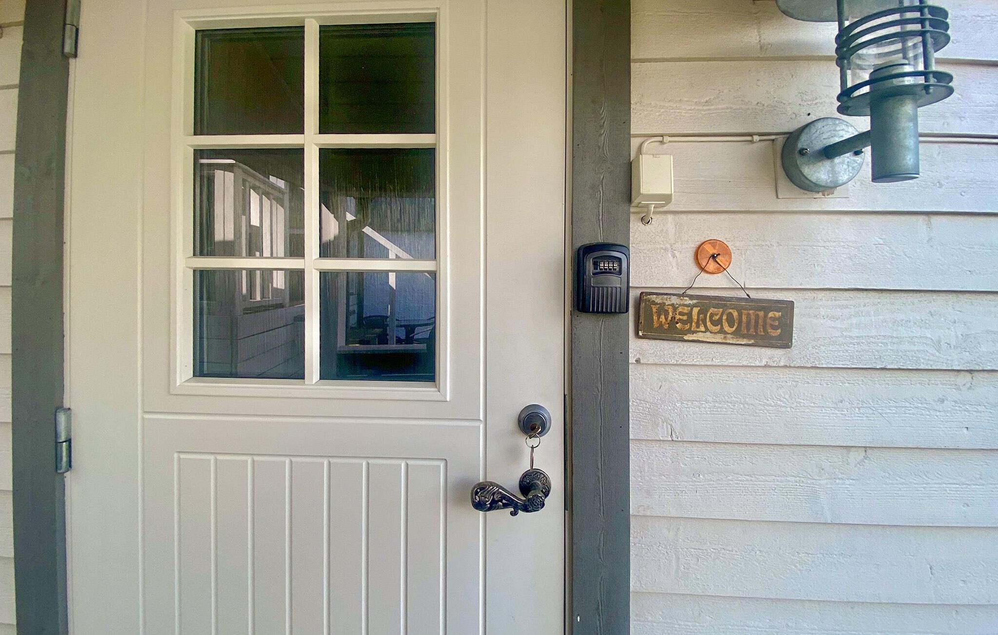 Parker ca. 50 meter fra huset. Det er en stejl bakke op til huset.