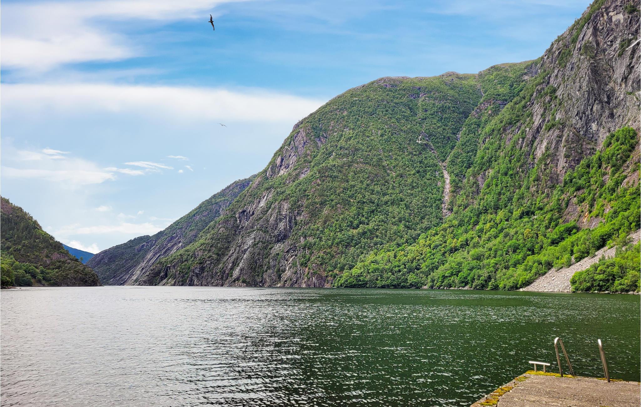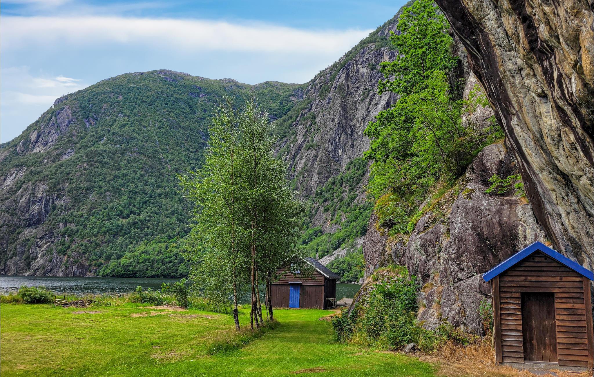 Denne rummelige hytte ligger på bredden af den vilde Åkrafjord, omkranset af de majestætiske stejle bjerge i Folgefonna Nationalpark. Et sted, der i den grad inviterer til en sanselig naturferie. Det tidligere bondehus med egen anløbsbro er perfekt til den større gruppe, som vil udforske Folgefonna Nationalpark. Her finder I alt, hvad I har brug for til en ubekymret ferie. Sæt jer godt til rette i den grå hjørnesofa efter en lang dag og spil en omgang Uno. Om aftenen kan I grille jeres friskfangede fisk fra fjorden eller den nærliggende elv og nyde solnedgangen på terrassen med et glas vin. Fra jeres helt egen private strandlinje har I en betagende udsigt over den smalle, smaragdgrønne fjord. Her kan I fiske hele dagen, men husk at holde en pause, for det friske fjordvand egner sig også perfekt til en svømmetur.