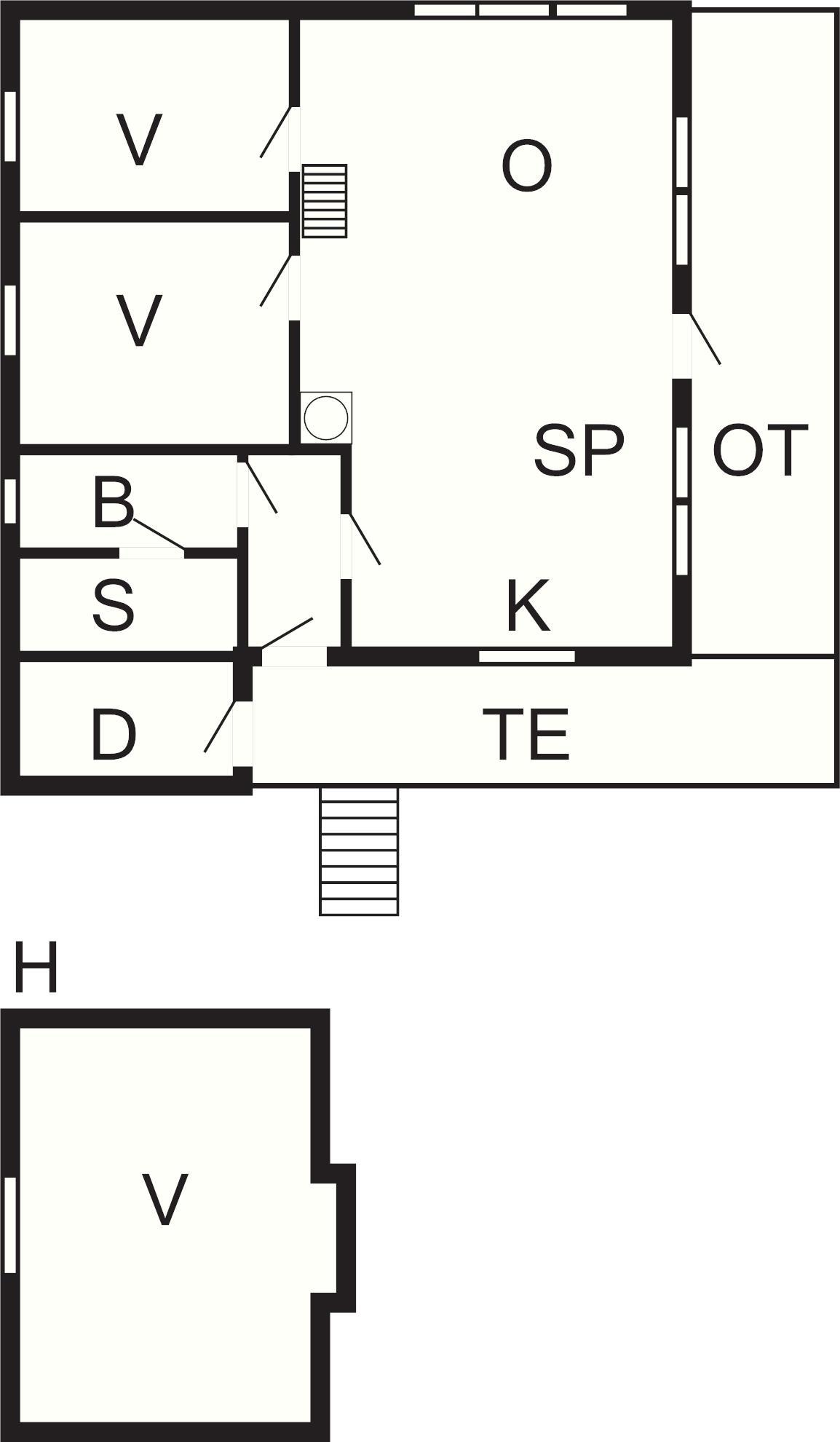 Stor og romslig stue med kjøkkenavdeling. Sauna, 4-6 personer. 20 kvm delvis overbygd terrasse mot fjorden. TV: SmartTV+/Apple TV, norske, nordiske, tyske og europeiske TV-kanaler. Internett 100 Mbits. Køyeseng med 120 cm bredde nede og 75 cm bredde oppe. Hems for den spreke med to lave 90 cm brede senger, gode madrasser. Bratt stige opp til hemsen. Langgrunn sandstrand 60 m.