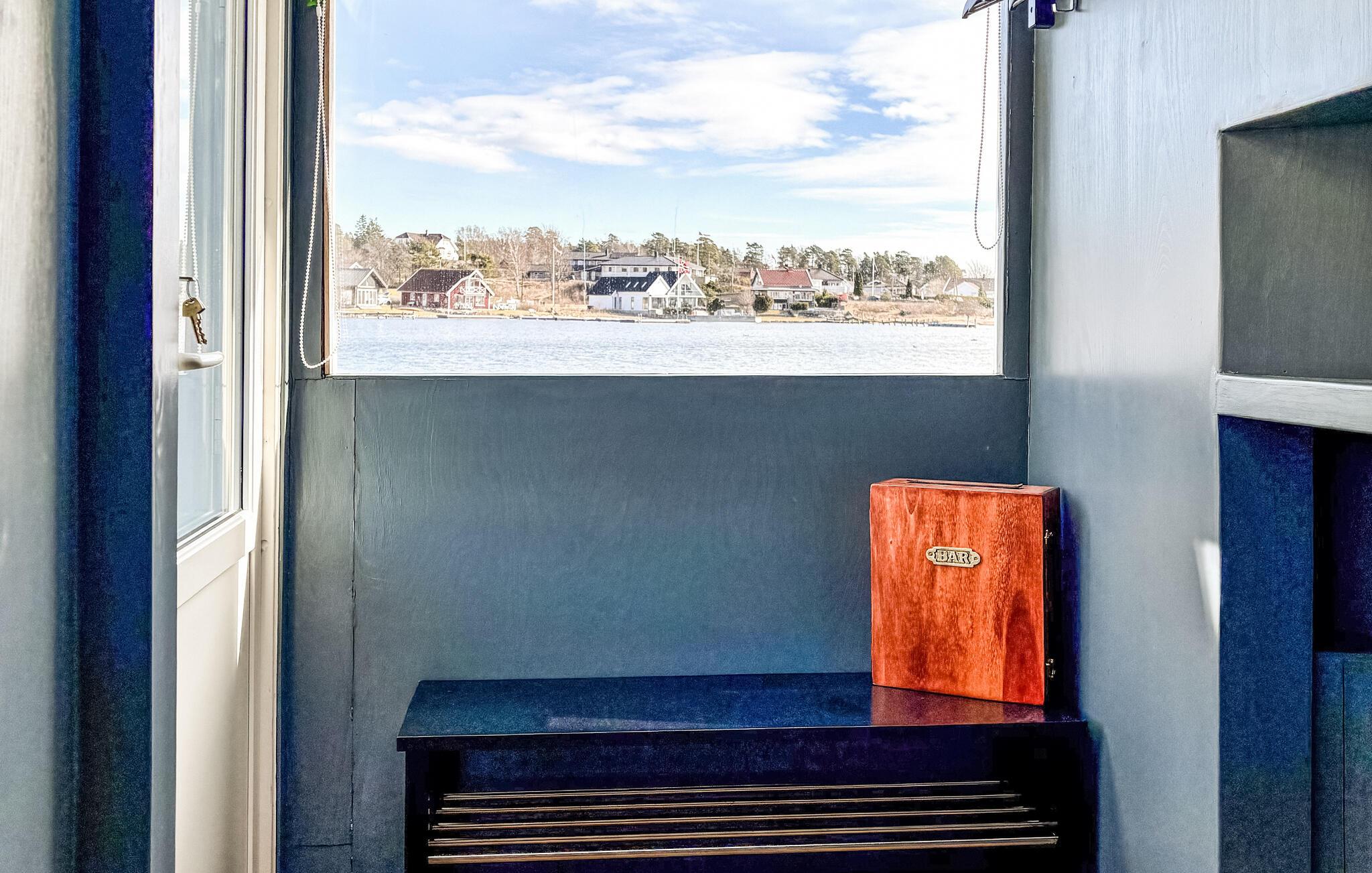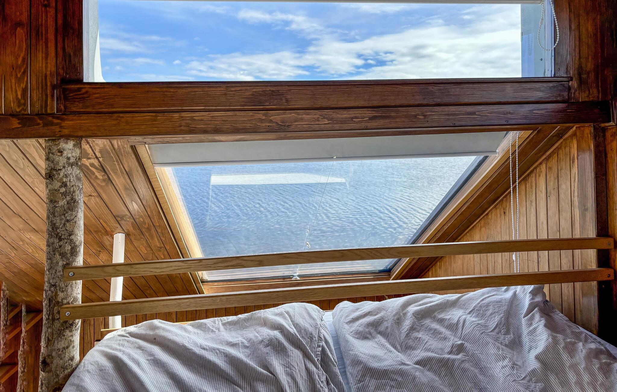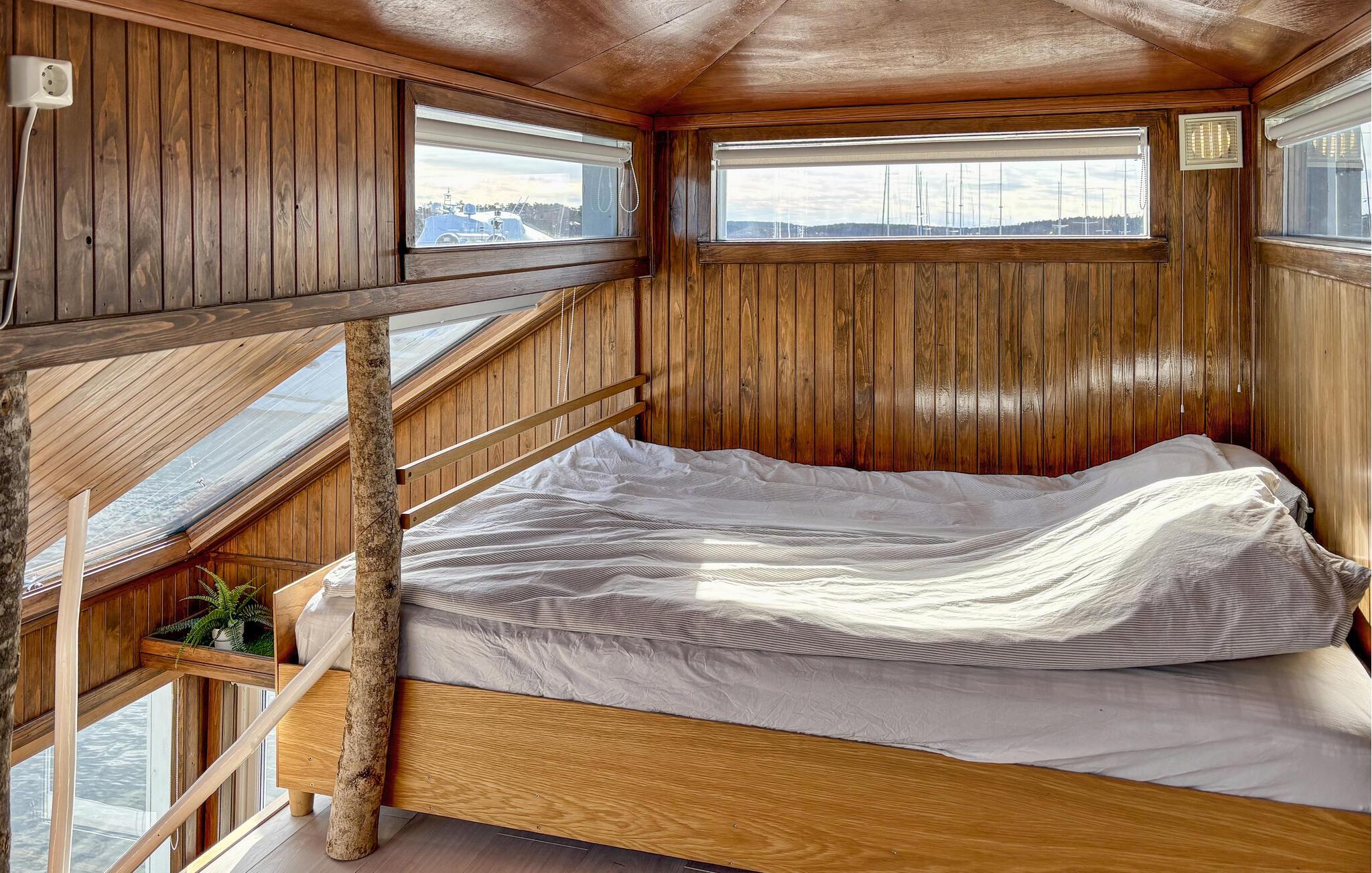 Oplev et hyggeligt, nautisk inspireret interiør med varme trædetaljer og store vinduer. Sæt jer godt til rette i sofaen og nyd vandet. Tilbered måltider i det åbne køkken, og saml jer omkring spiseområdet med barstole. Udnyt de mange siddepladser til at slappe af sammen. Åbn døren til soveområdet og nyd den direkte udsigt over fjorden direkte fra jeres seng.