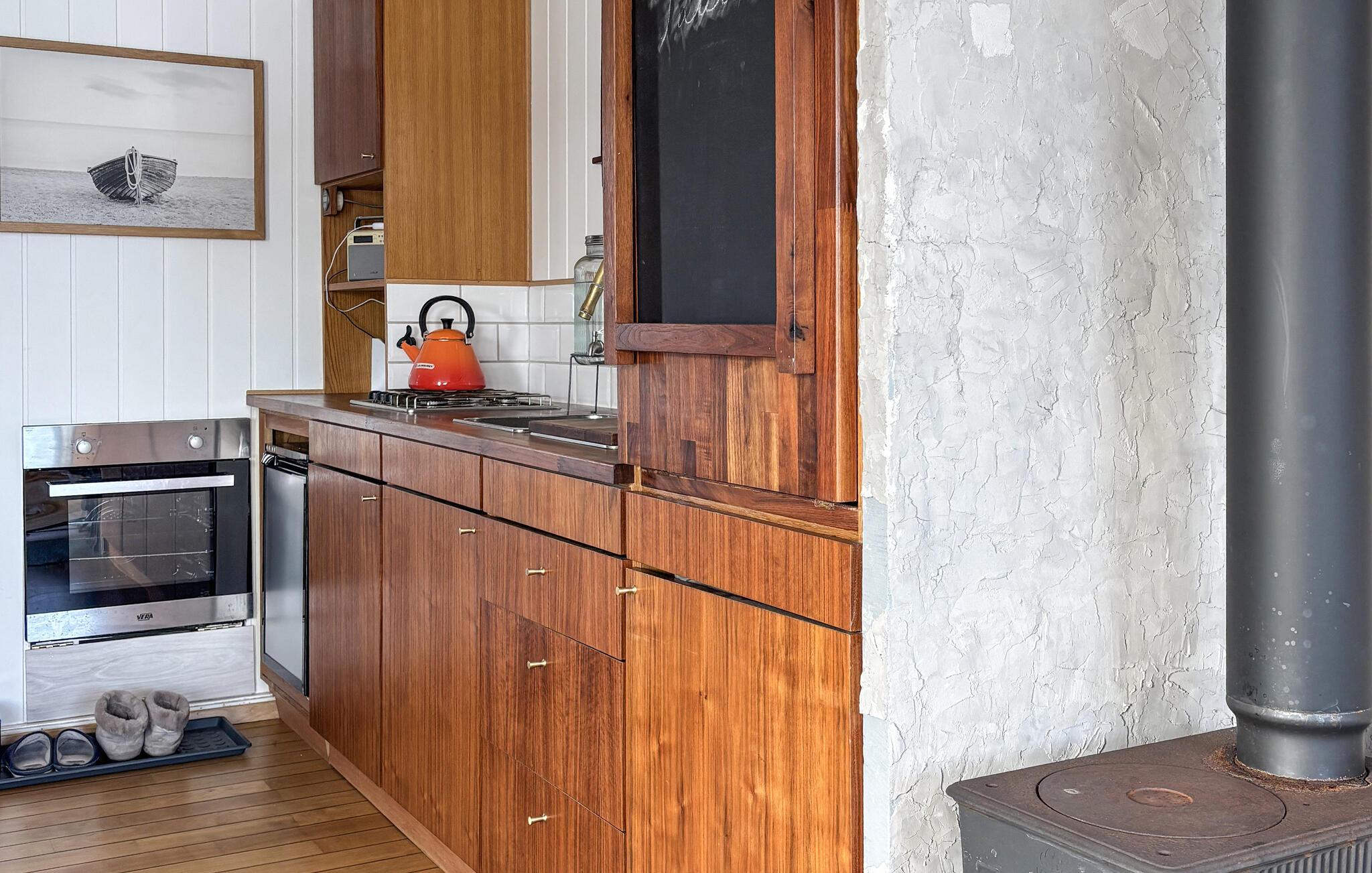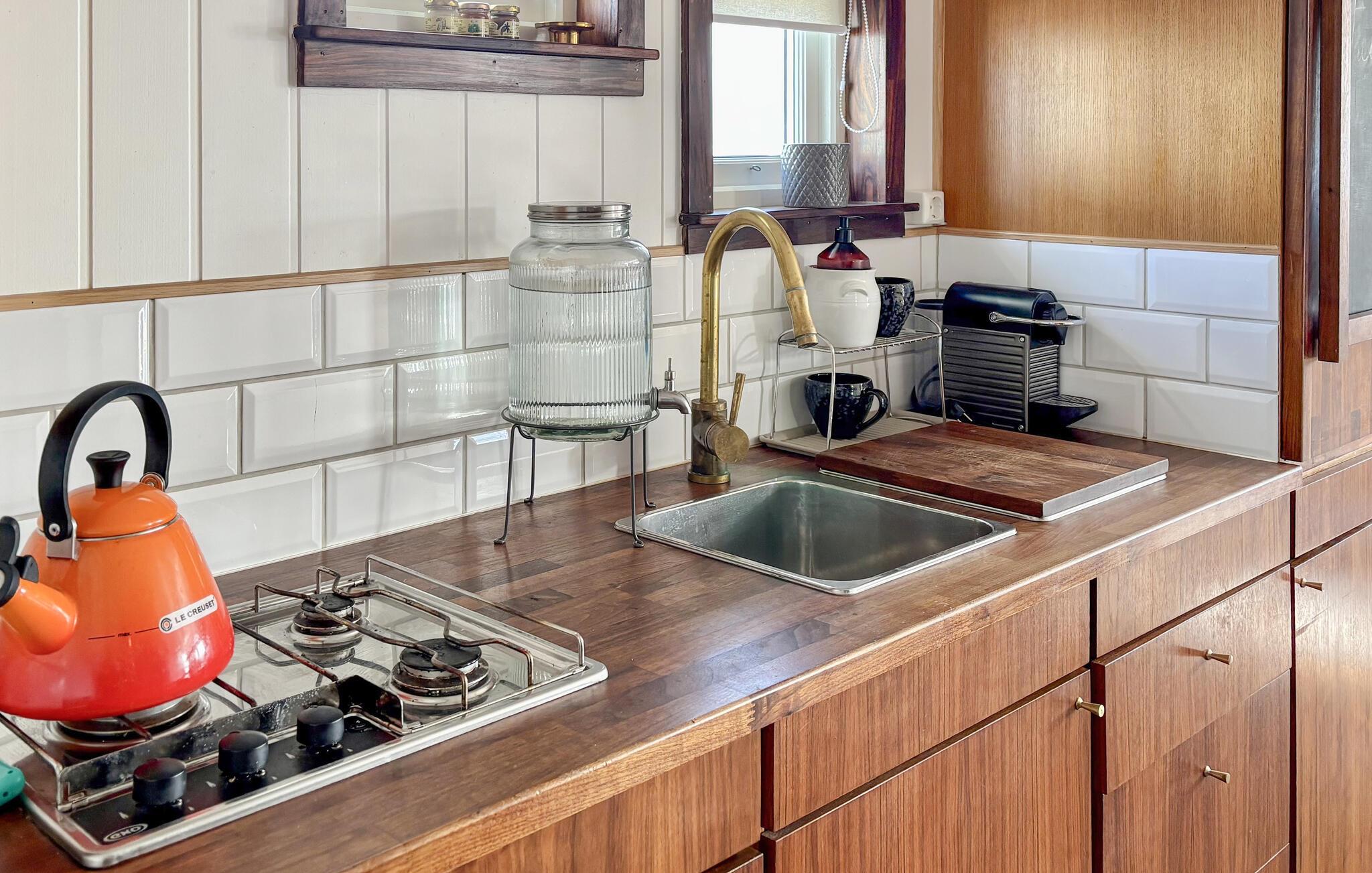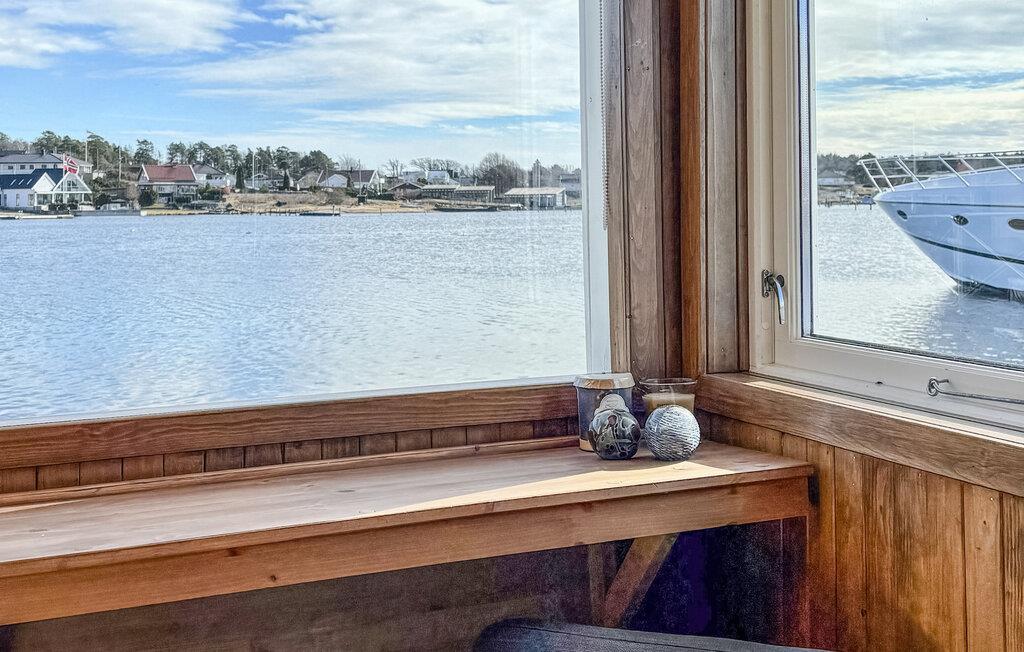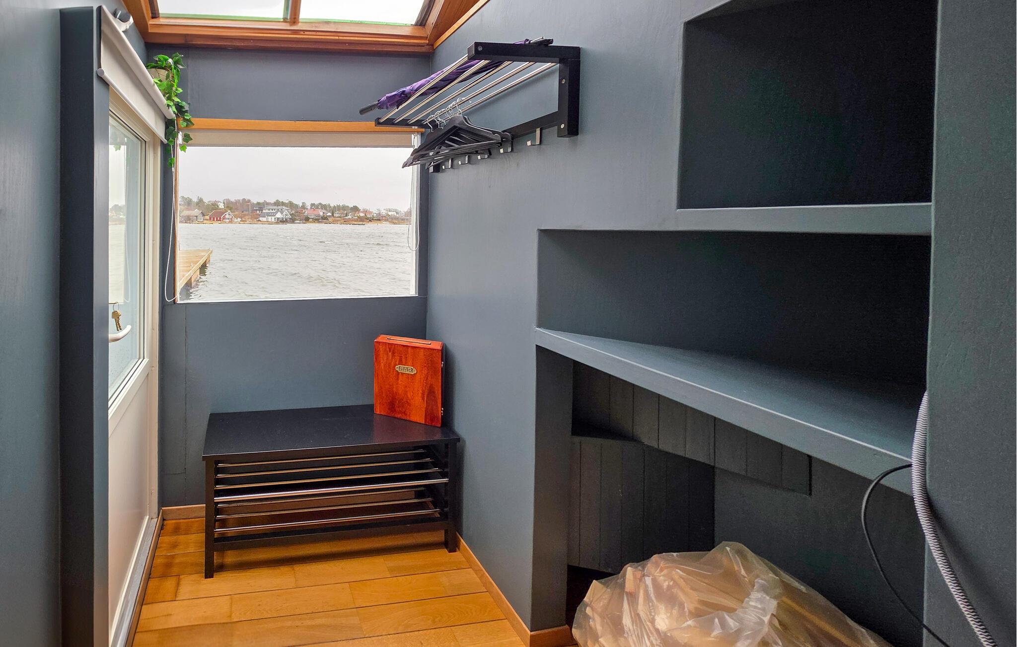 Oplev et hyggeligt, nautisk inspireret interiør med varme trædetaljer og store vinduer. Sæt jer godt til rette i sofaen og nyd vandet. Tilbered måltider i det åbne køkken, og saml jer omkring spiseområdet med barstole. Udnyt de mange siddepladser til at slappe af sammen. Åbn døren til soveområdet og nyd den direkte udsigt over fjorden direkte fra jeres seng.