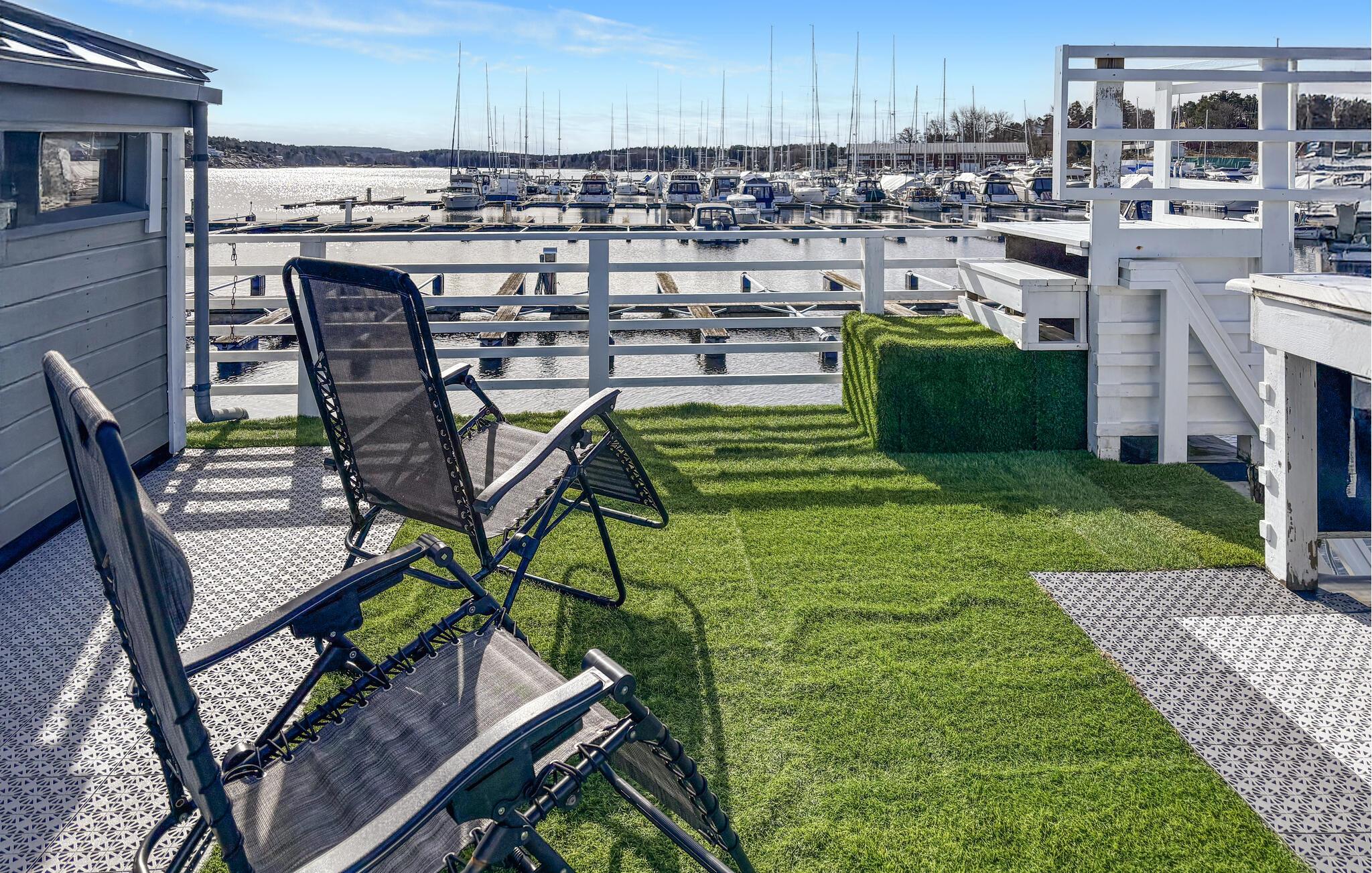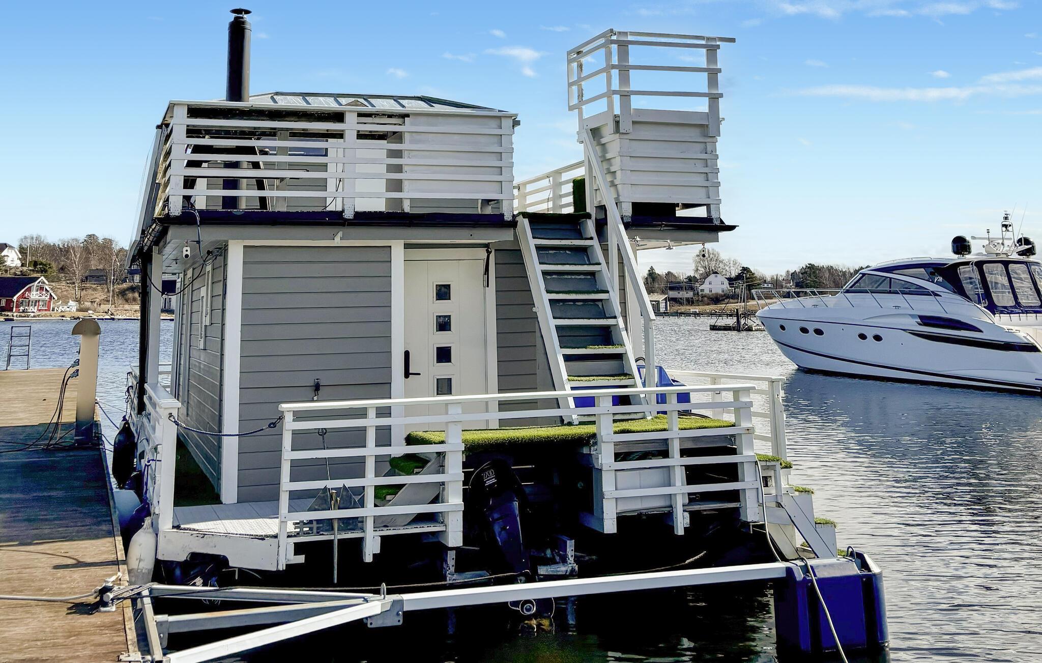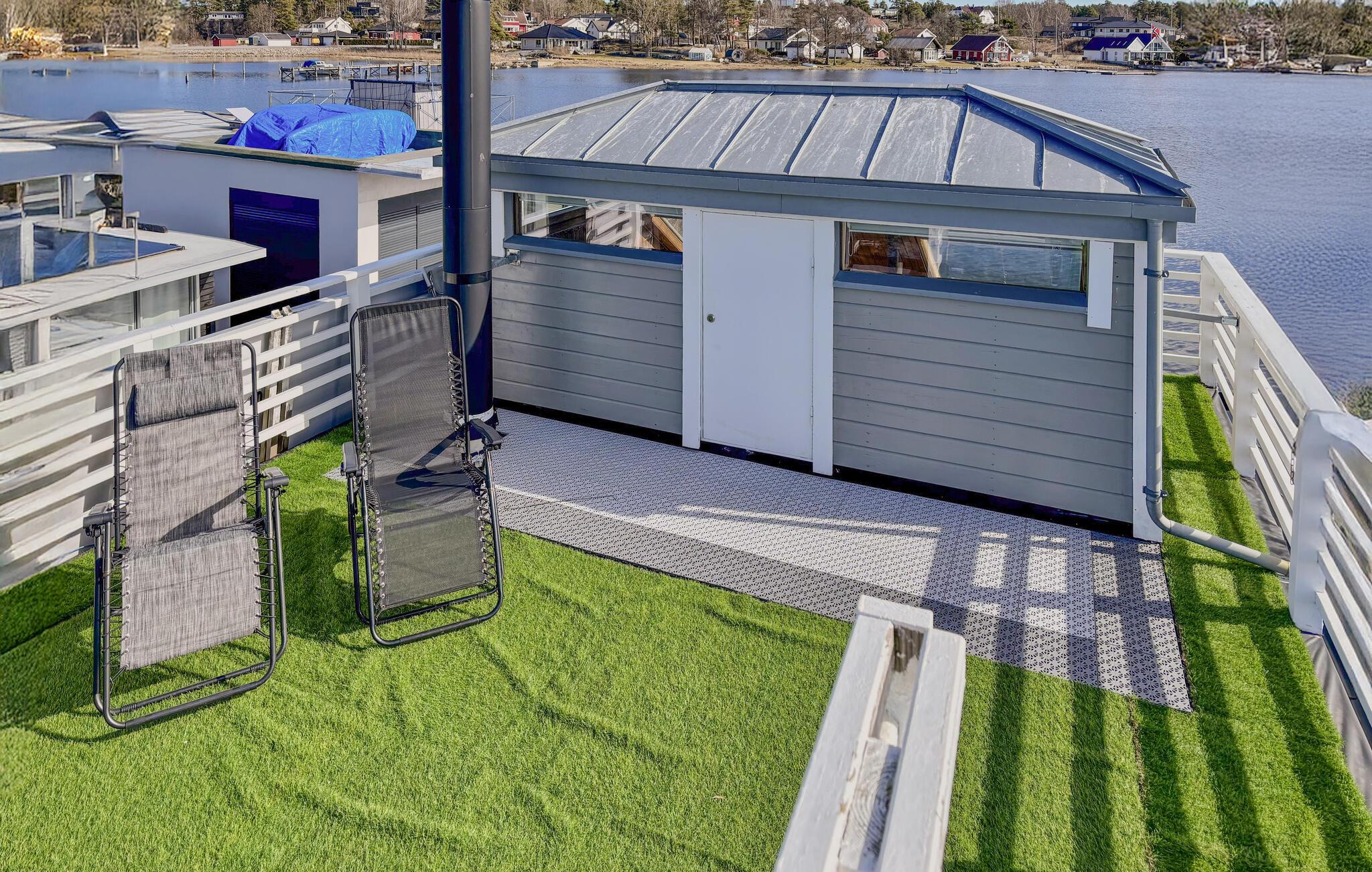 Træd udenfor, og oplev den unikke charme ved denne husbåd. Fra soveværelset kan I gå direkte ud på tagterrassen, og starte dagen i den friske luft. Slap af på liggestolene, saml jer omkring bordet eller tilbered et måltid på grillen. Nyd den rolige beliggenhed ved vandet, og se aktiviteten i havnen. Eller tag en forfriskende morgendukkert i fjorden.